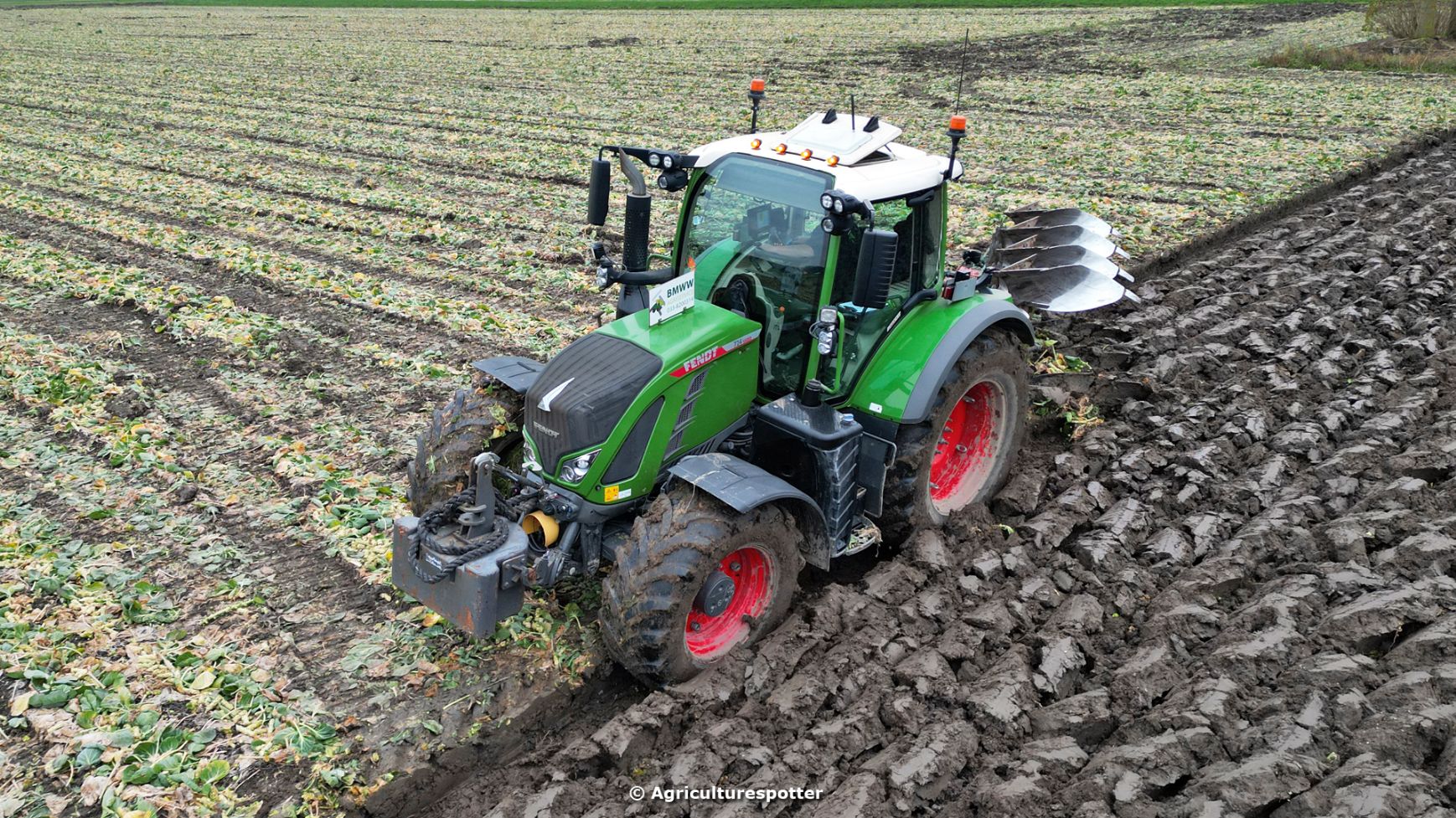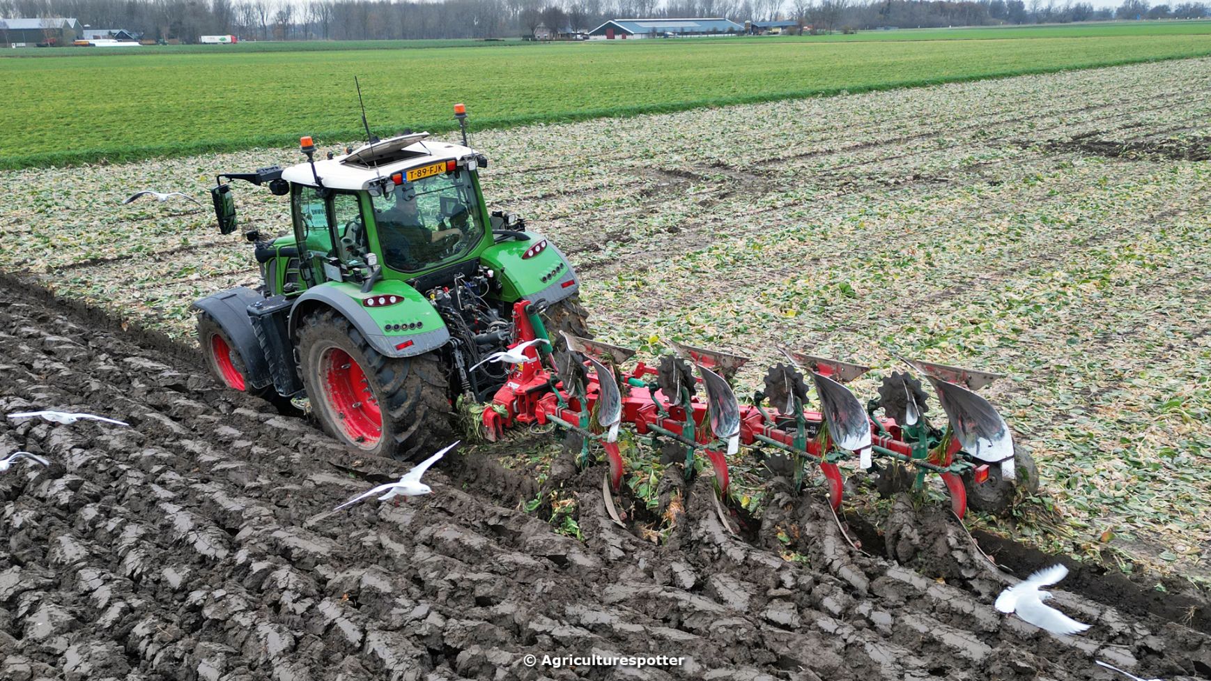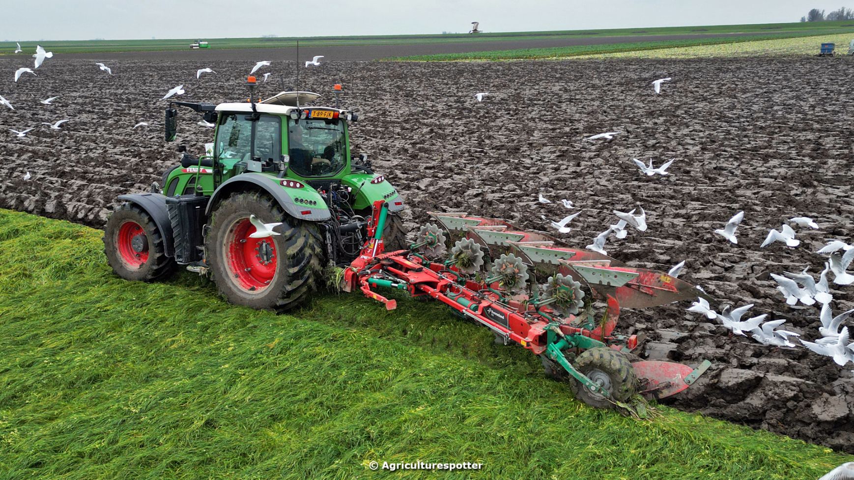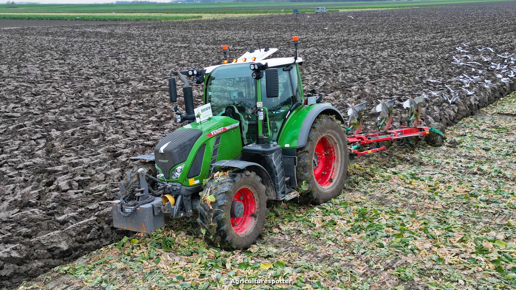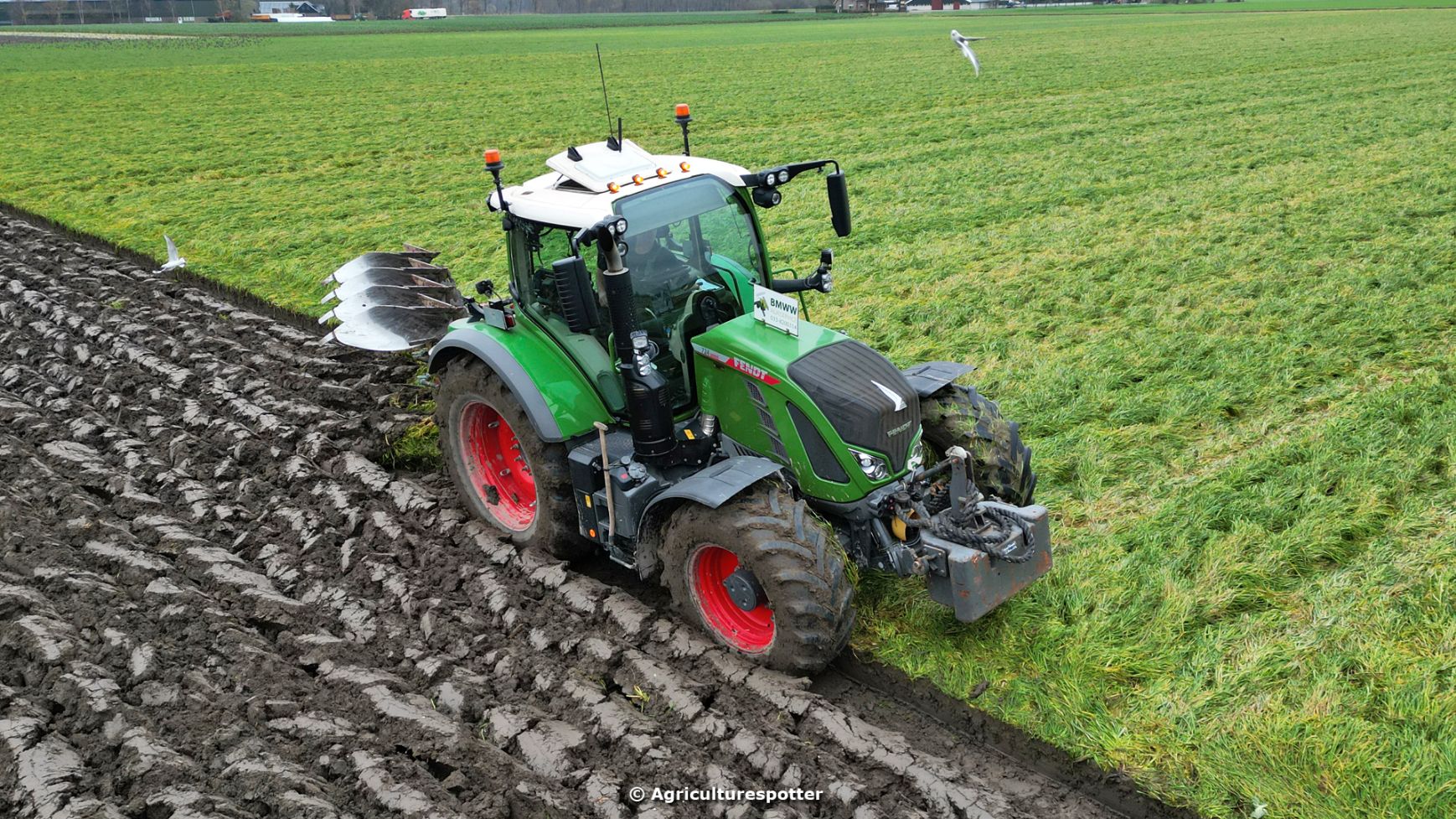 Ploegen met een Fendt 724 Vario en een Kverneland EG 100 4-schaar wentelploeg, van loonbedrijf BMWW Agriservice, in de zware klei bij Zeewolde in de Flevopolder.