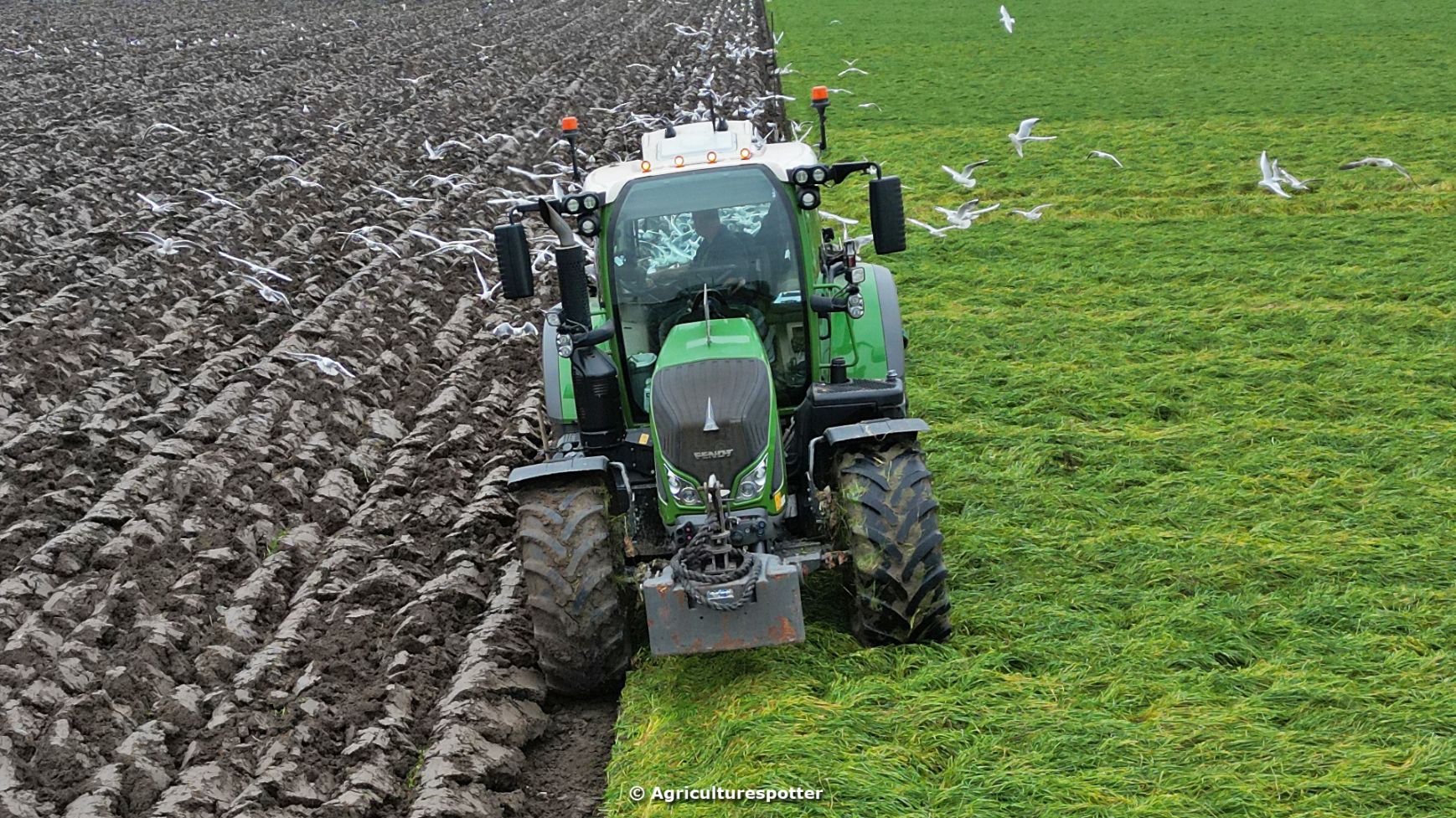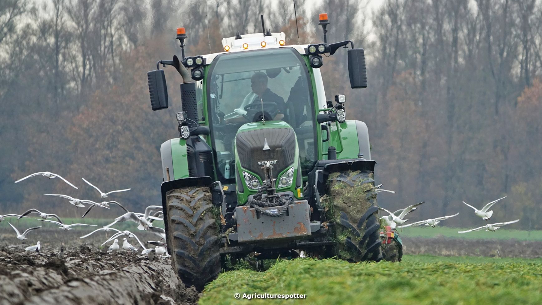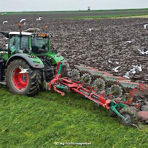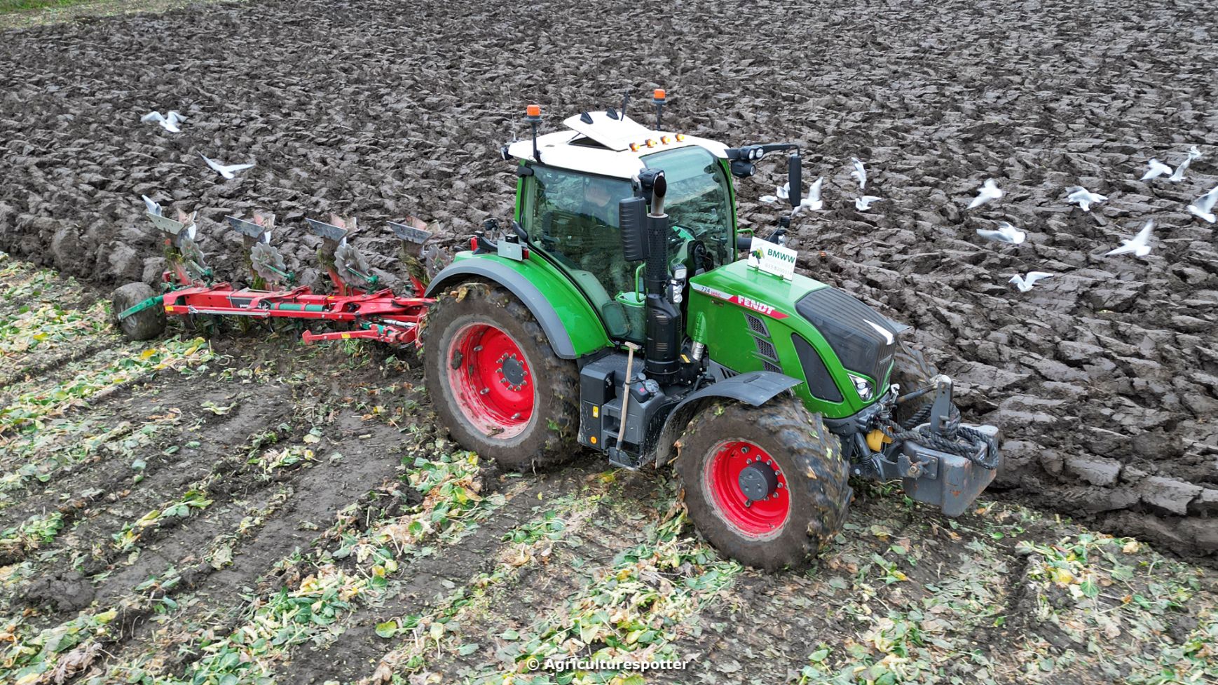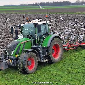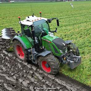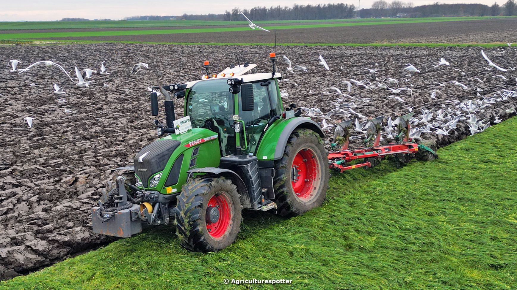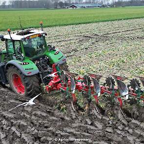 Ploegen met een Fendt 724 Vario en een Kverneland EG 100 4-schaar wentelploeg, van loonbedrijf BMWW Agriservice, in de zware klei bij Zeewolde in de Flevopolder.