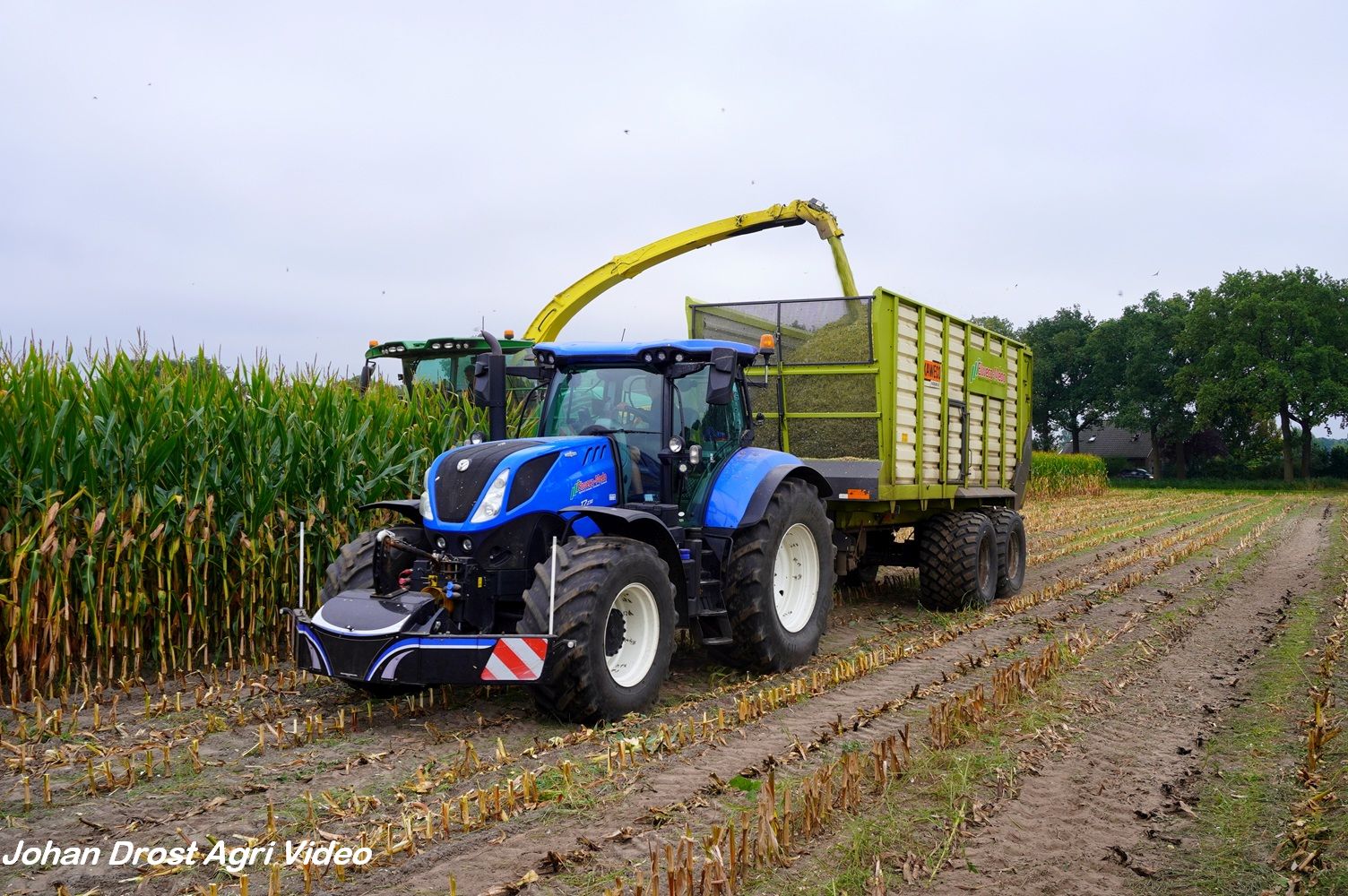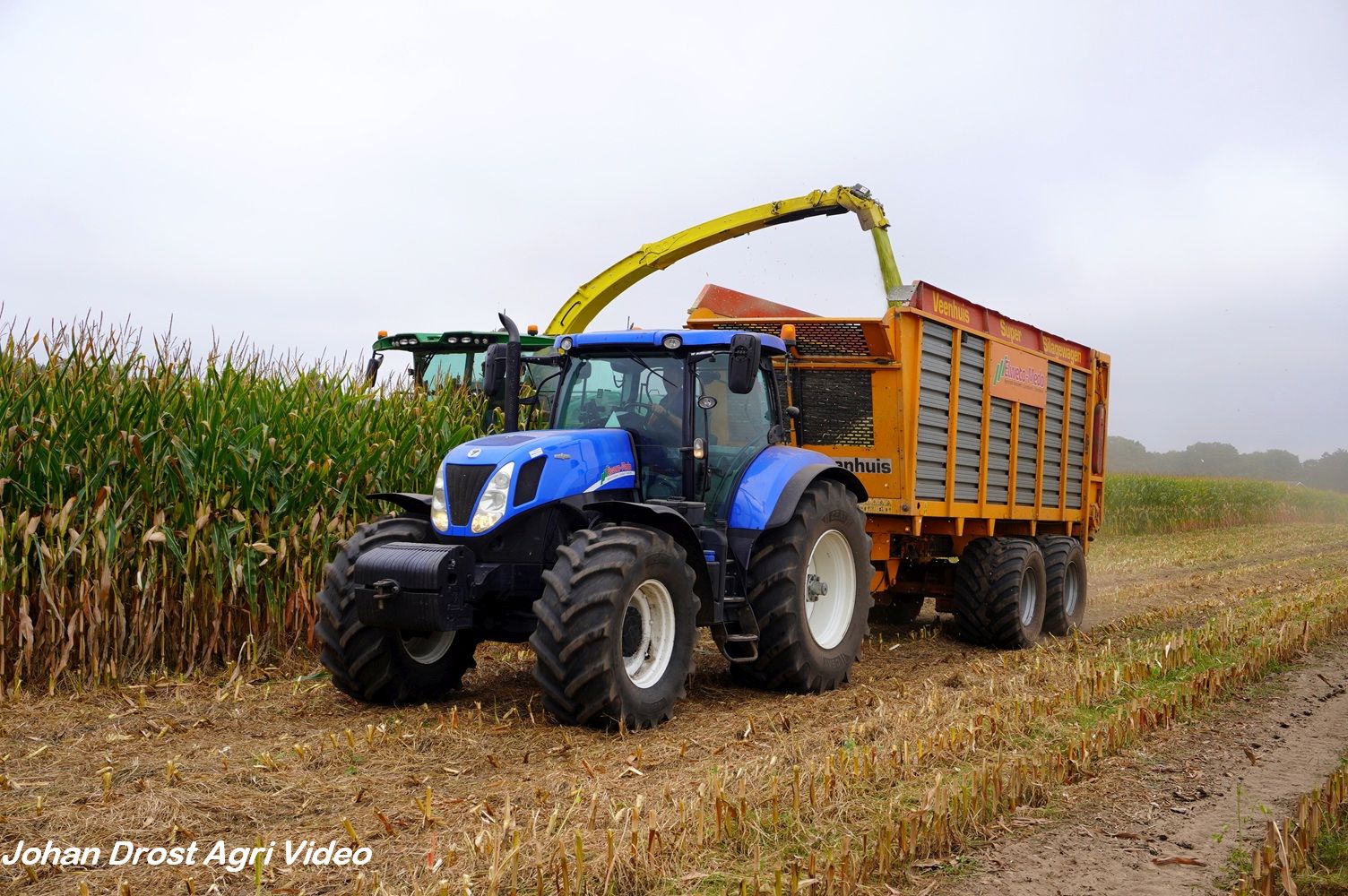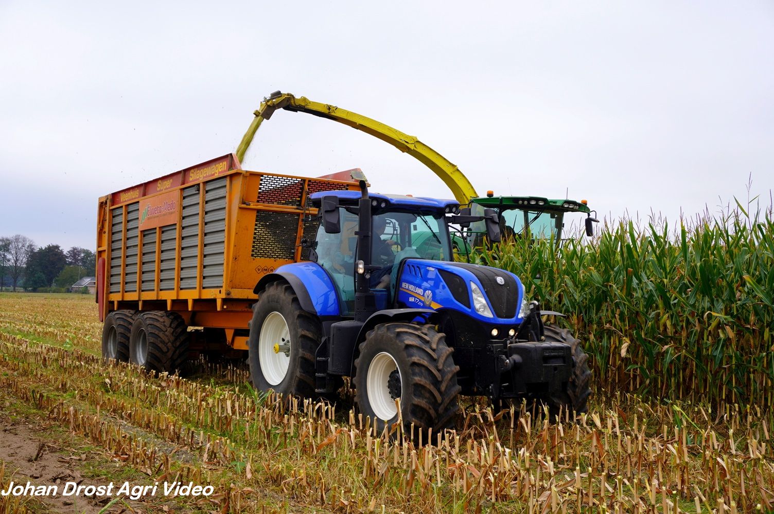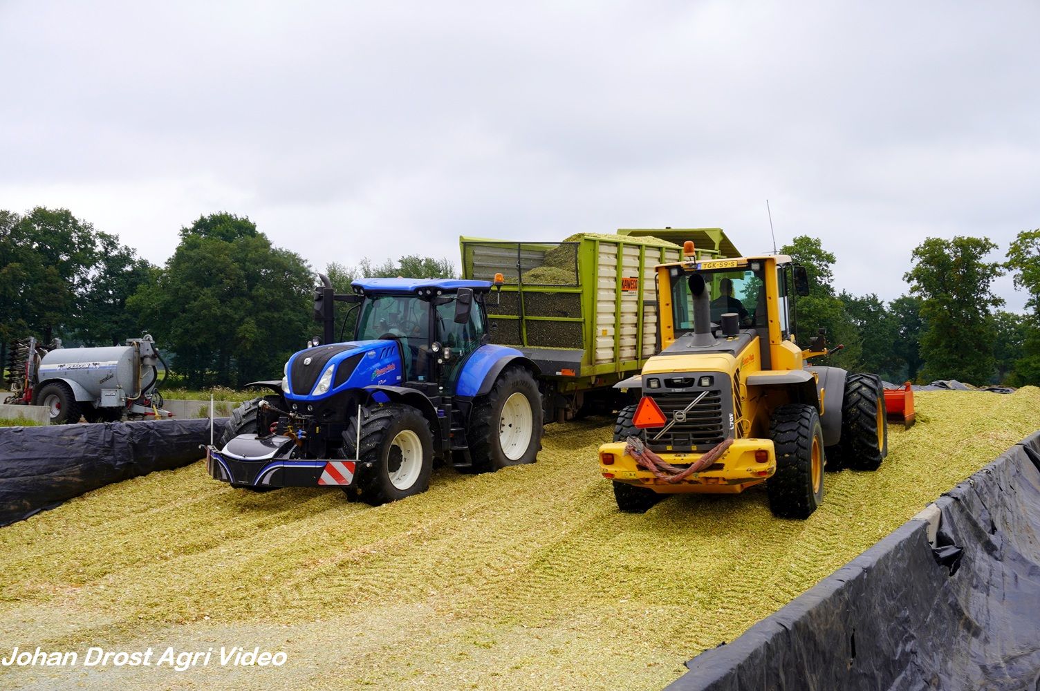 Loonbedrijf Elweco-Medo uit Laren (GD) aan het maïs hakselen met een John Deere 8600i, New Holland T7.230 met Kaweco Radium 45, New Holland T7.270 en New Holland met Veenhuis. Op de kuil een Volvo L70H.