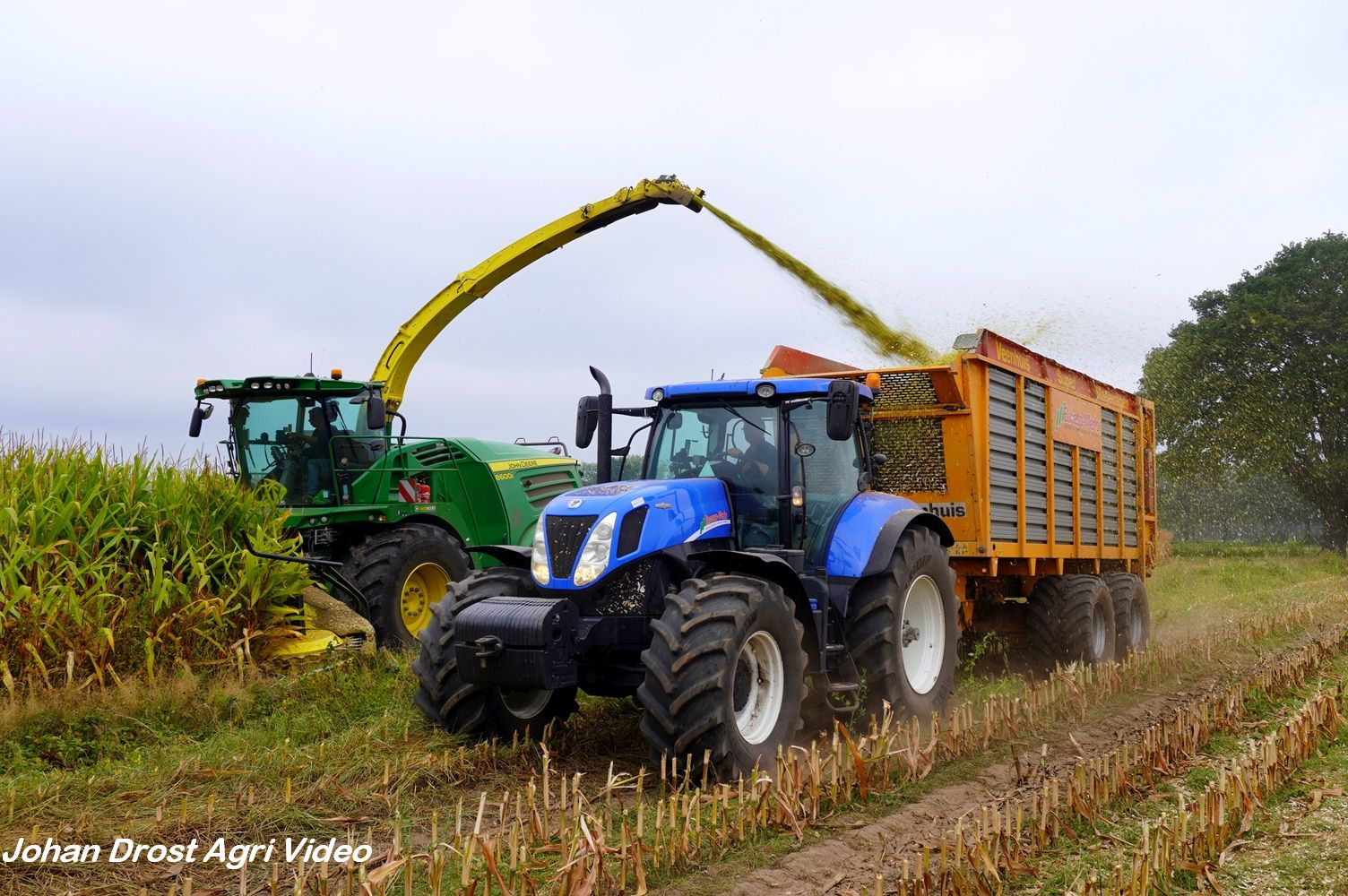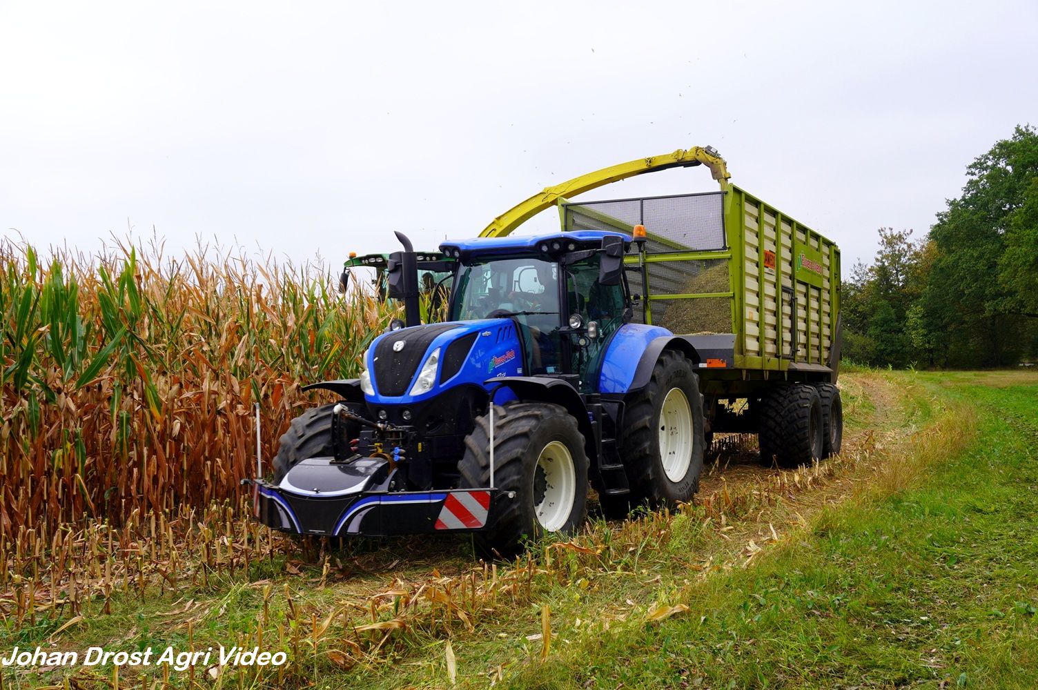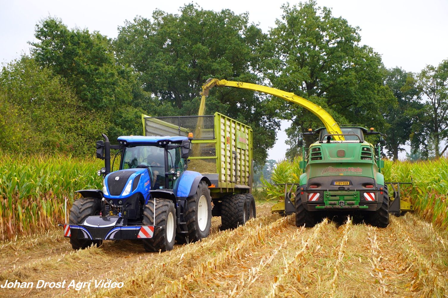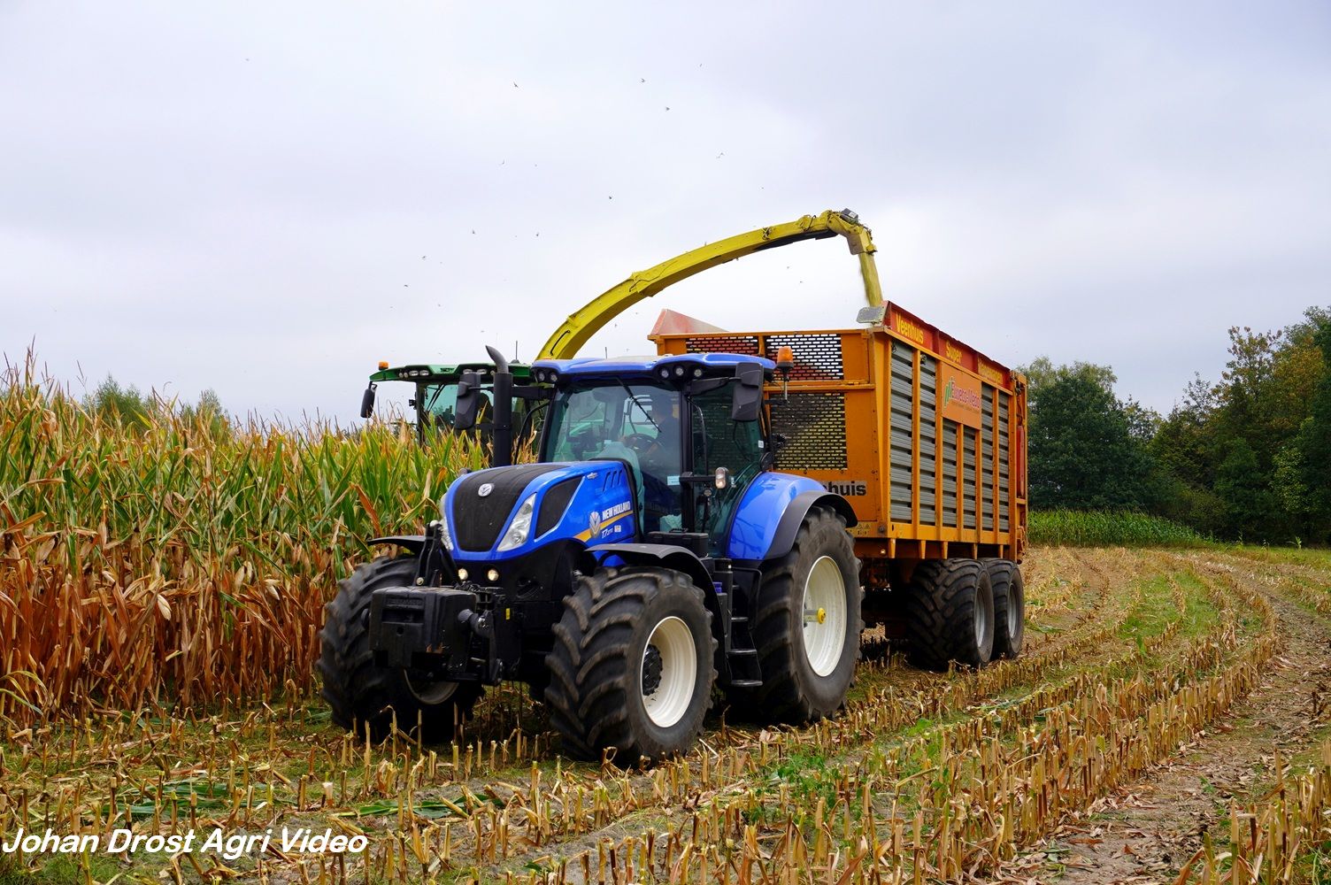 Loonbedrijf Elweco-Medo uit Laren (GD) aan het maïs hakselen met een John Deere 8600i, New Holland T7.230 met Kaweco Radium 45, New Holland T7.270 en New Holland met Veenhuis. Op de kuil een Volvo L70H.