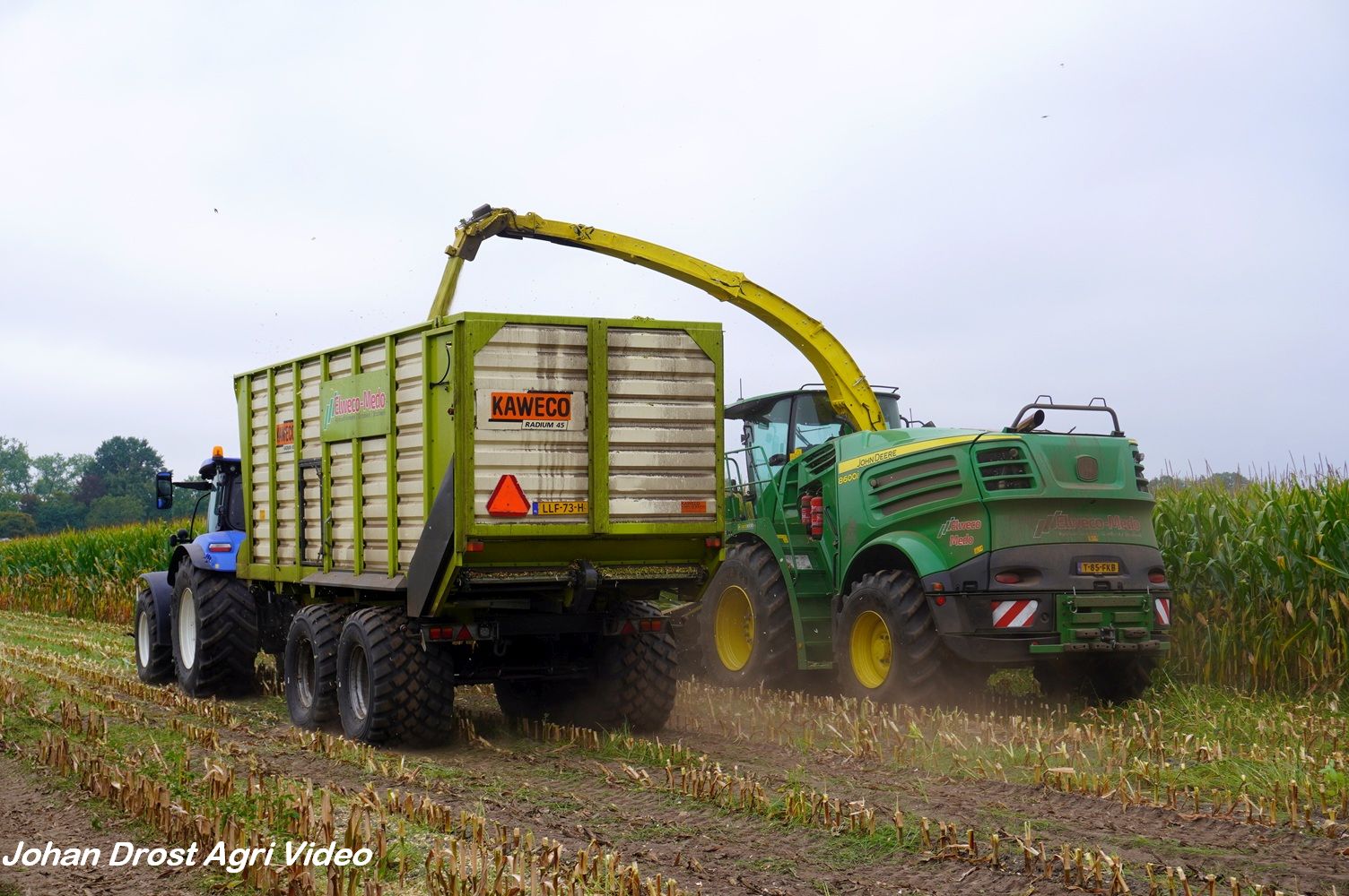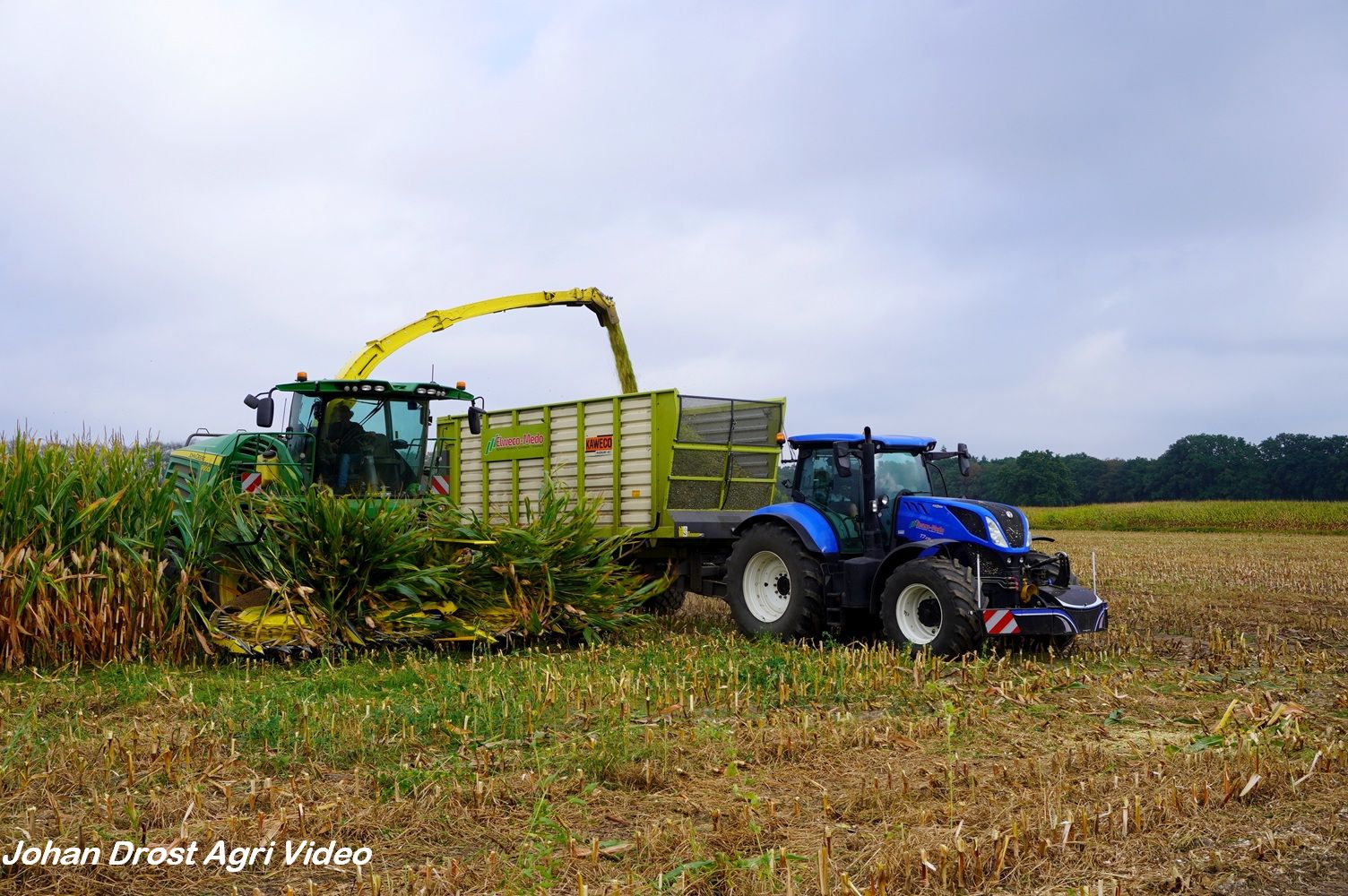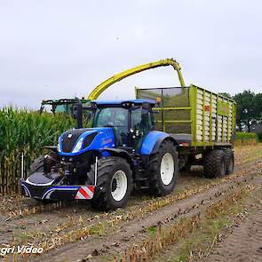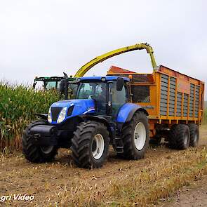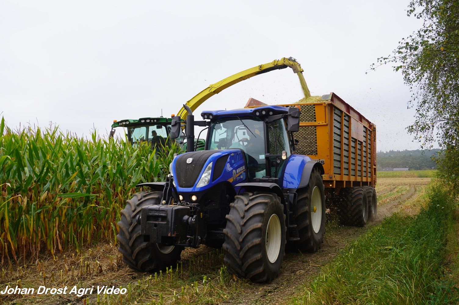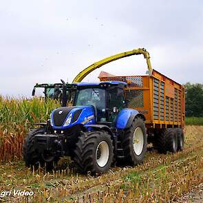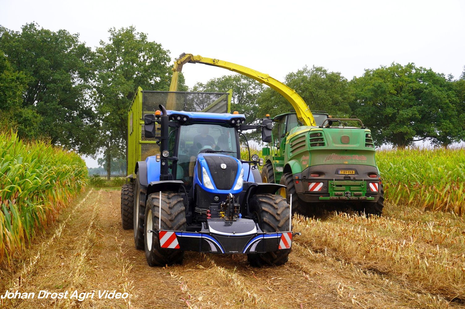 Loonbedrijf Elweco-Medo uit Laren (GD) aan het maïs hakselen met een John Deere 8600i, New Holland T7.230 met Kaweco Radium 45, New Holland T7.270 en New Holland met Veenhuis. Op de kuil een Volvo L70H.