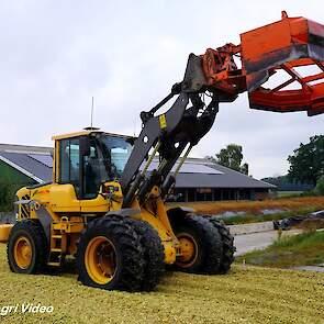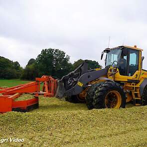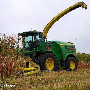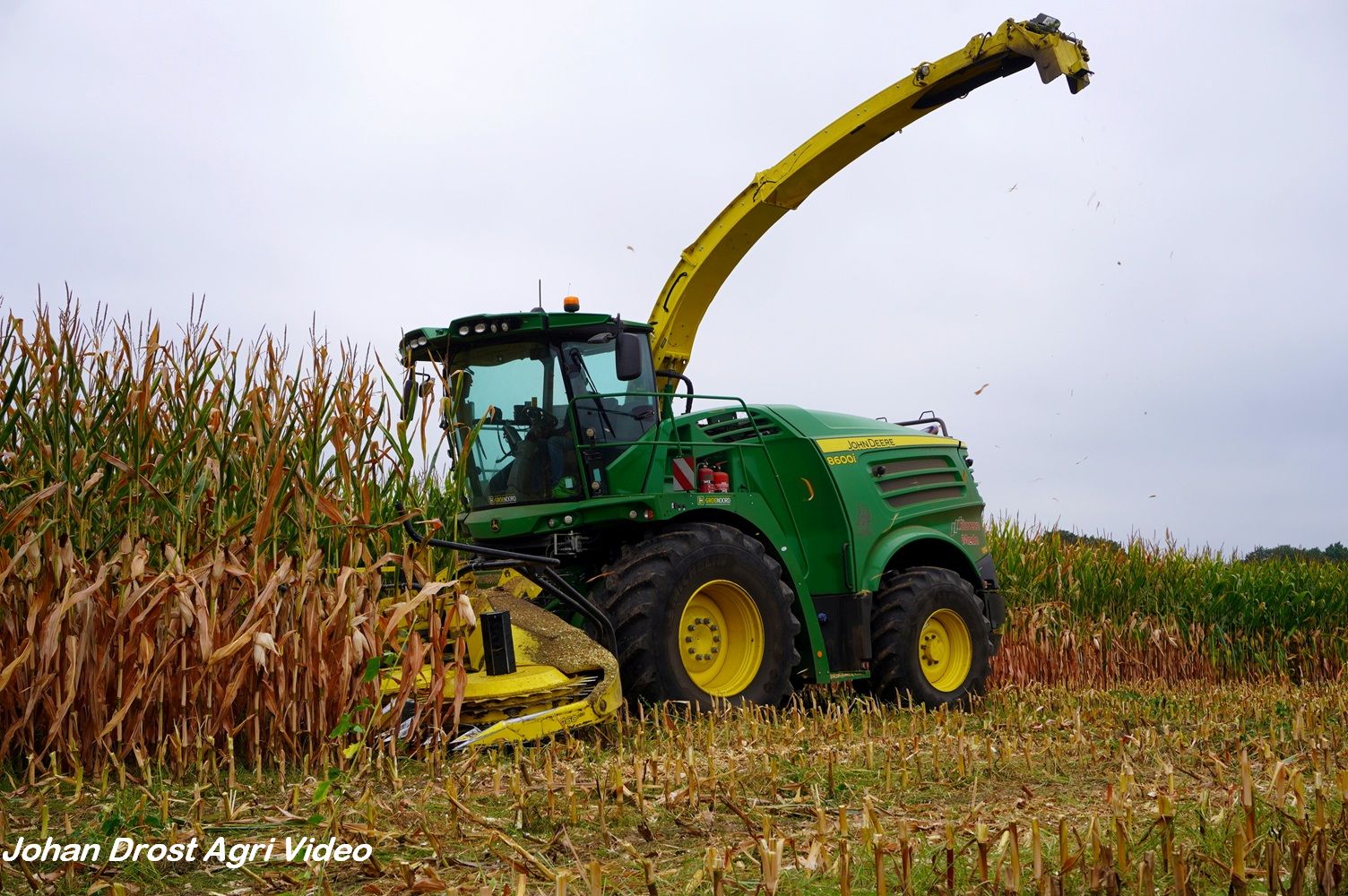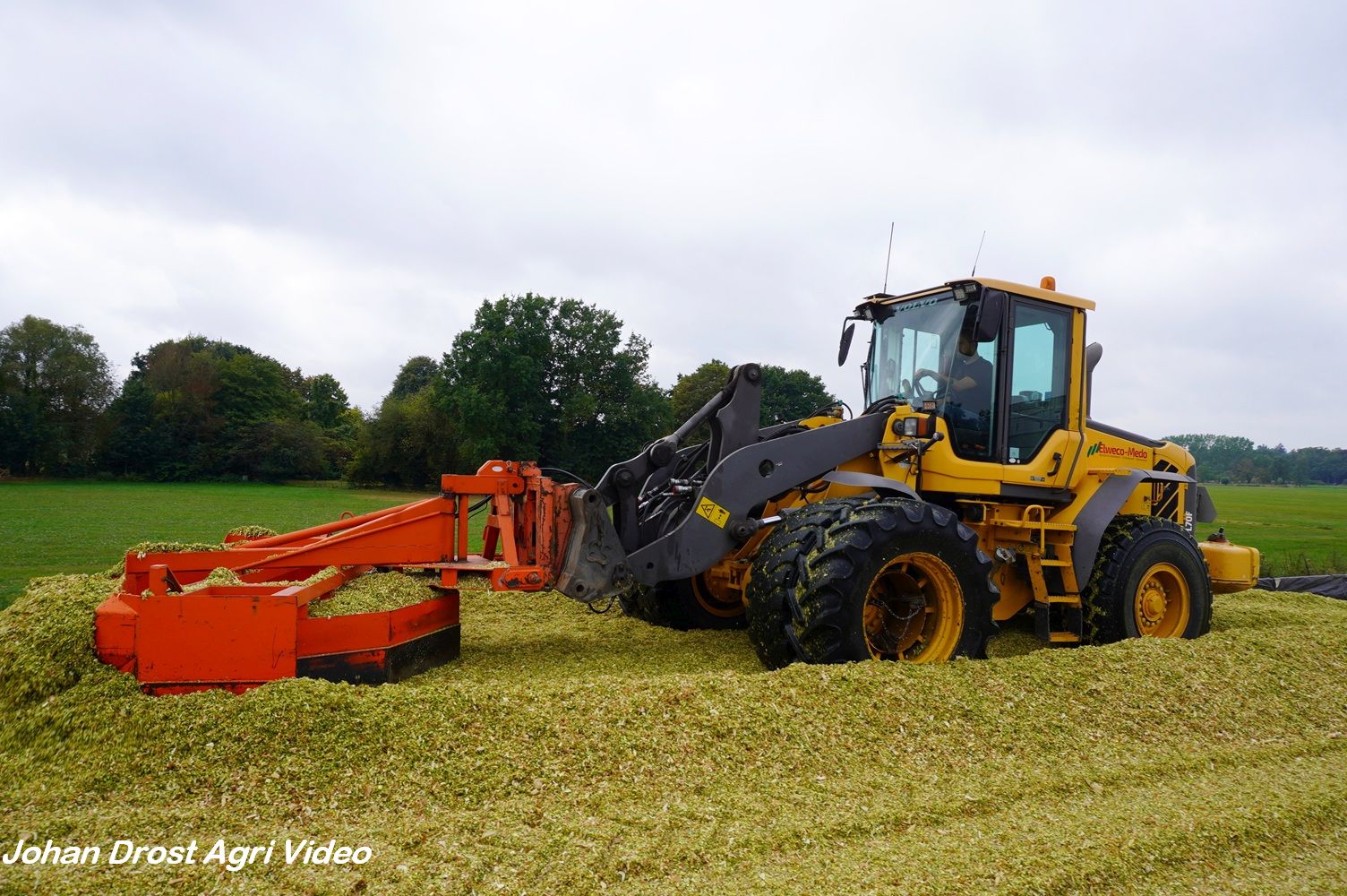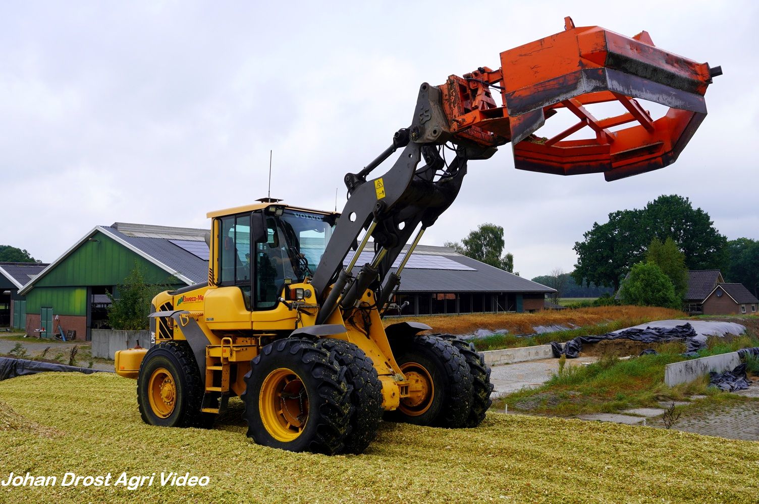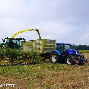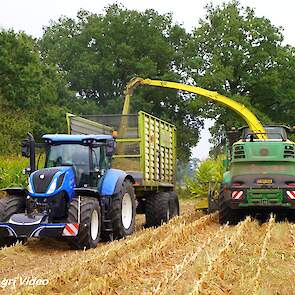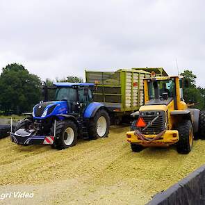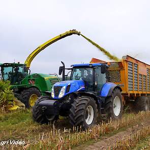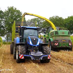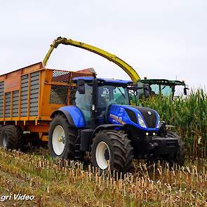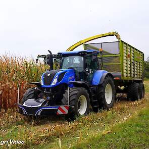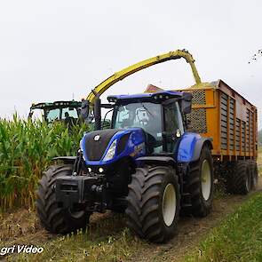 Loonbedrijf Elweco-Medo uit Laren (GD) aan het maïs hakselen met een John Deere 8600i, New Holland T7.230 met Kaweco Radium 45, New Holland T7.270 en New Holland met Veenhuis. Op de kuil een Volvo L70H.