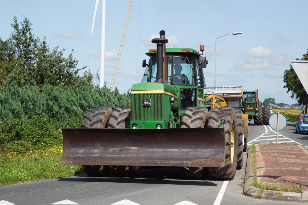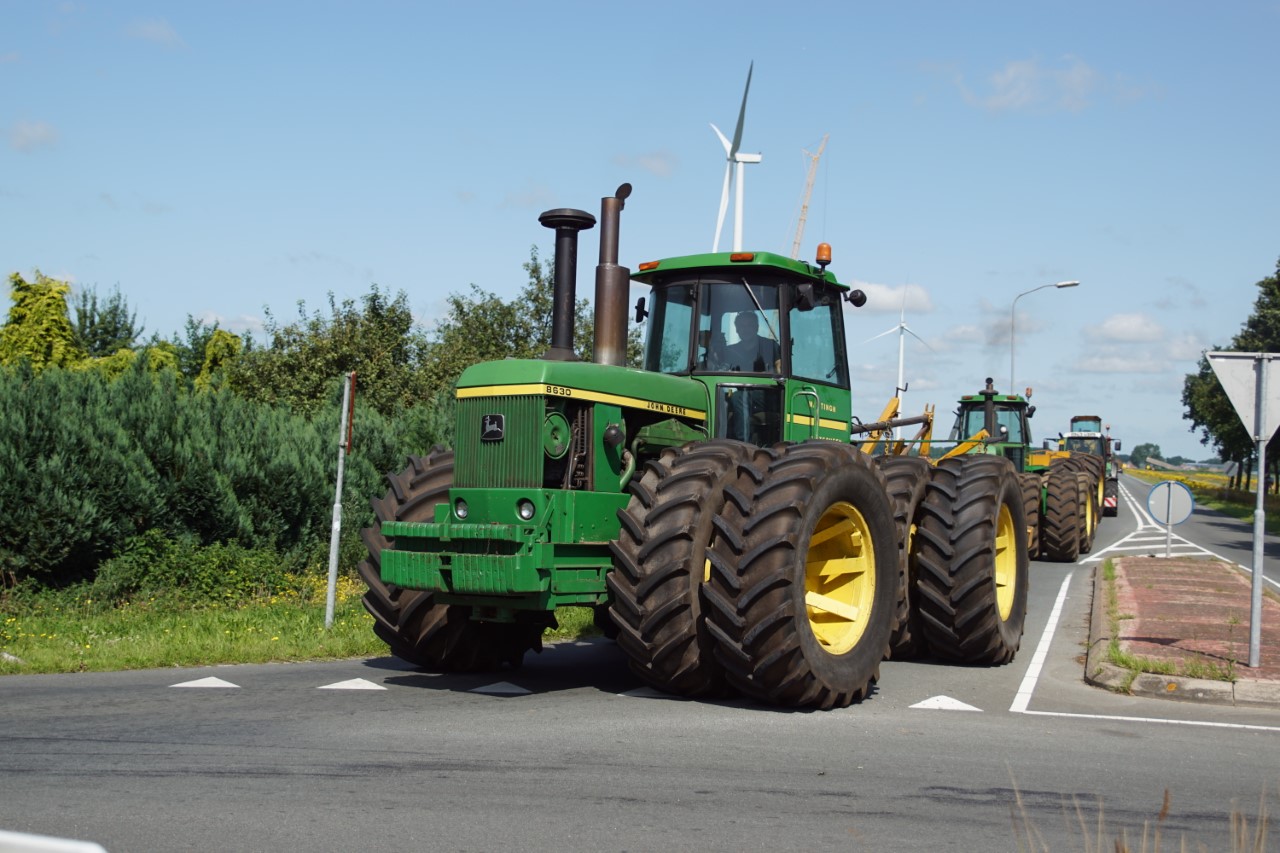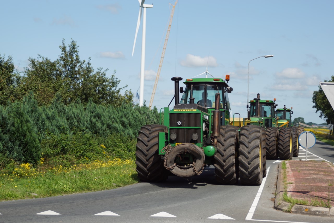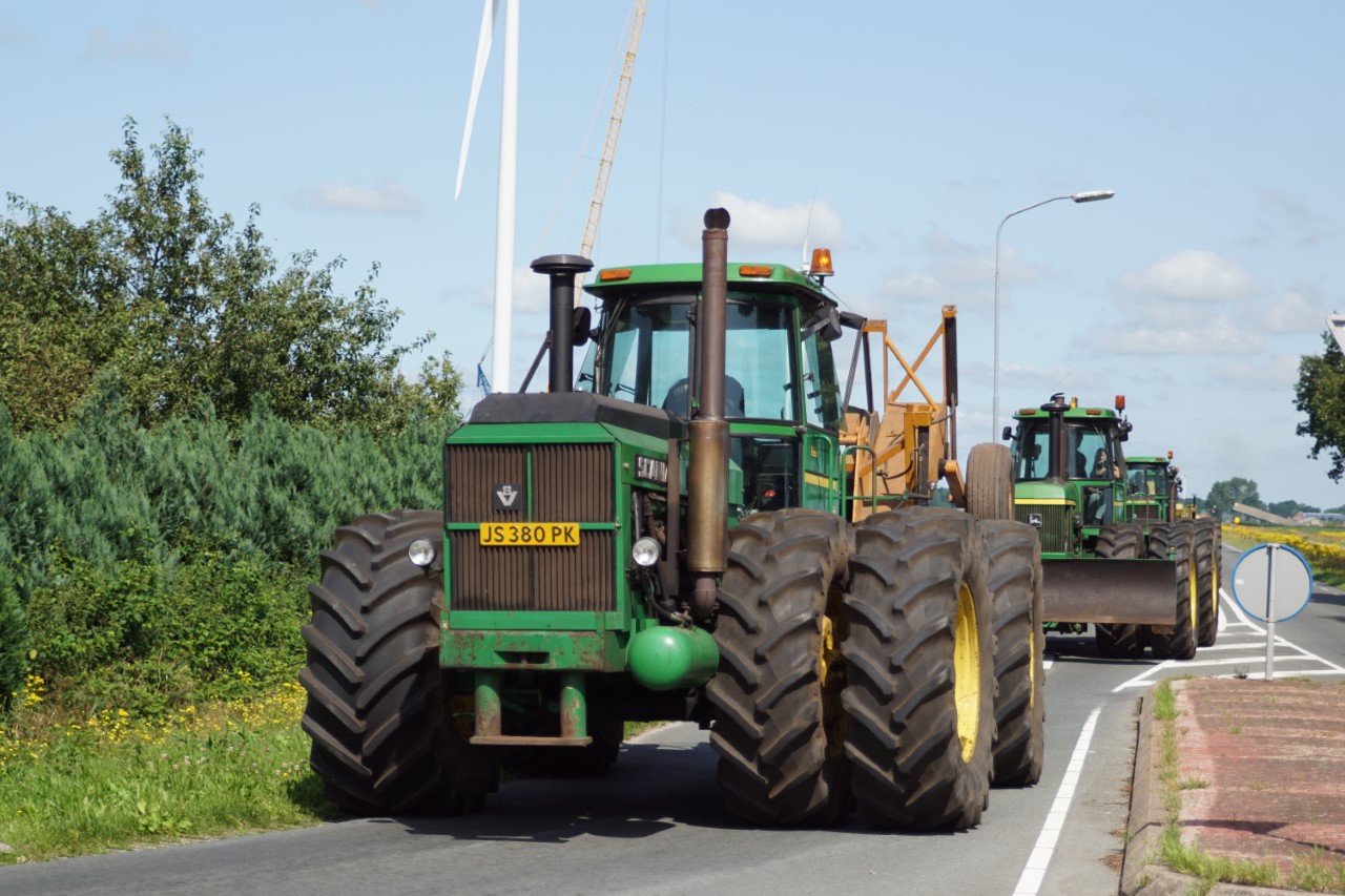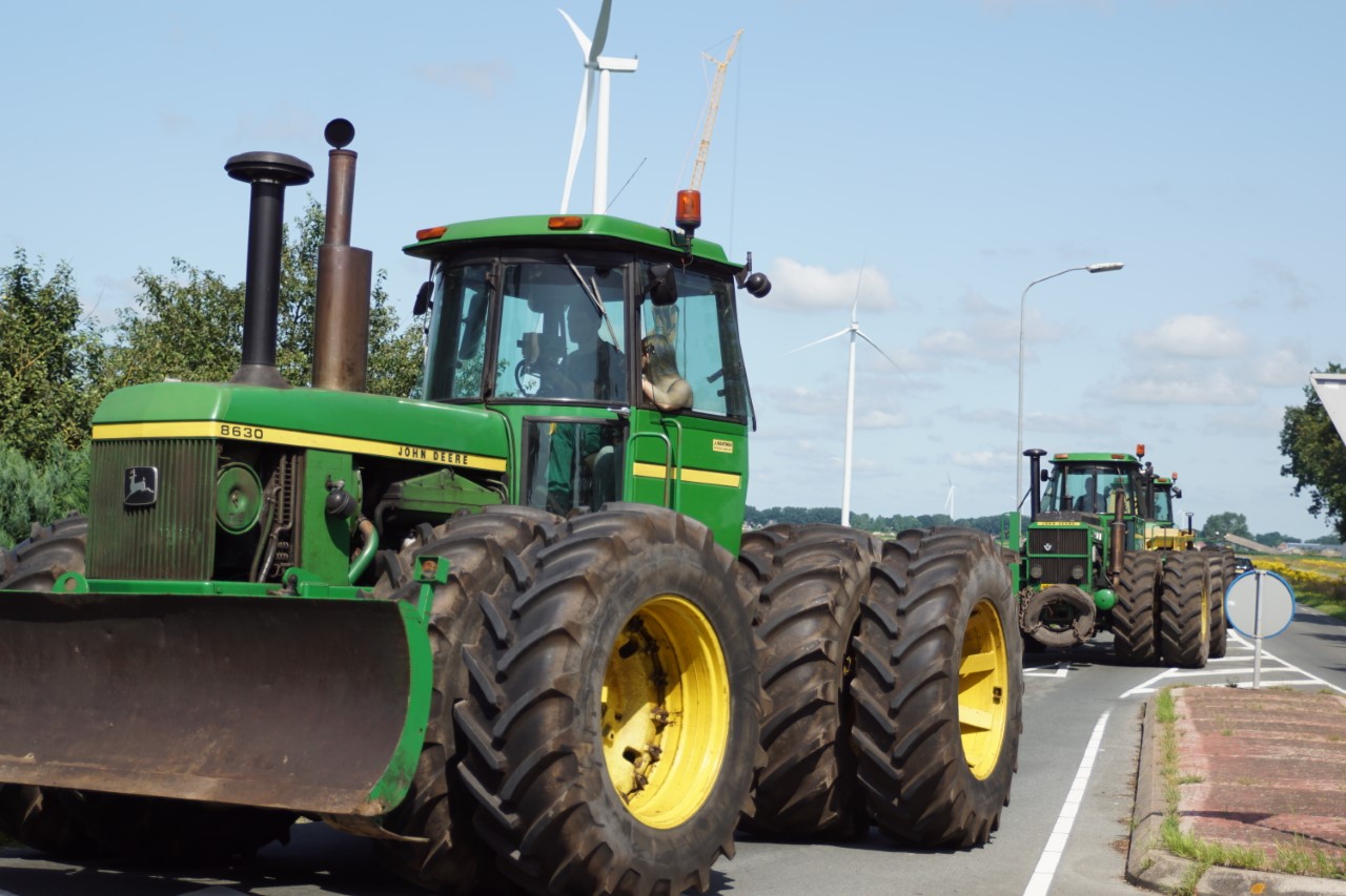 In de jaren zeventig en tachtig waren kniktrekkers nog geen alledaagse verschijning. Ze waren groot, breed en indrukwekkend - machines die niet alleen werkten, maar ook ontzag inboezemden. John Deere had met zijn 7020- en later 7520- en 8430-series een duidelijke plek veroverd in het zware werk op de akkers en bij loonbedrijven. Wanneer meerdere van deze trekkers samen op pad gingen, bijvoorbeeld bij ruilverkavelingen, grootschalige grondbewerking of demonstratiedagen, was dat een spektakel op zich.