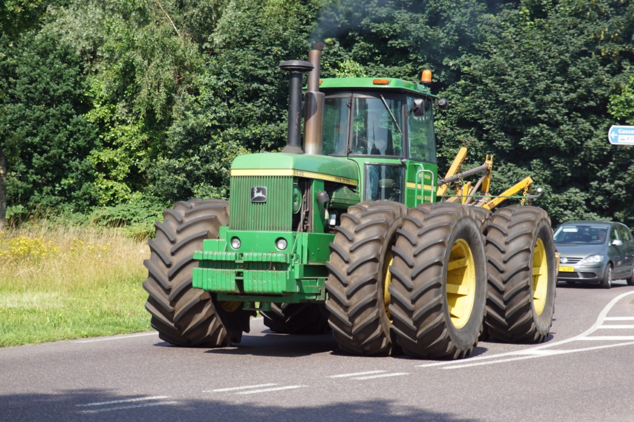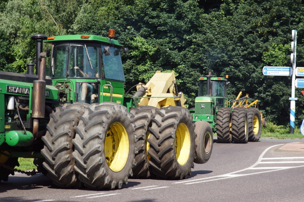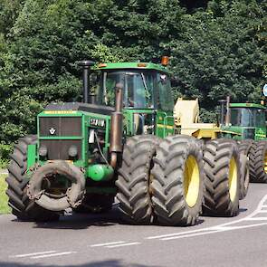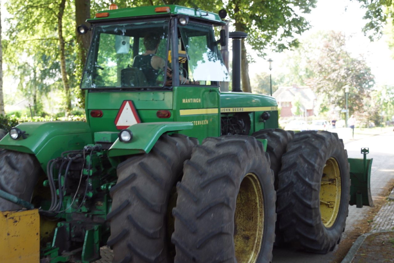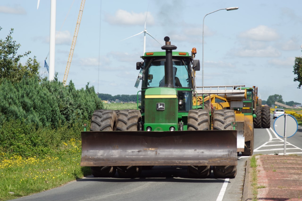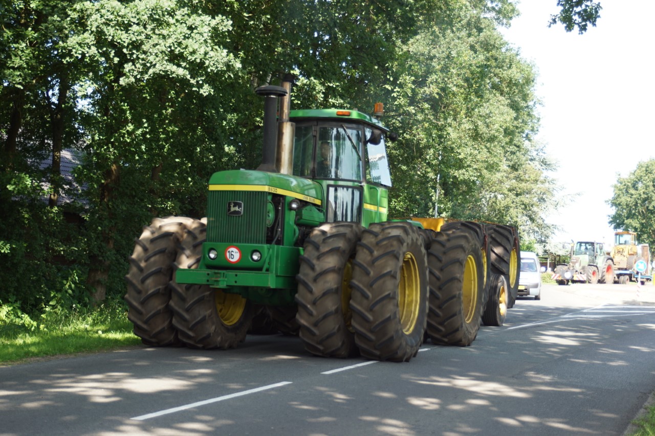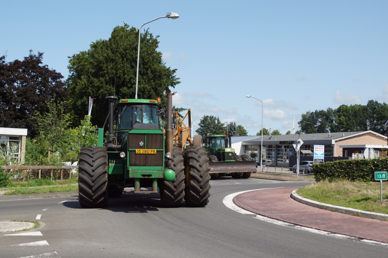 In de jaren zeventig en tachtig waren kniktrekkers nog geen alledaagse verschijning. Ze waren groot, breed en indrukwekkend - machines die niet alleen werkten, maar ook ontzag inboezemden. John Deere had met zijn 7020- en later 7520- en 8430-series een duidelijke plek veroverd in het zware werk op de akkers en bij loonbedrijven. Wanneer meerdere van deze trekkers samen op pad gingen, bijvoorbeeld bij ruilverkavelingen, grootschalige grondbewerking of demonstratiedagen, was dat een spektakel op zich.