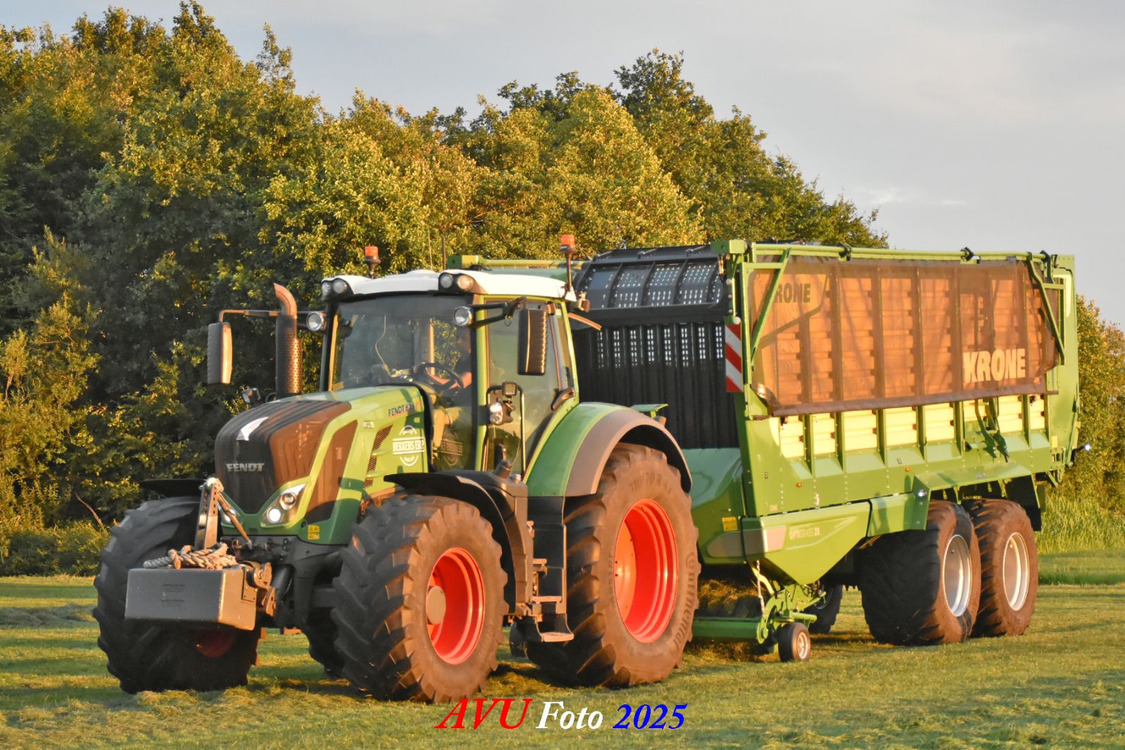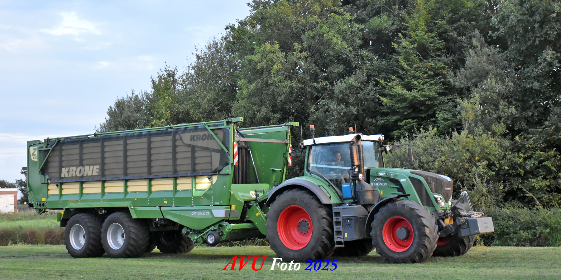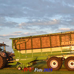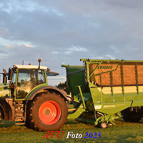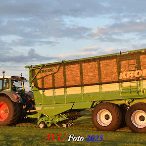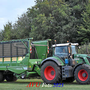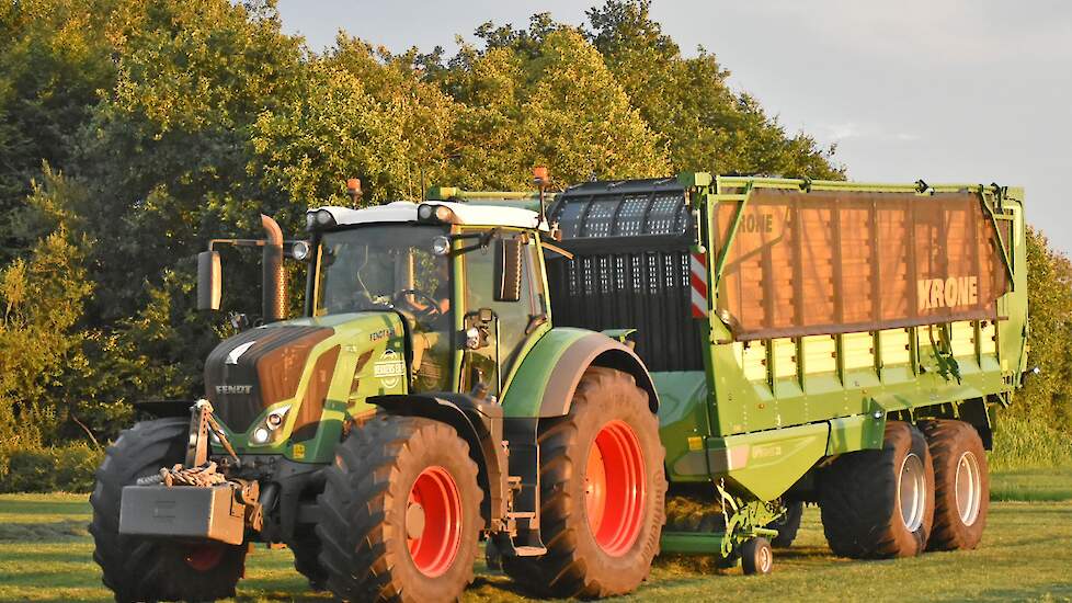 Na het maaien reed de Fendt 828 met de op een na grootste Krone-opraapwagen type ZX470 GL met een inhoud van 47 m2 het gras bij elkaar.