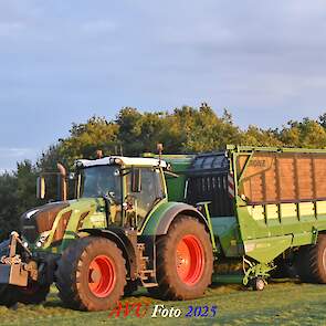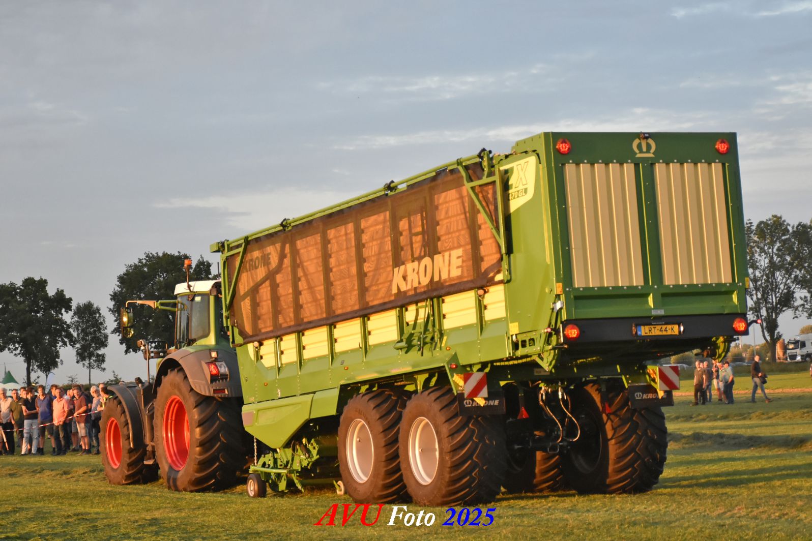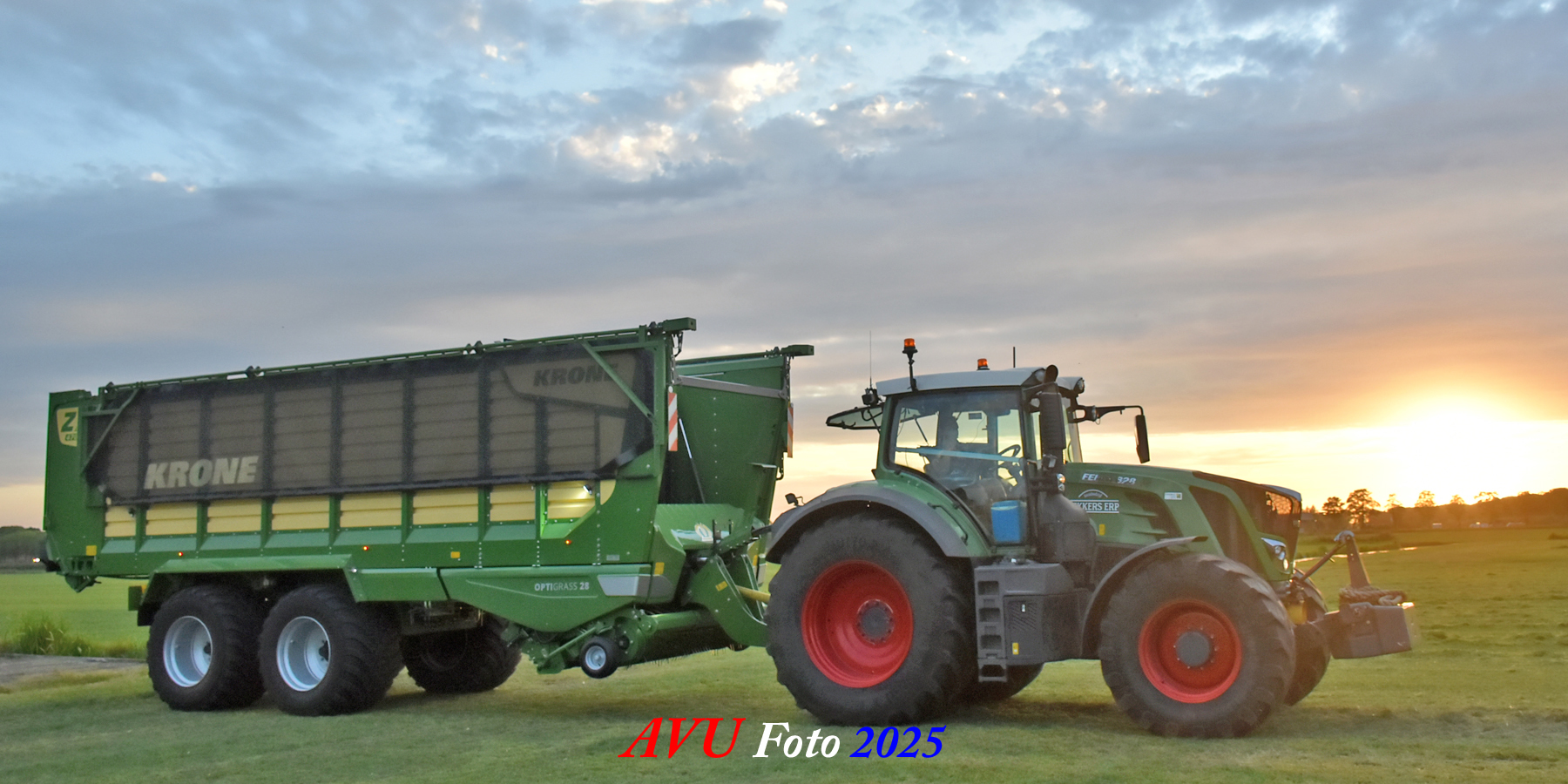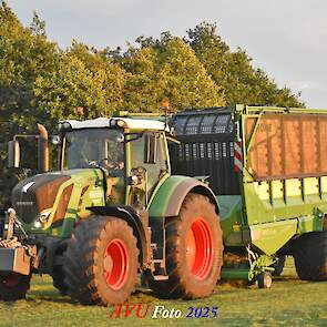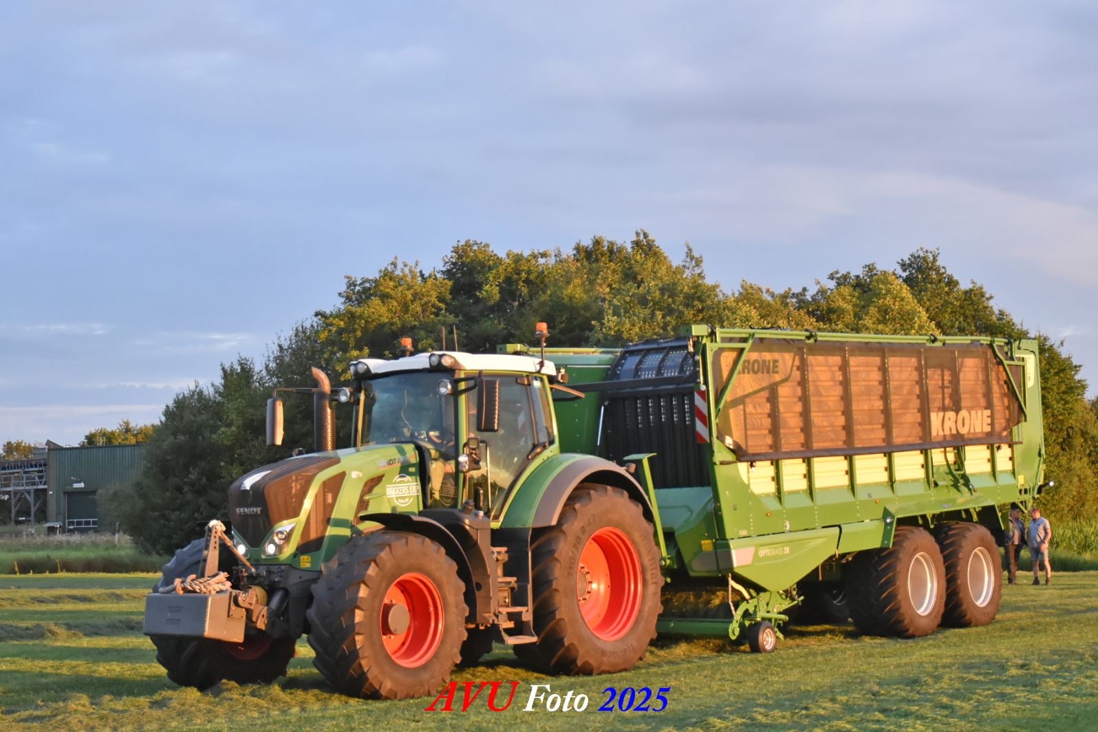 Na het maaien reed de Fendt 828 met de op een na grootste Krone-opraapwagen type ZX470 GL met een inhoud van 47 m2 het gras bij elkaar.