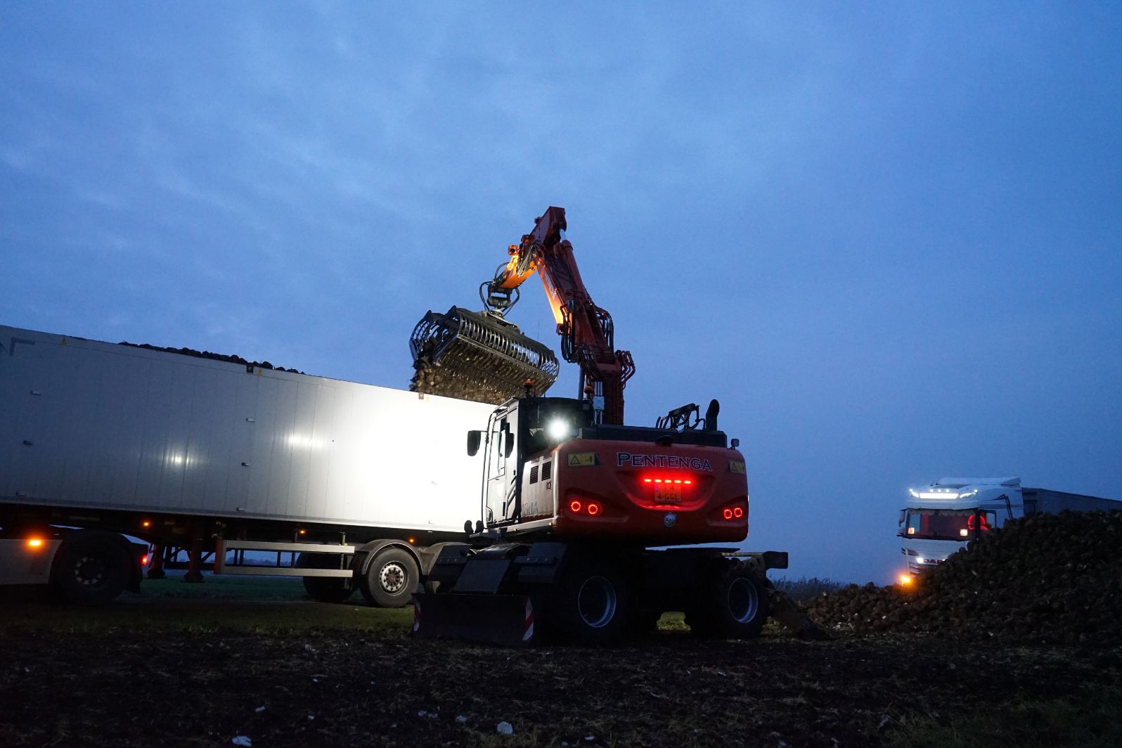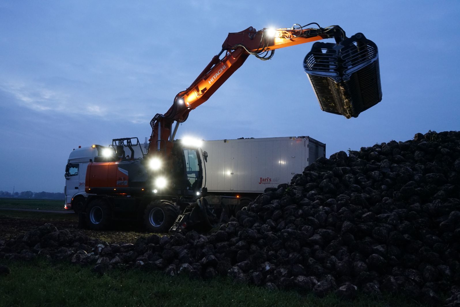 Het hart van de werkzaamheden wordt gevormd door een volledig voor bietenwerk opgebouwde Hitachi ZX180W-7 2P, die van september tot eind januari bijna non-stop draait. “Gemiddeld kom ik uit op zo’n 2.500 draaiuren, alleen al tijdens de campagne”, vertelt Michel. “Daarbovenop nog eens driehonderd uur voor grondverzet en assisteren op het gebied van loonwerk. Het is een intensieve periode, maar ook een heel mooie.”