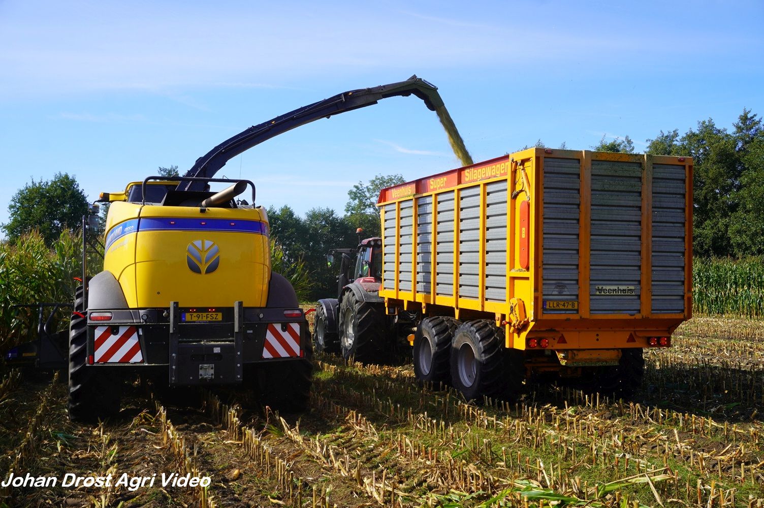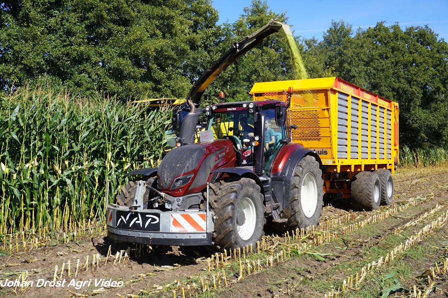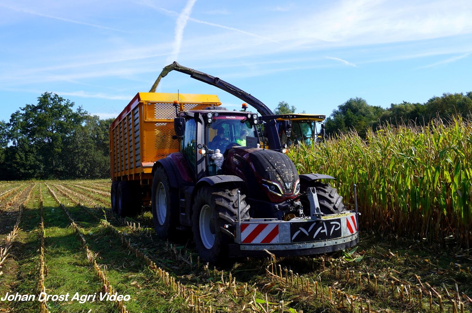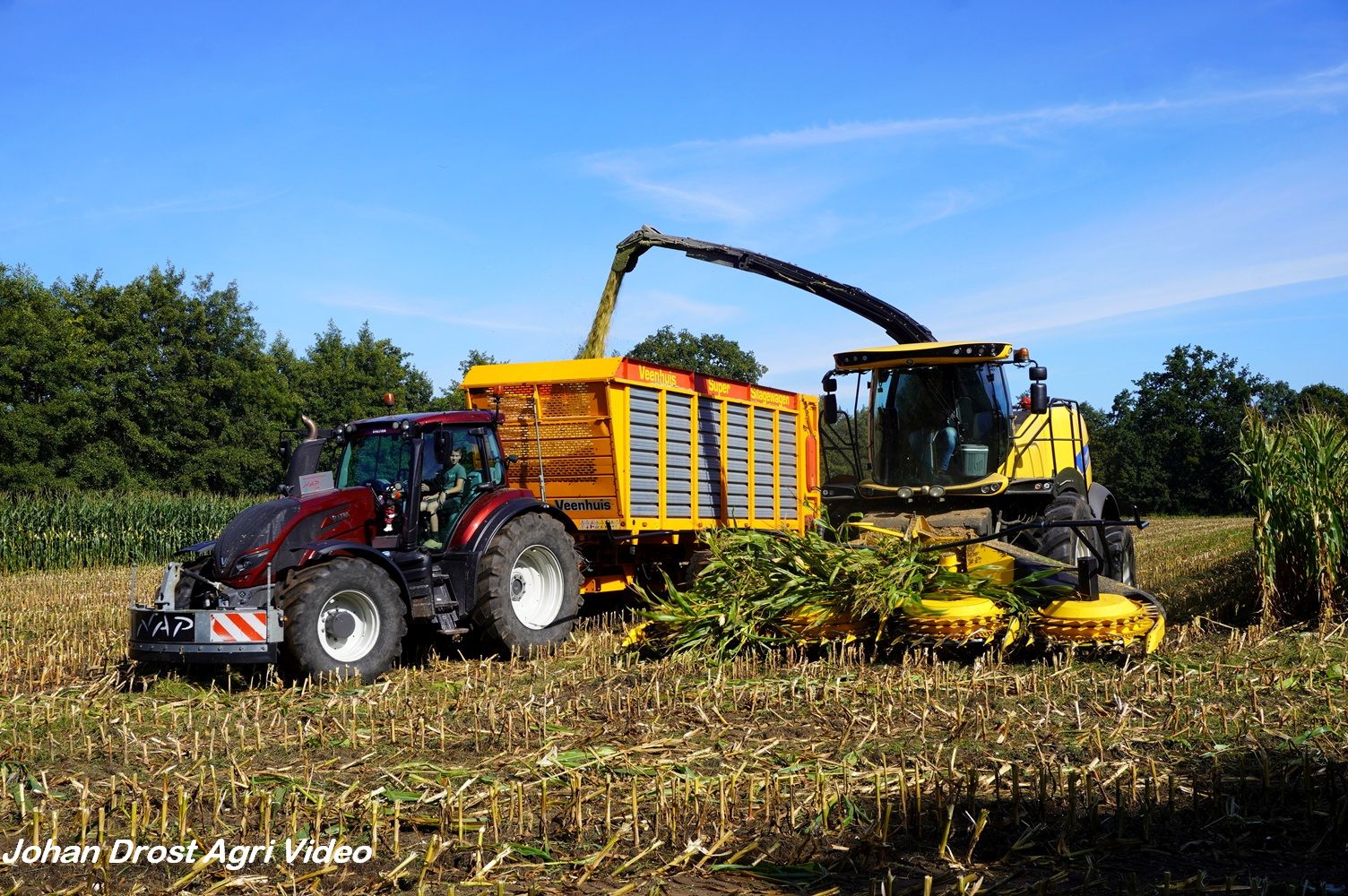 Maïs hakselen met een New Holland FR550, Valtra T215 en Valtra T254 met Veenhuis. Op de kuil een JCB 427.