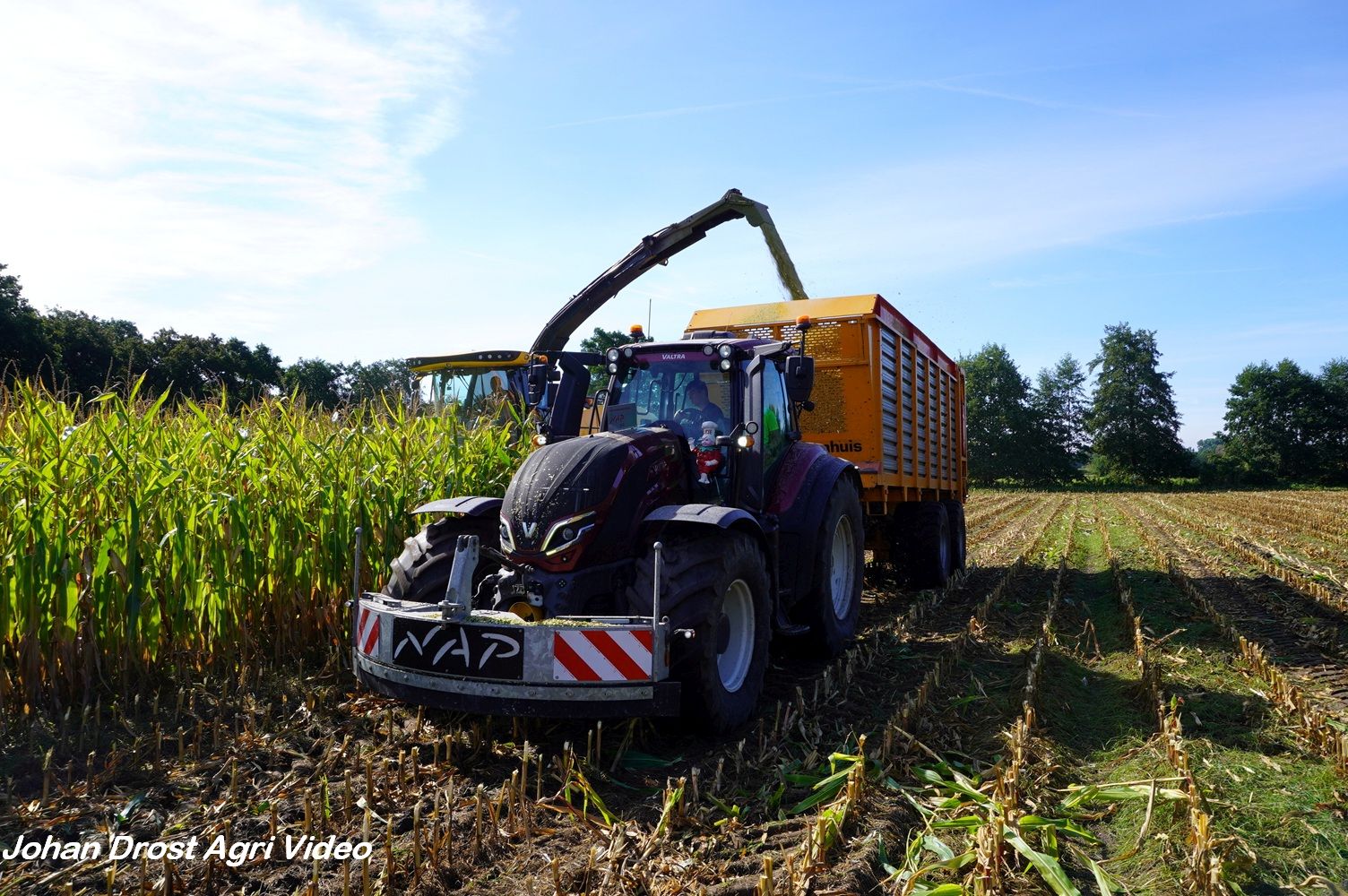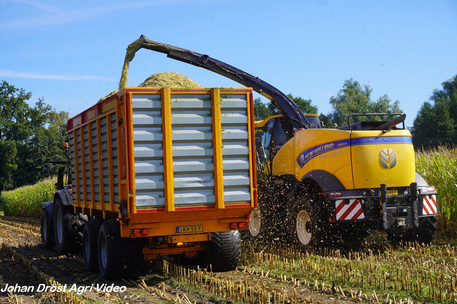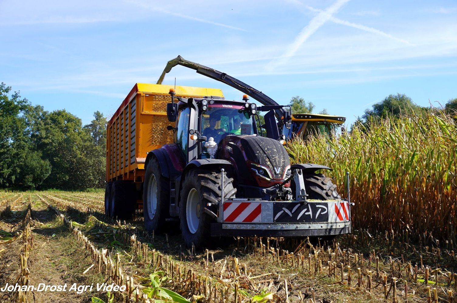 Maïs hakselen met een New Holland FR550, Valtra T215 en Valtra T254 met Veenhuis. Op de kuil een JCB 427.