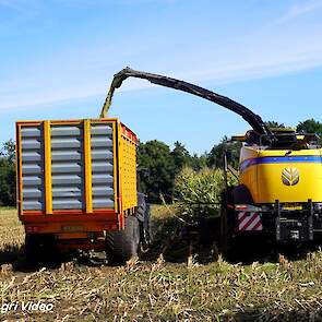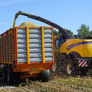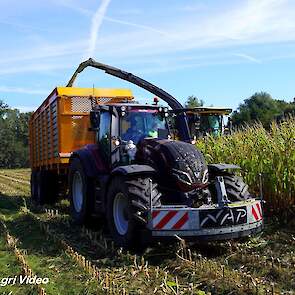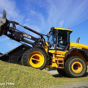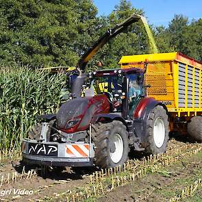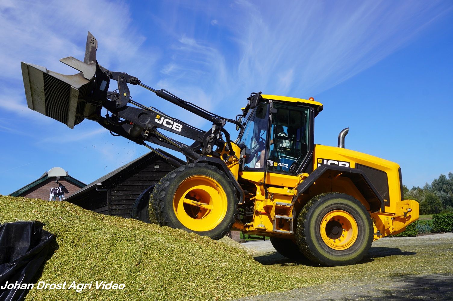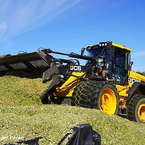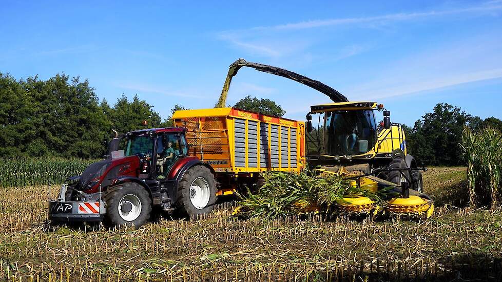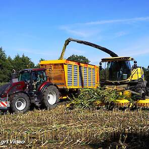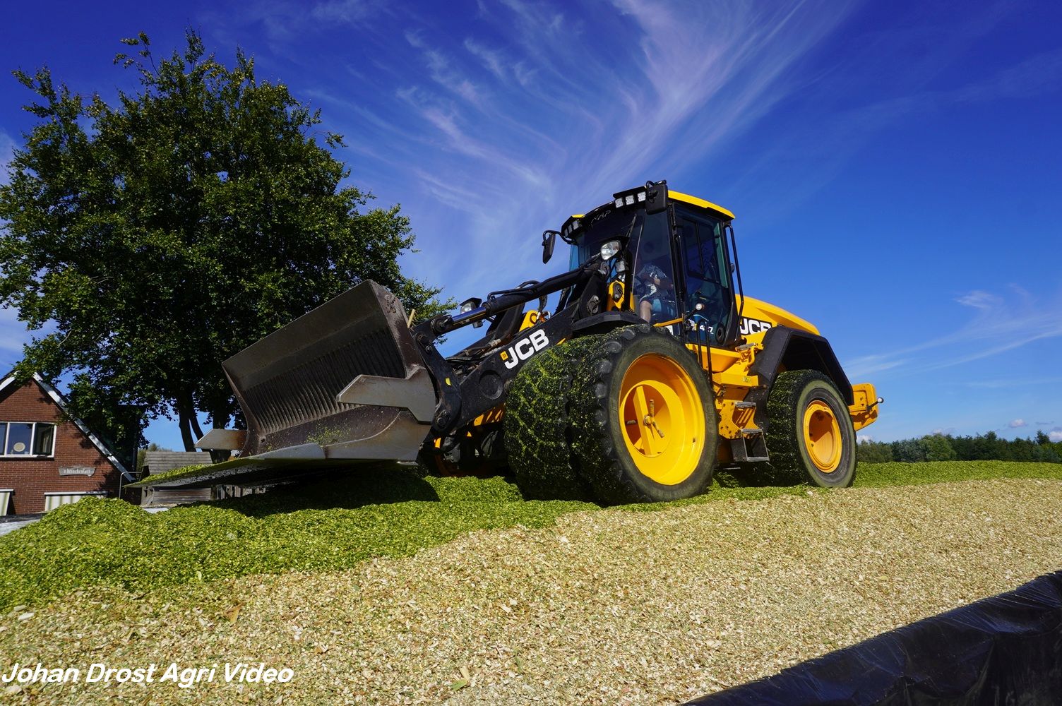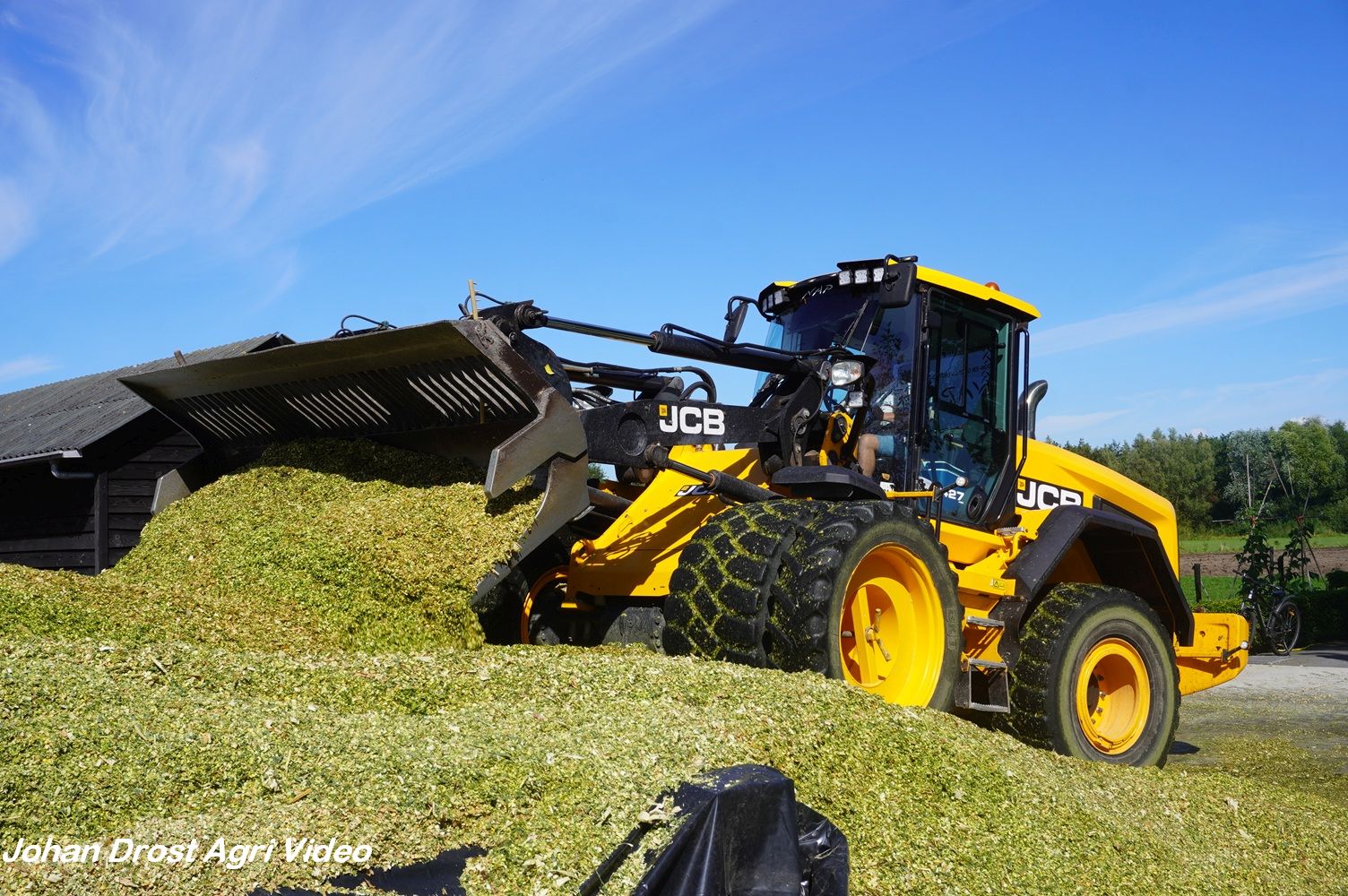 Maïs hakselen met een New Holland FR550, Valtra T215 en Valtra T254 met Veenhuis. Op de kuil een JCB 427.