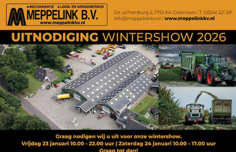 Op vrijdag 23 januari van 10:00 tot 22:00 uur en op zaterdag 24 januari 2026 van 10:00 tot 17:00 uur houdt Meppelink BV een wintershow. Op de show is een ruim aanbod van zowel gebruikte als nieuwe trekkers en machines te zien.