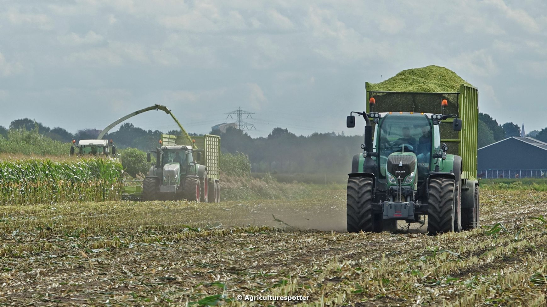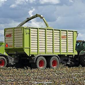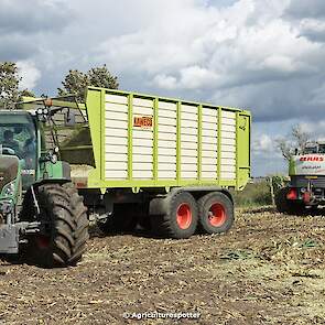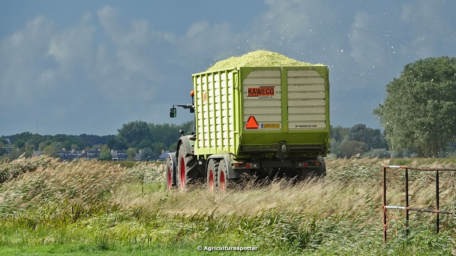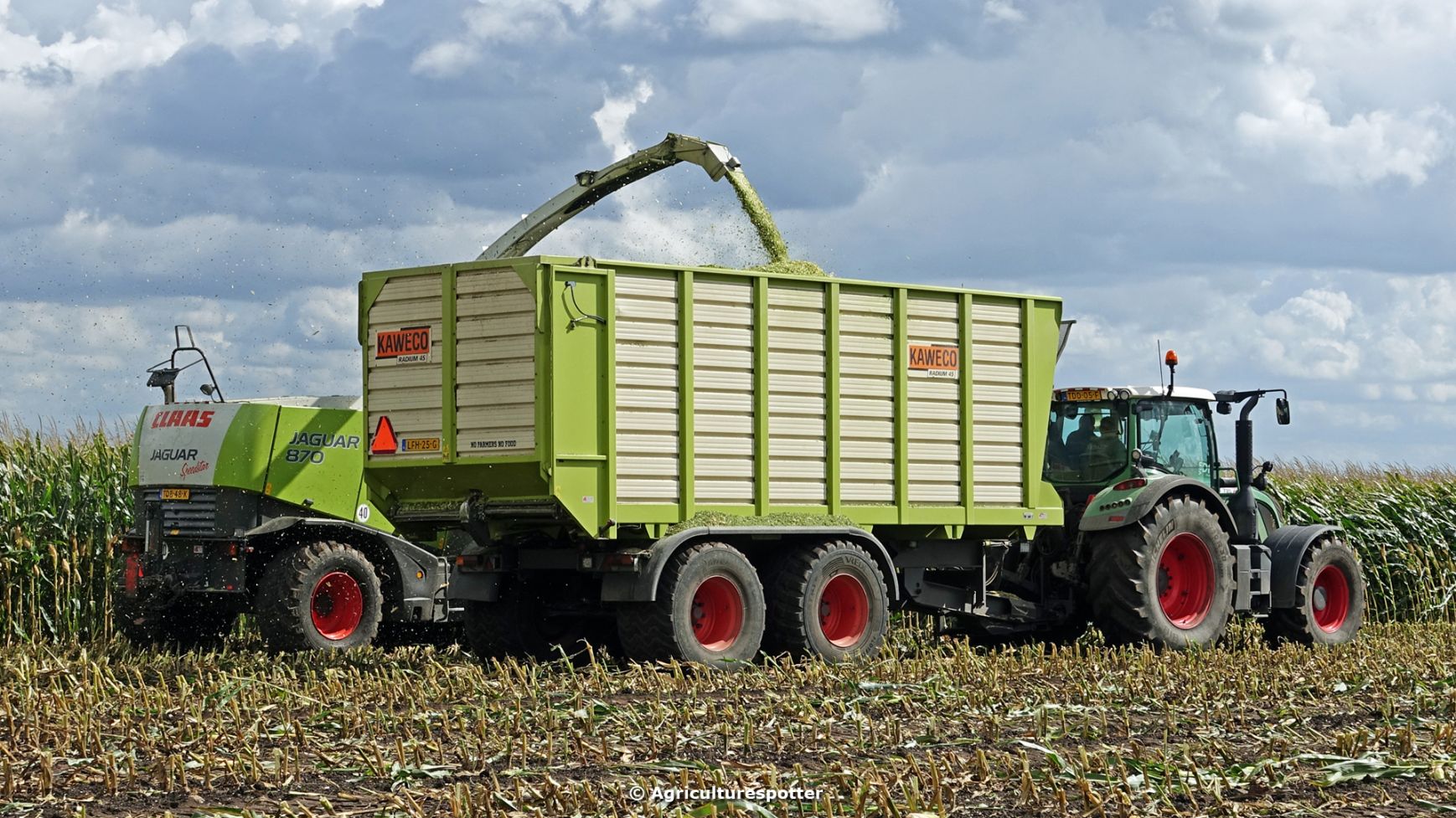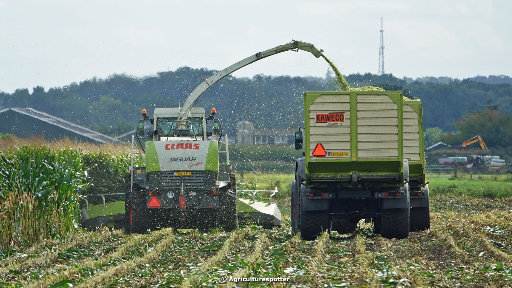 Maïs hakselen in Hoogland met een Claas Jaguar 870 Speedstar met een achtrijige maïsbek van loon- en grondverzetbedrijf Van Dijk Hoogland BV. Het transport werd gedaan met een Fendt 826 en een Fendt 720 Vario met een Kaweco Radium 45-silagewagen.