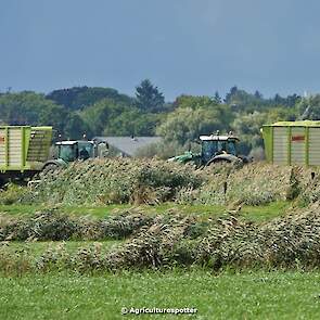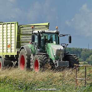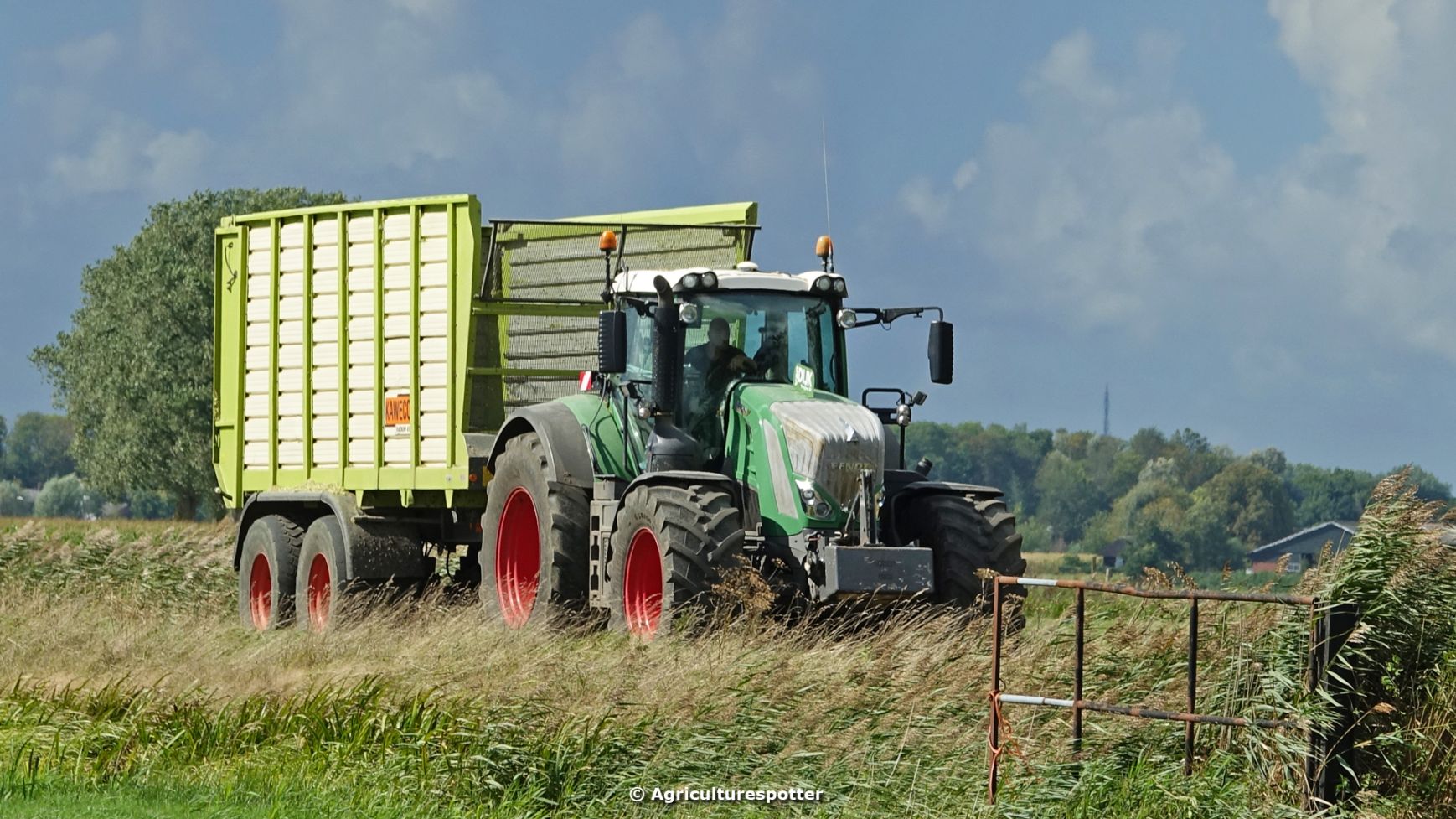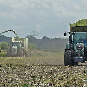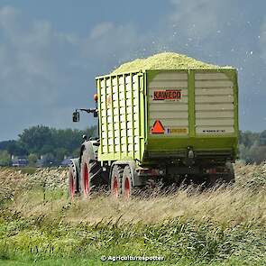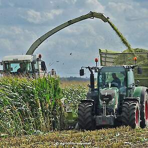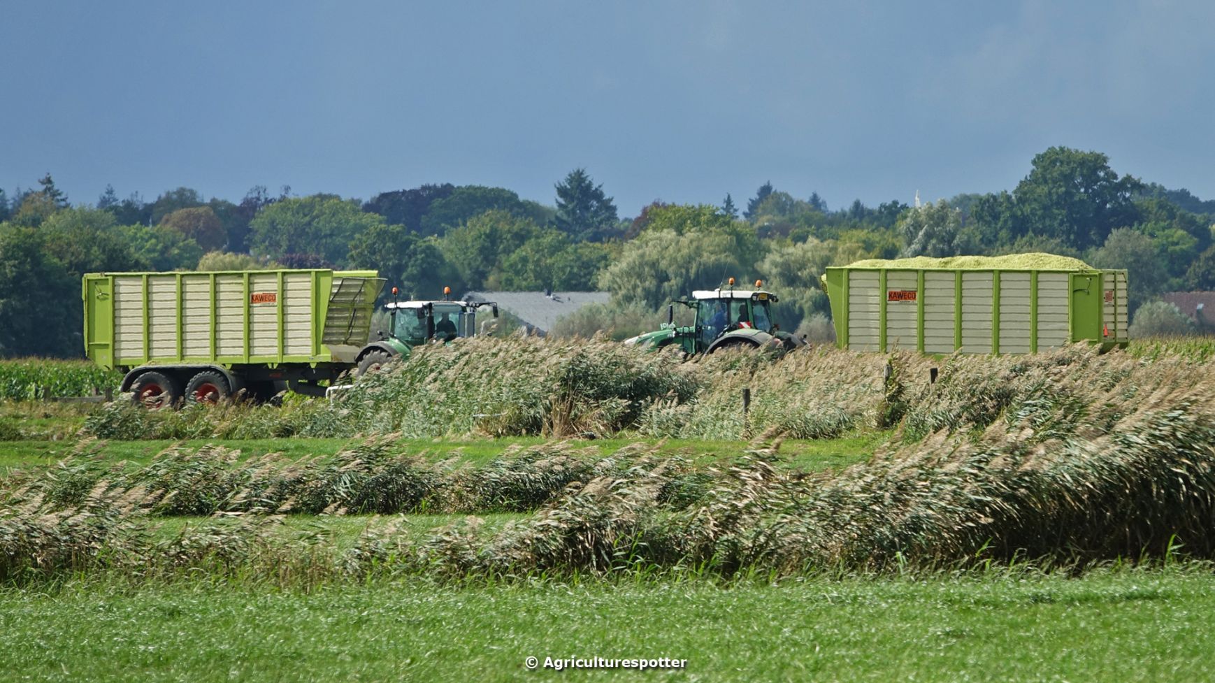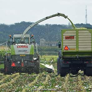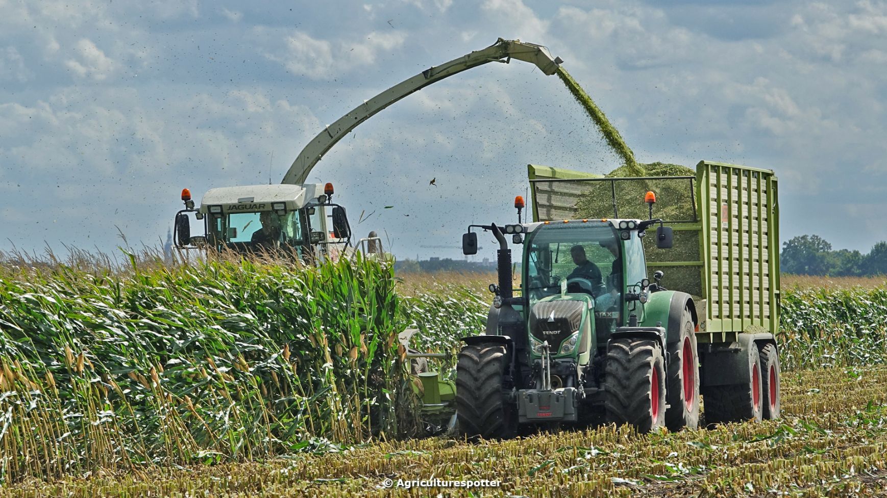 Maïs hakselen in Hoogland met een Claas Jaguar 870 Speedstar met een achtrijige maïsbek van loon- en grondverzetbedrijf Van Dijk Hoogland BV. Het transport werd gedaan met een Fendt 826 en een Fendt 720 Vario met een Kaweco Radium 45-silagewagen.
