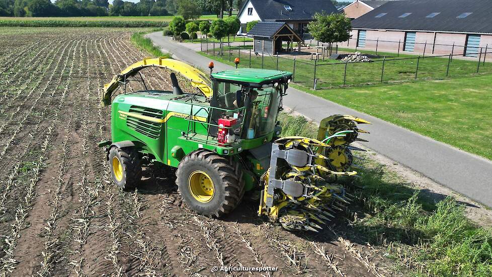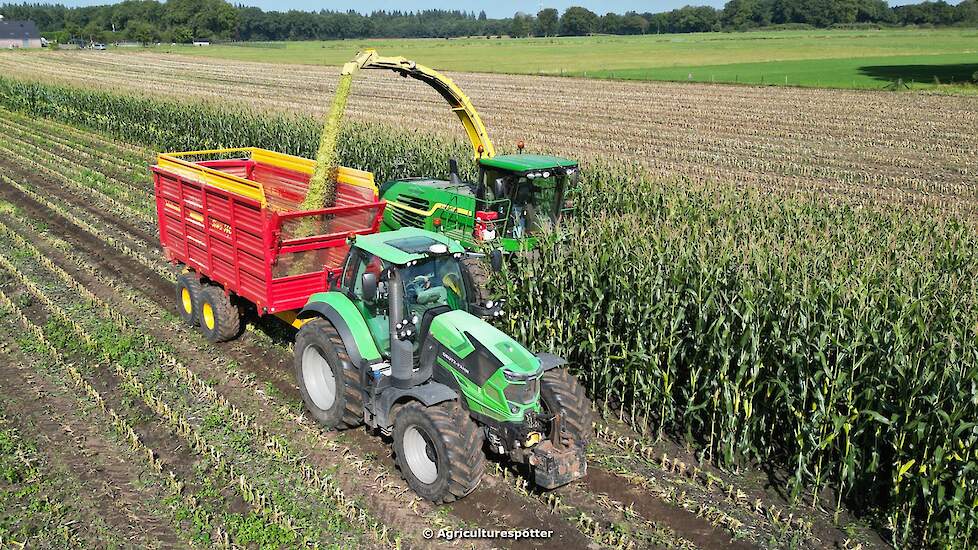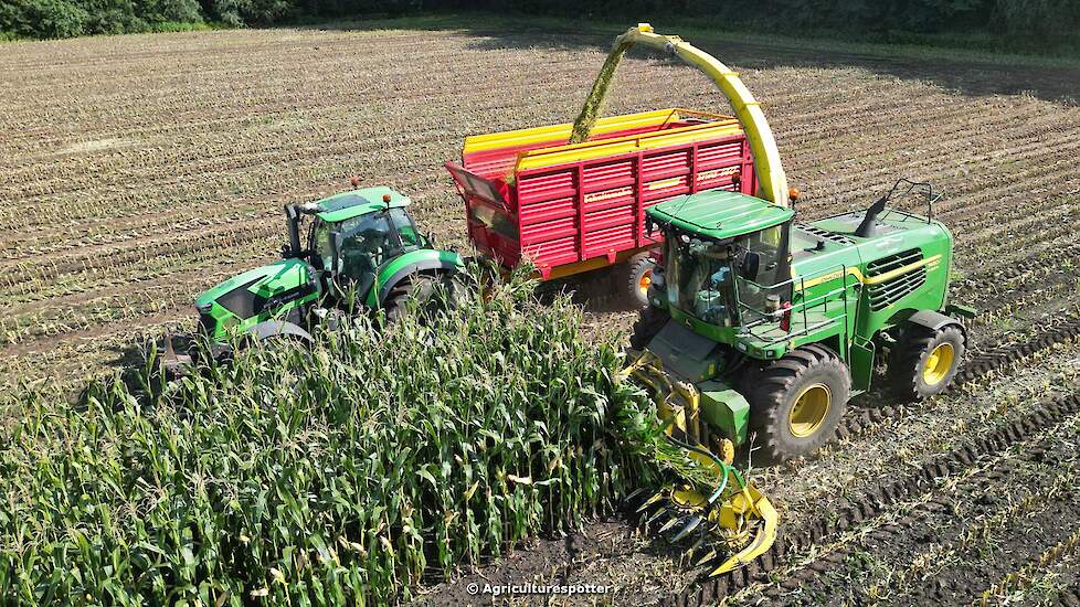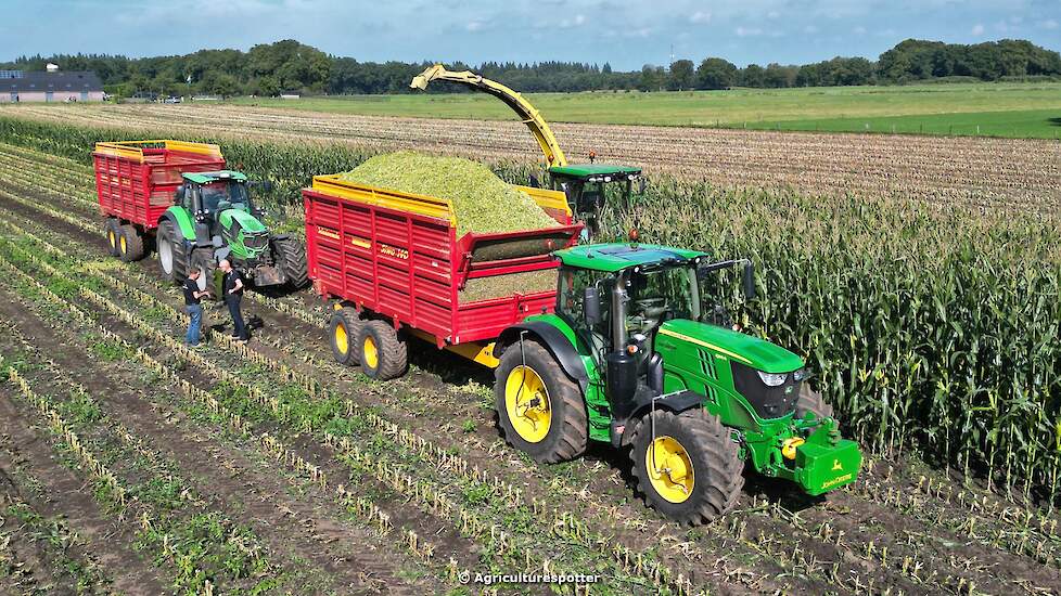 Maïs hakselen in Garderen met een John Deere 7480i ProDrive en een 8-rijige maïsbek van loon- en grondverzetbedrijf Van den Top uit Lunteren voor melkveehouder Van Heerikhuize. Het transport werd gedaan met een John Deere 6195R en een Deutz.