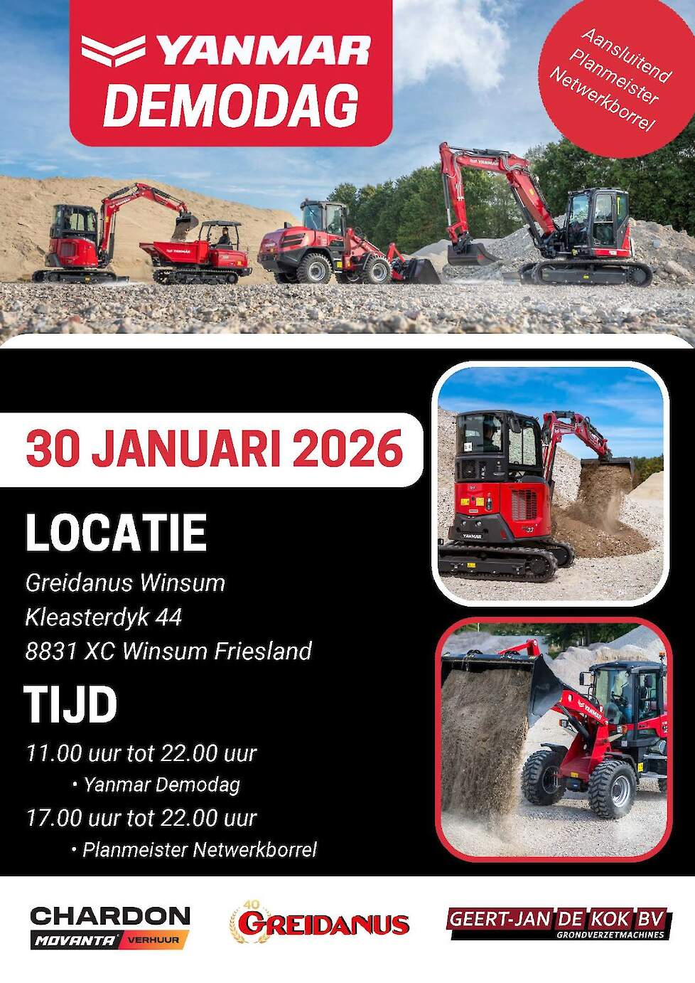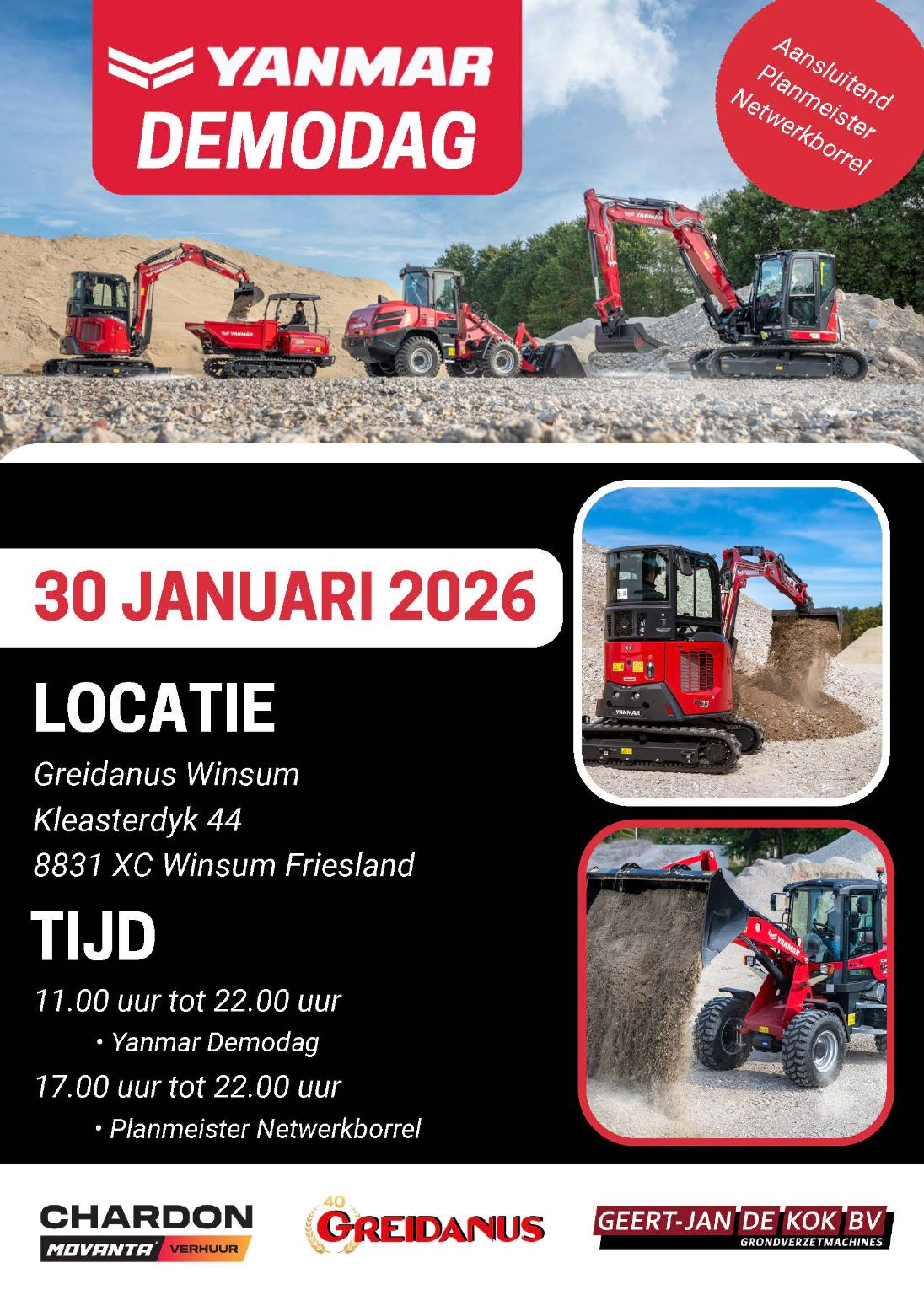 Aanstaande vrijdag 30 januari organiseren Greidanus Winsum BV, Chardon Movanta en Geert-Jan De Kok BV gezamenlijk een Yanmar-demodag in het Friese Winsum.