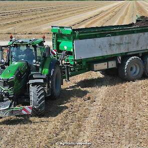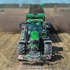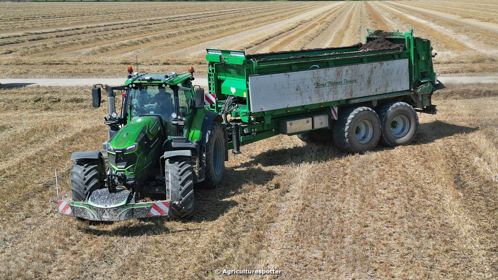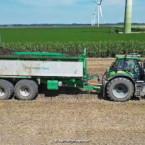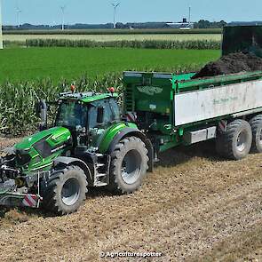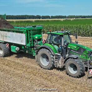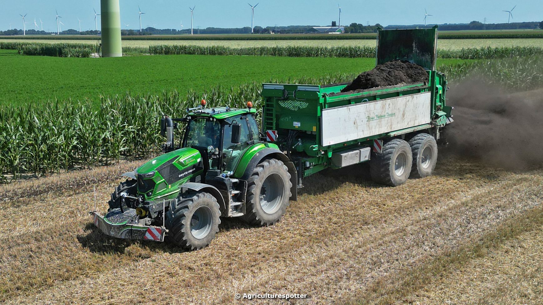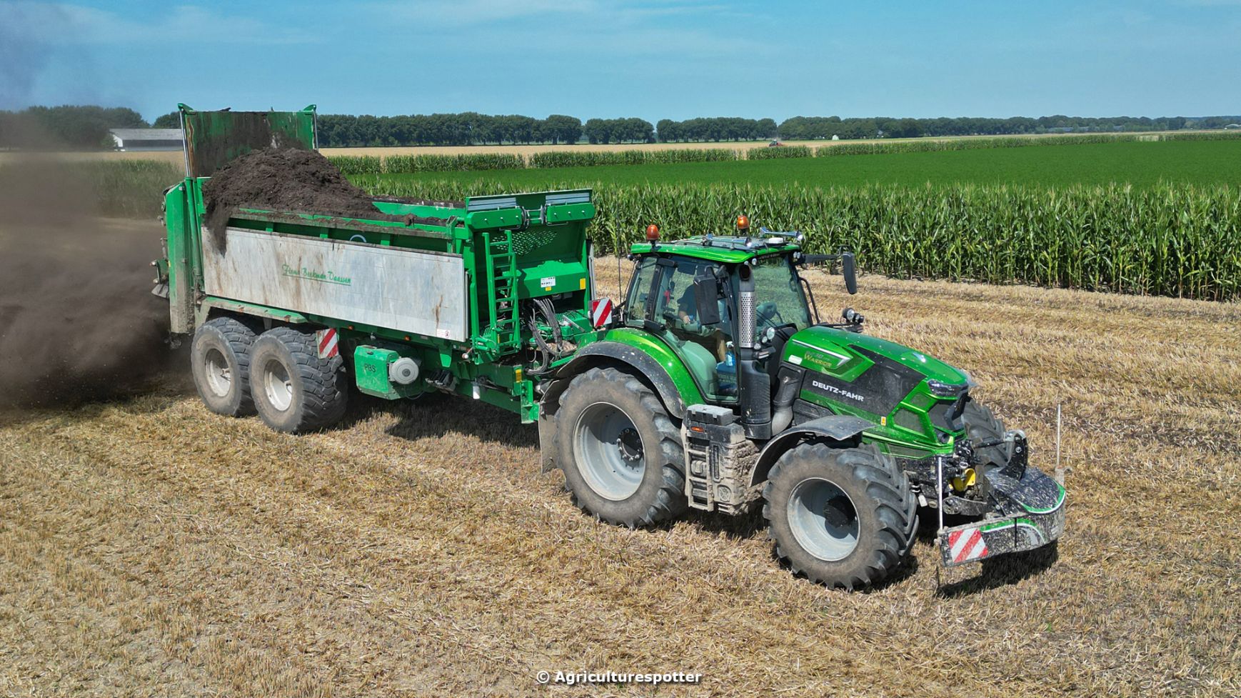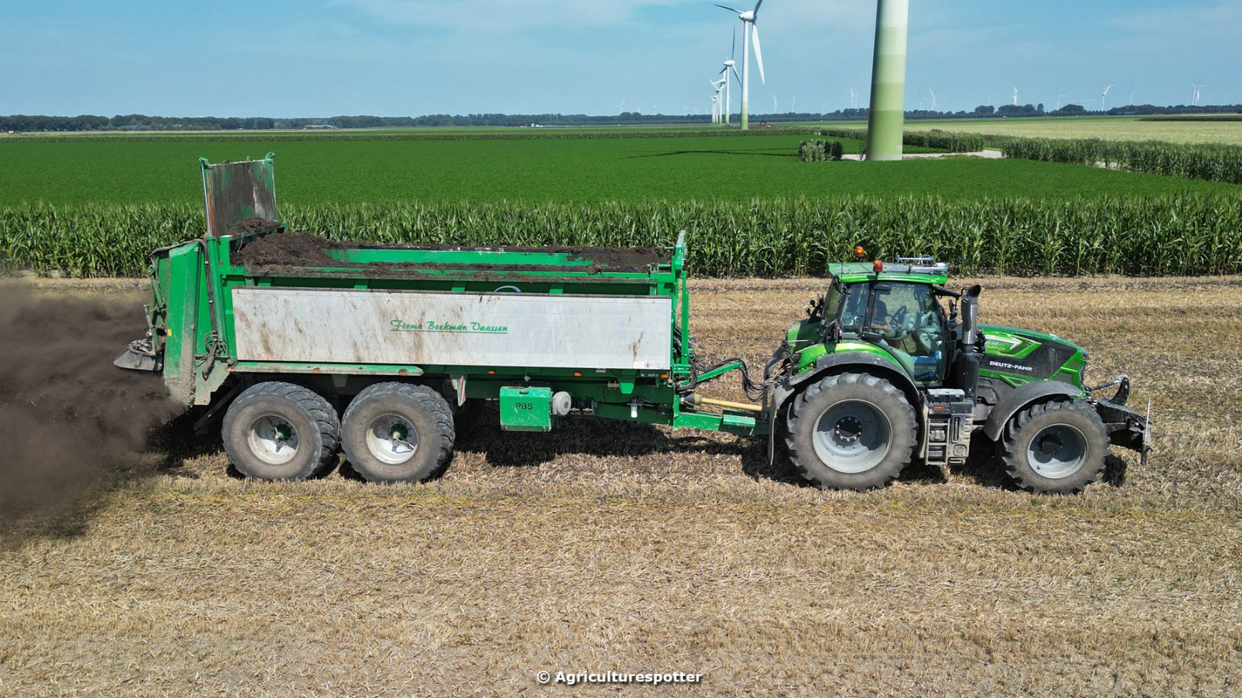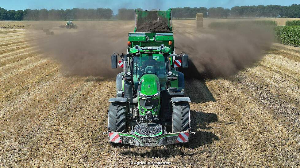 Compost strooien met een Deutz-Fahr Agrotron 6230 TTV Warrior en een Tebbe HS-breedstrooier van loonbedrijf Firma Beekman uit Vaassen.