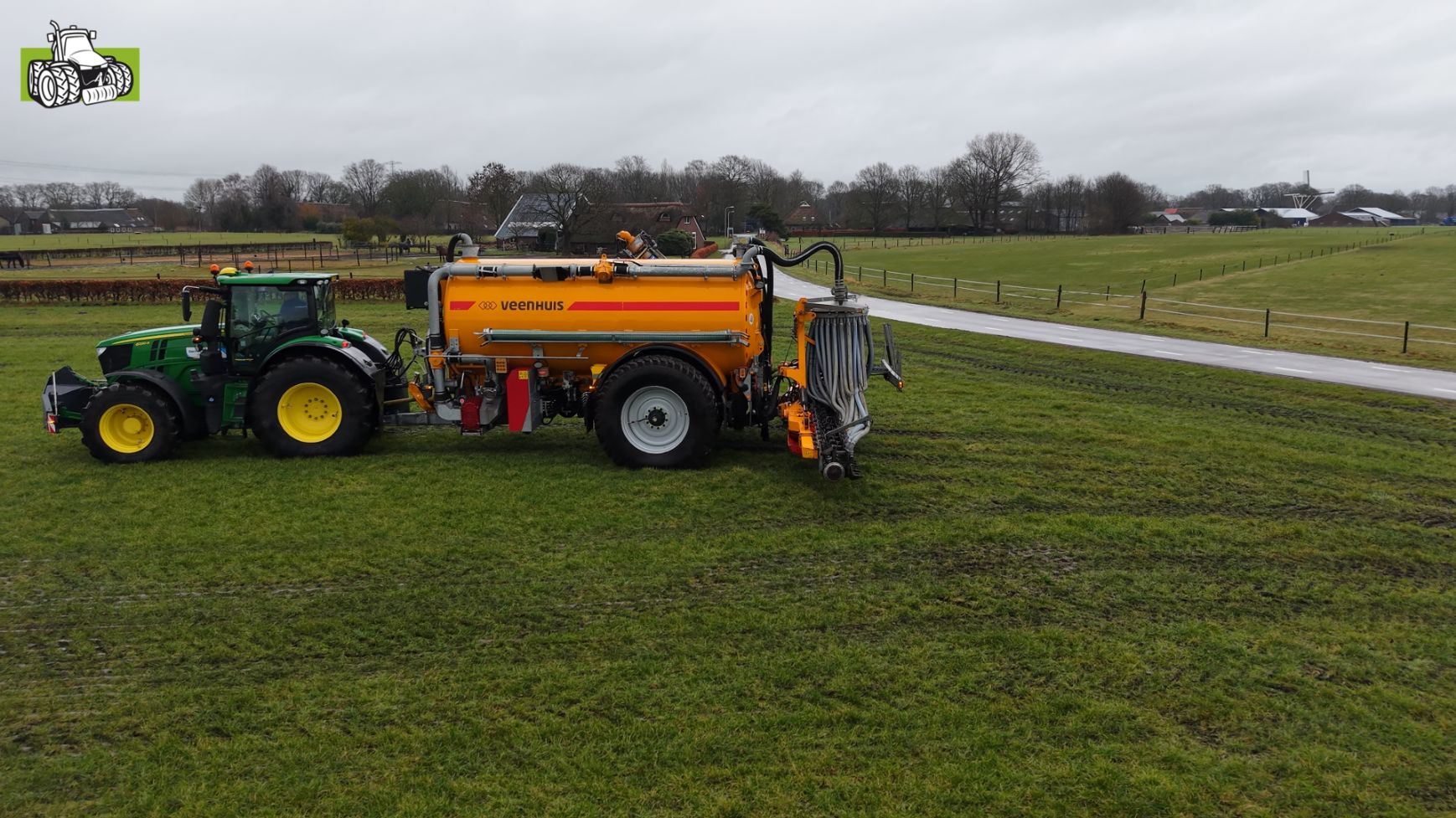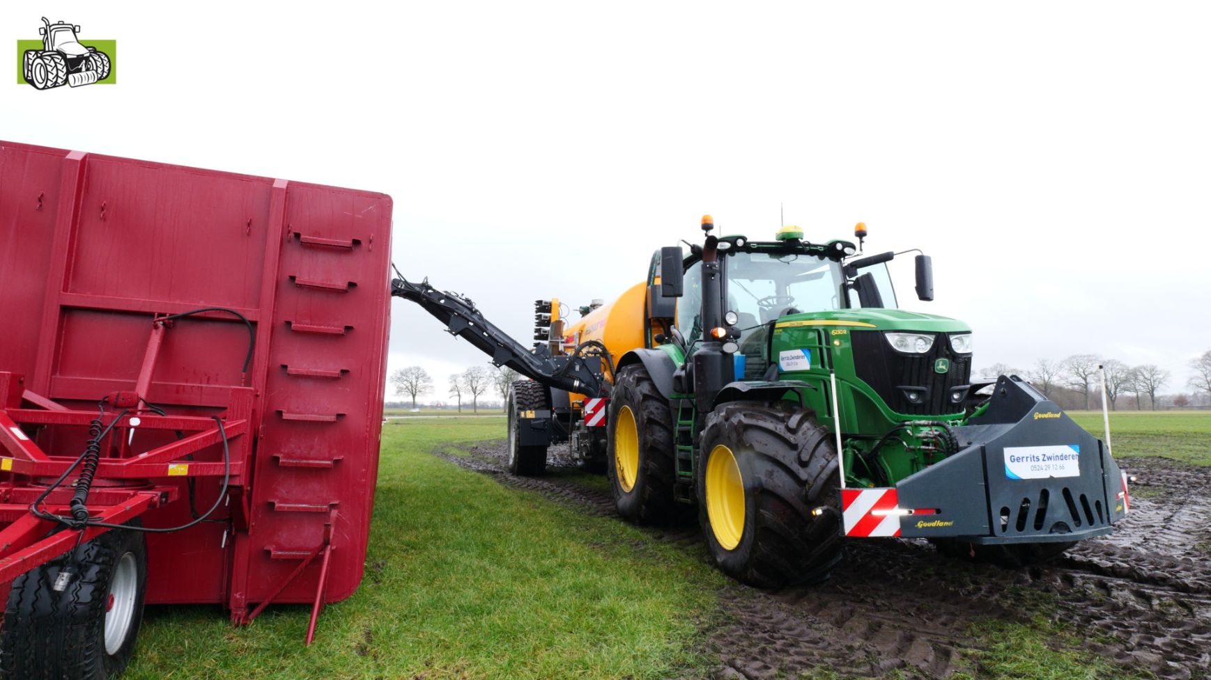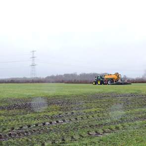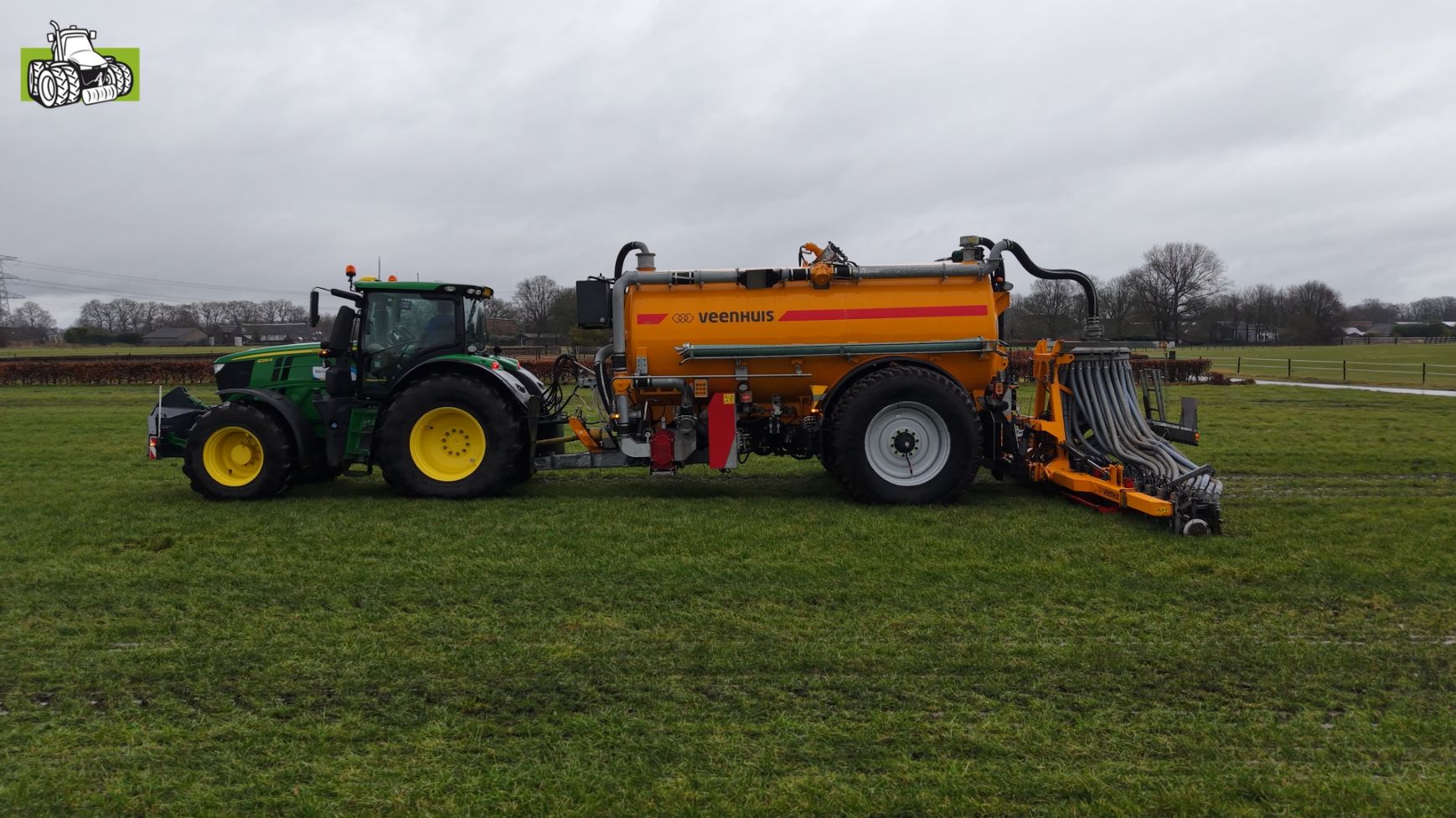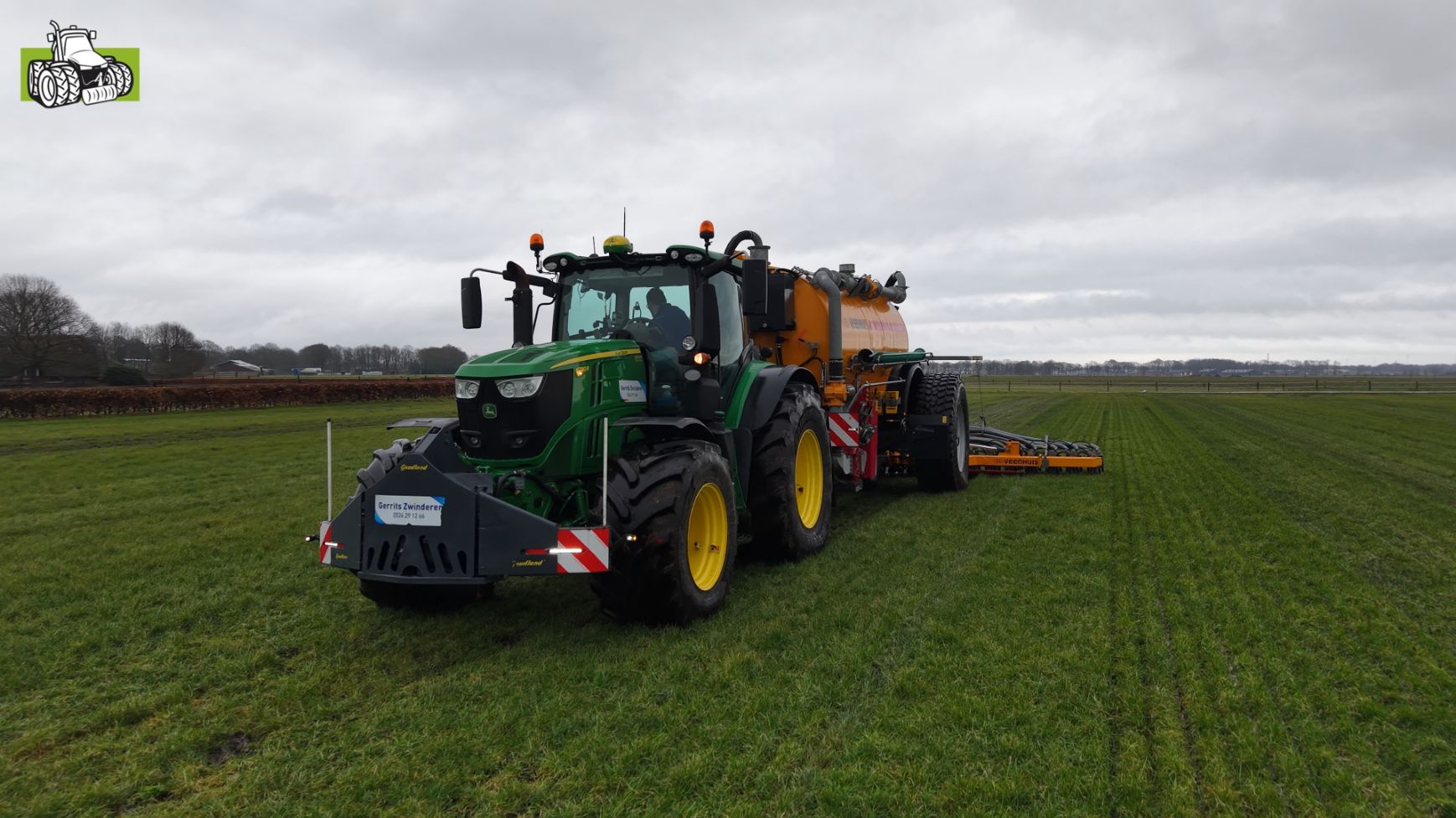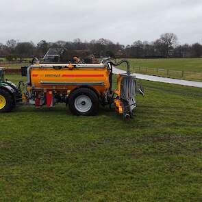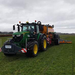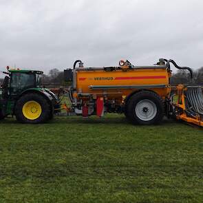 Loonbedrijf Gerrits uit Zwinderen kon vandaag de eerste mest uitrijden van 2026 met de John Deere 6230R met Veenhuis-tank.