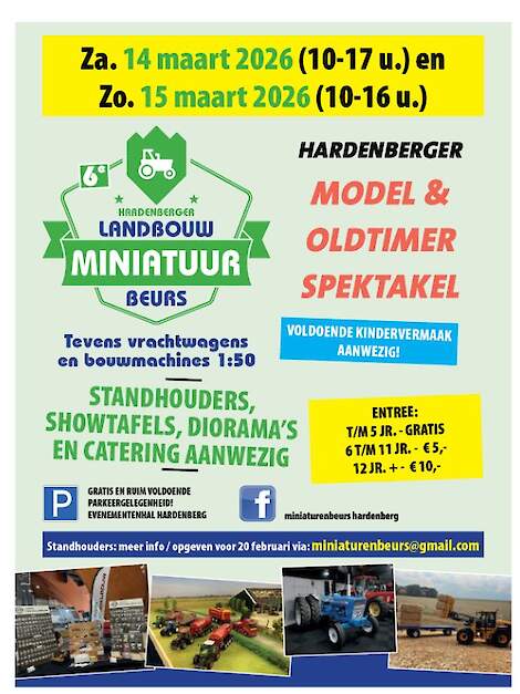 In het weekend van 14 en 15 maart 2026 staat de Evenementenhal in Hardenberg weer in het teken van de Landbouw Miniaturen Beurs en het Model & Oldtimer Spektakel voor tractoren en vrachtwagens.