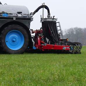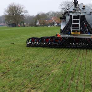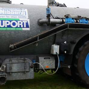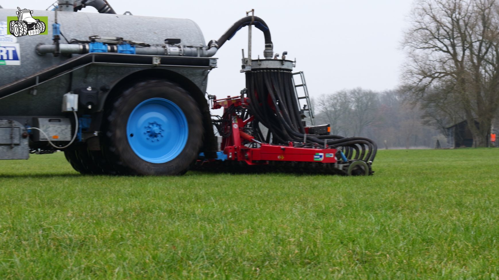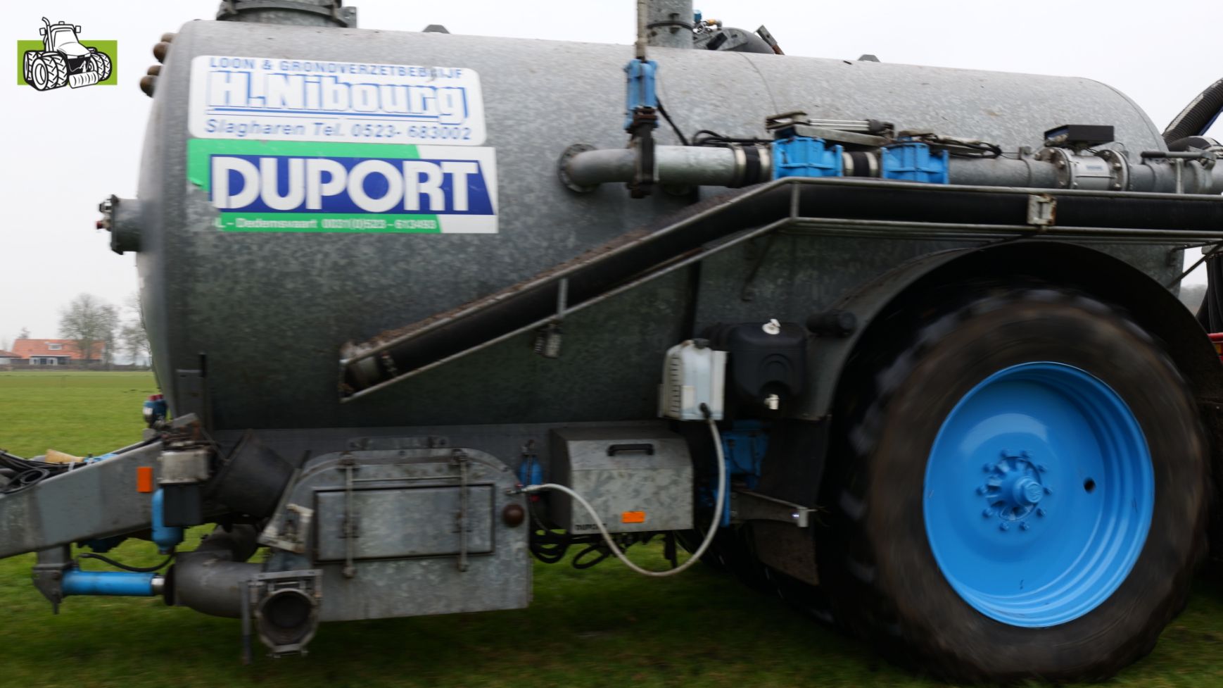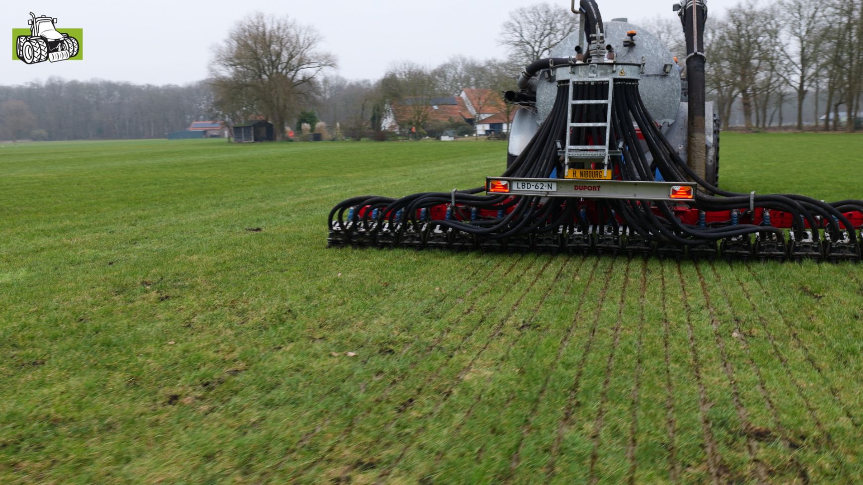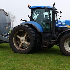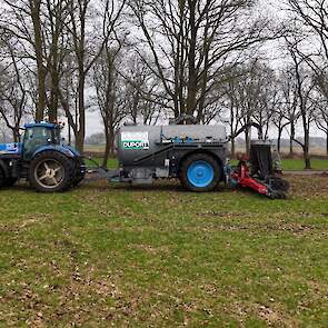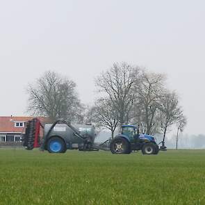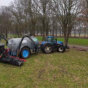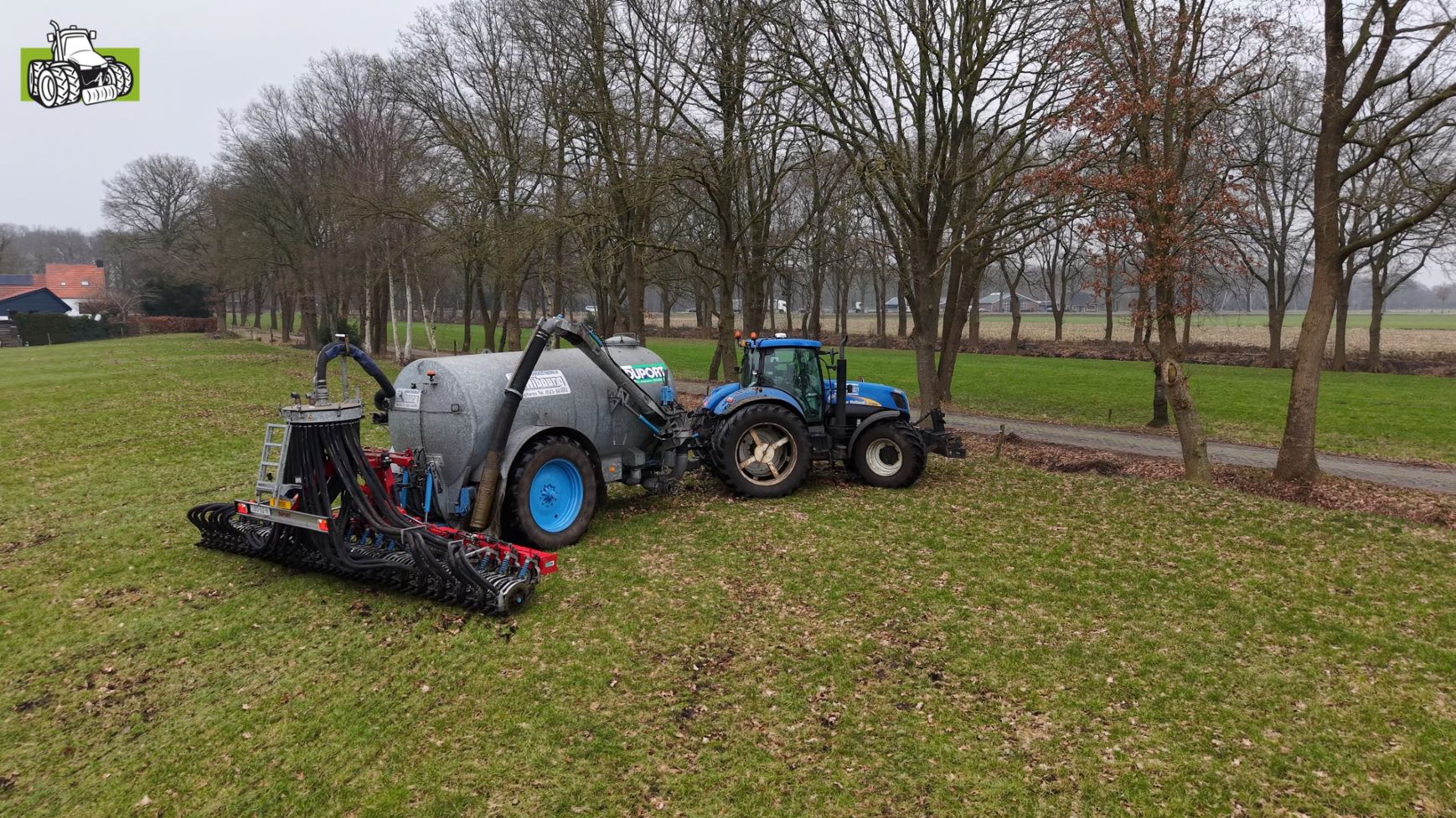 Grasland bemesten door loonbedrijf Nibourg uit Slagharen met de New Holland T7050 met Duport-tank en Duport-bemester.