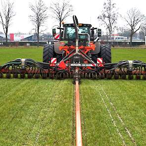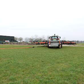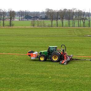 Een verdeelunit en sleepslangen achter de bemester (Schouten)
