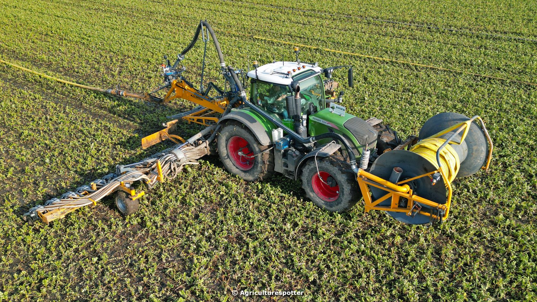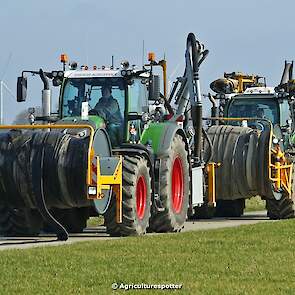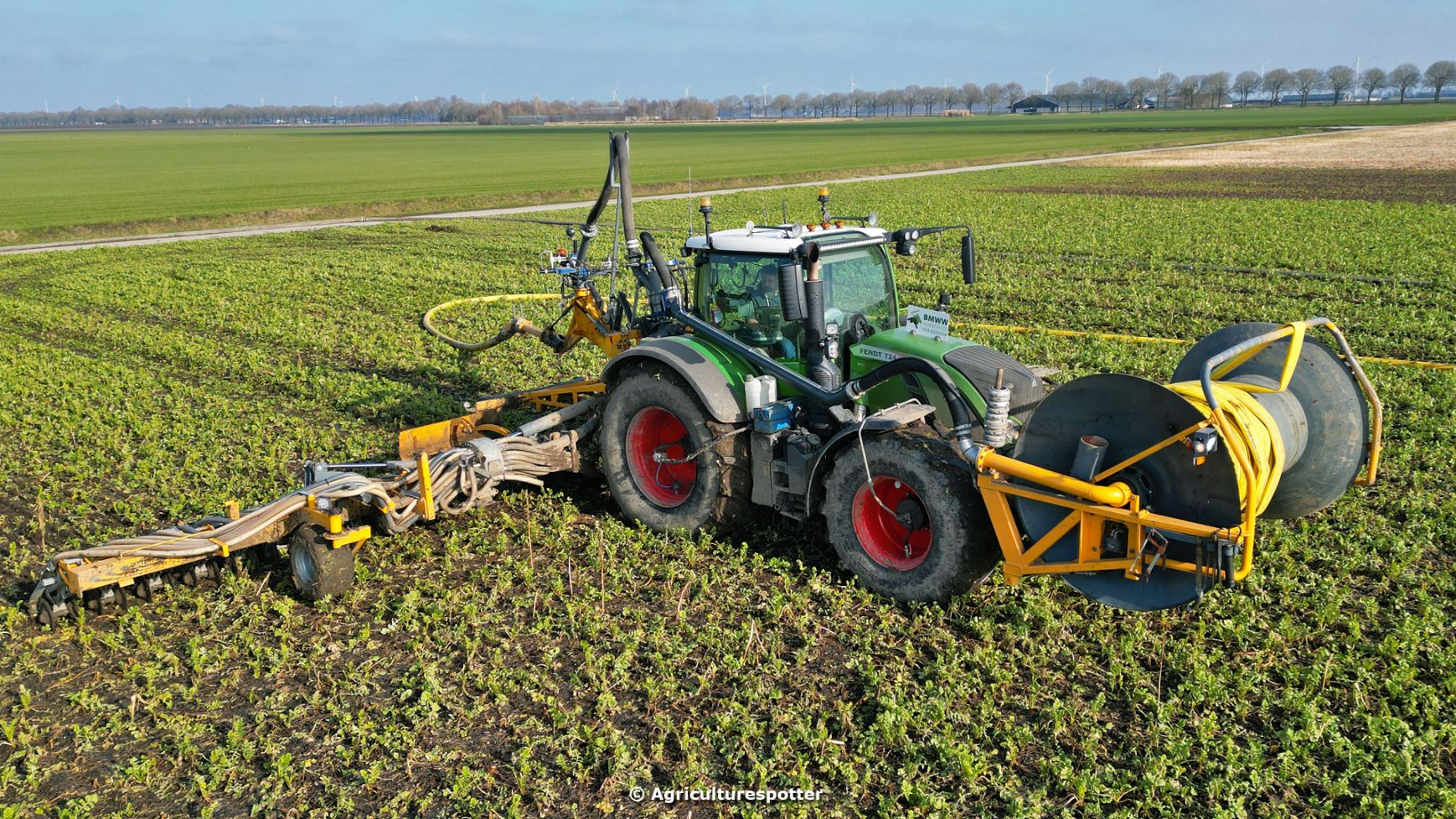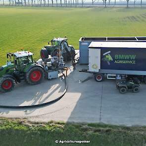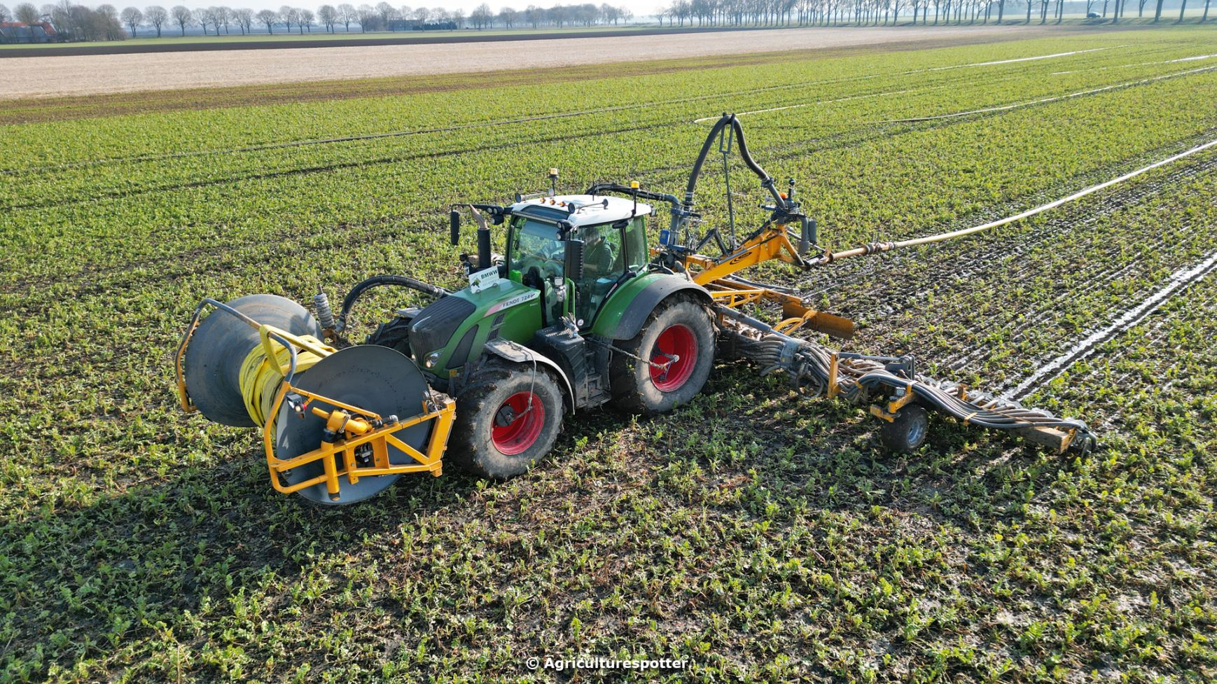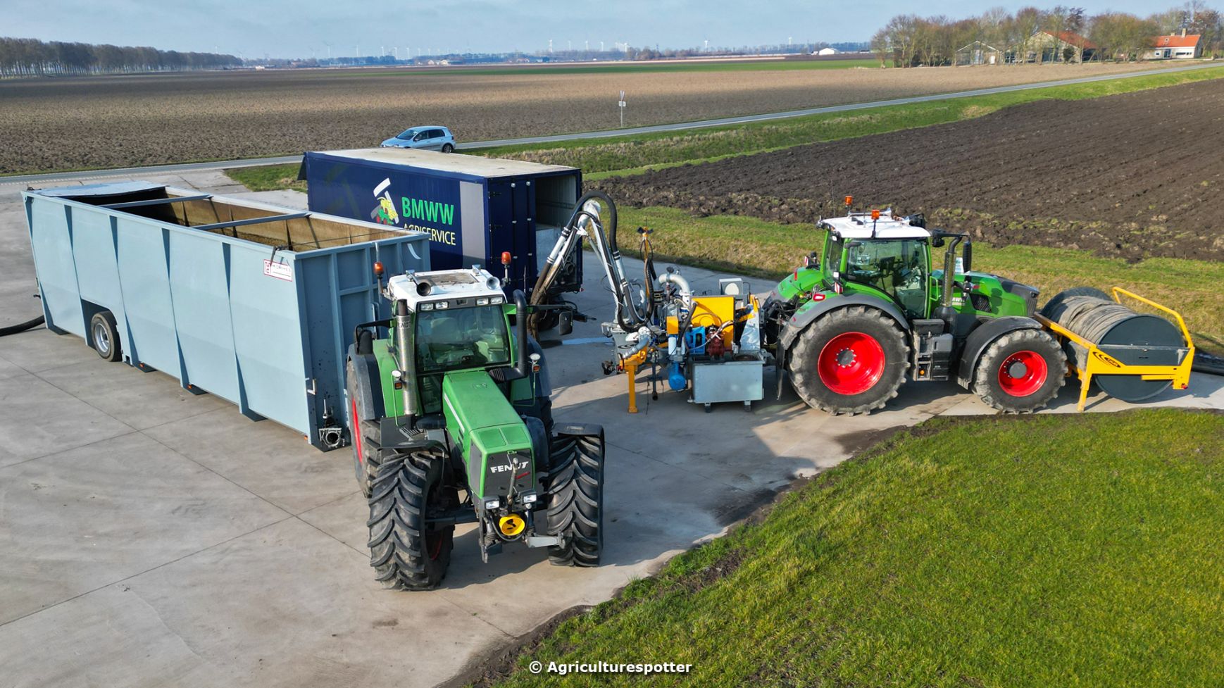 Sleepslangbemesten in Biddinghuizen met een Fendt 728 Vario en een Fendt 724 Vario met een Tjalma-sleepslangbemester van BMWW Agriservice BV uit Nijkerkerveen.