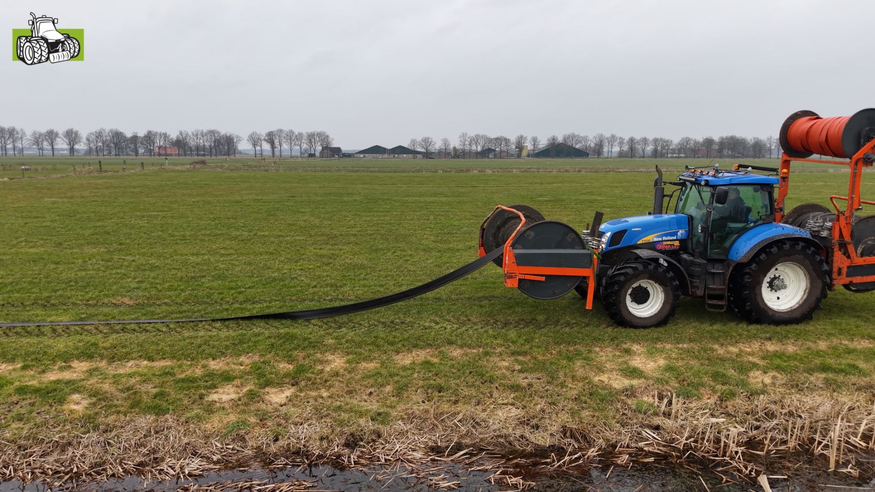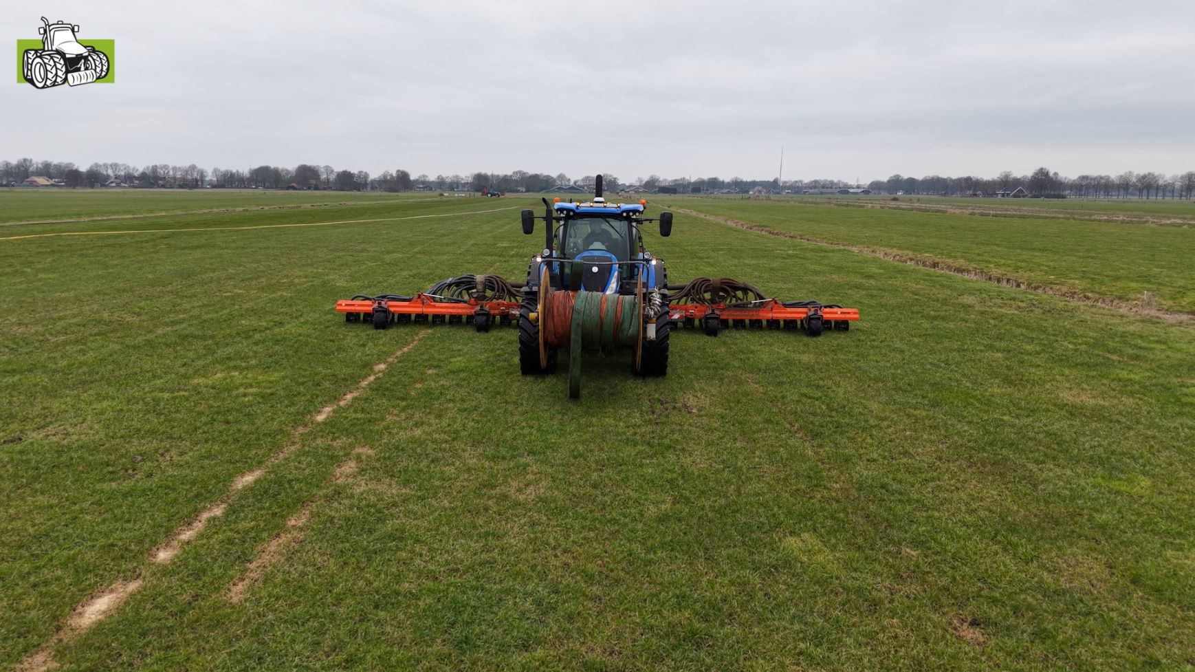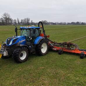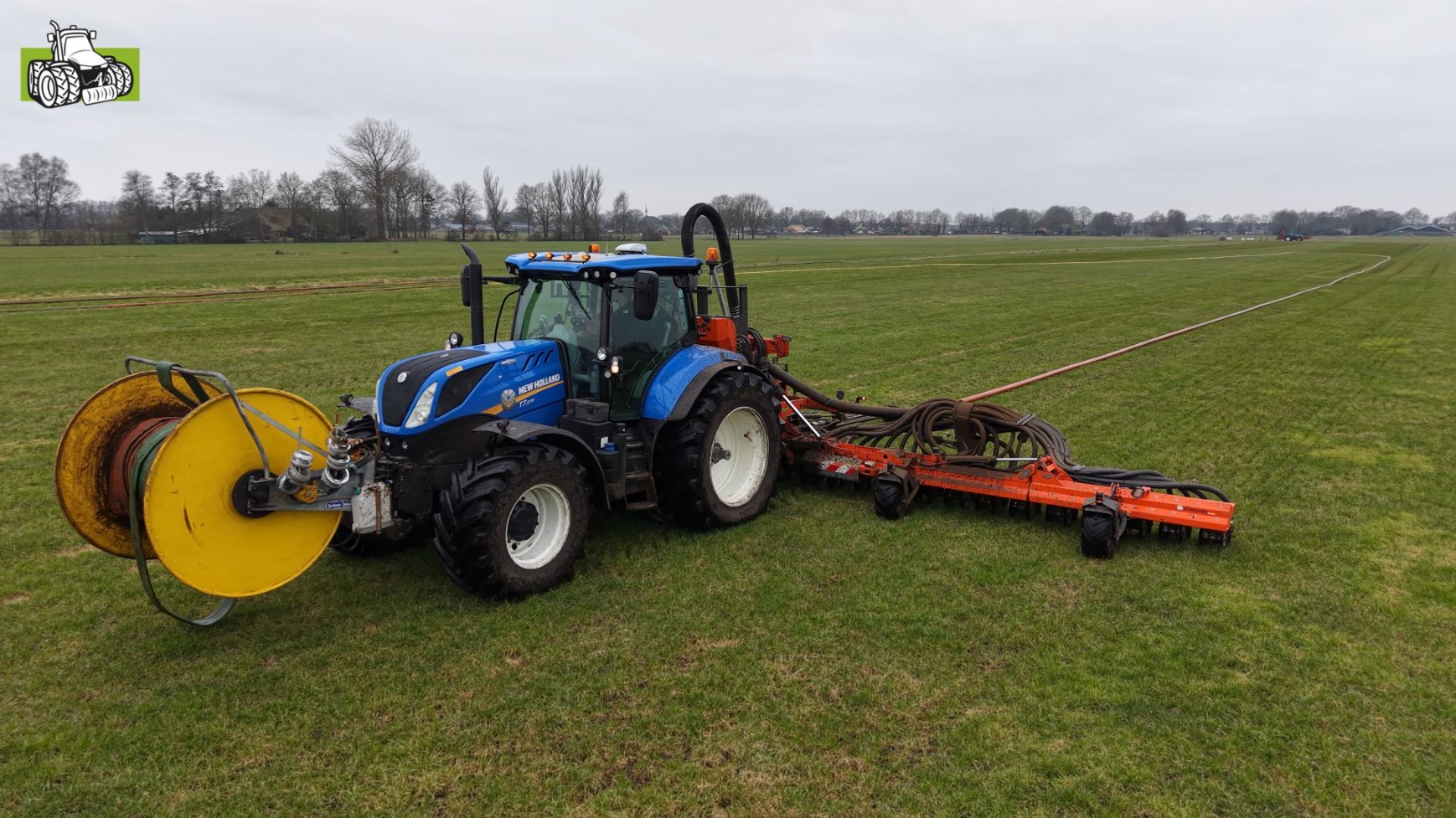 De New Holland met Schouten-bemester maakt rondes over het grasland in Alteveer