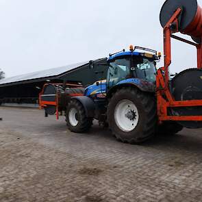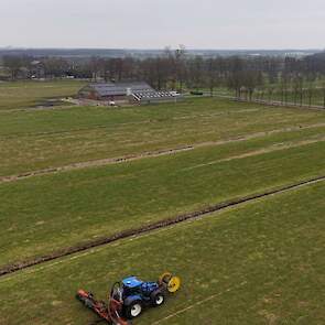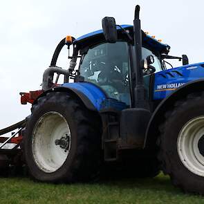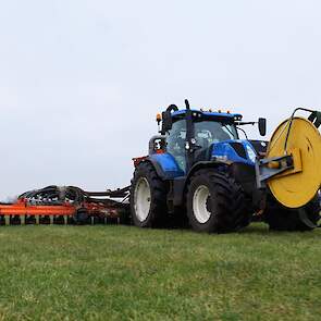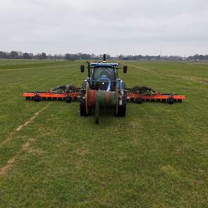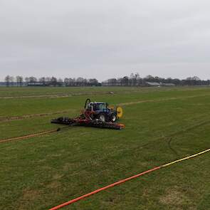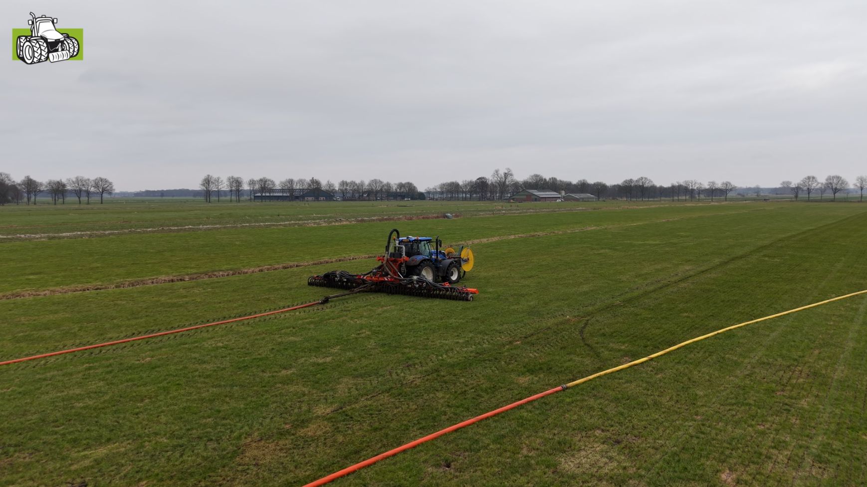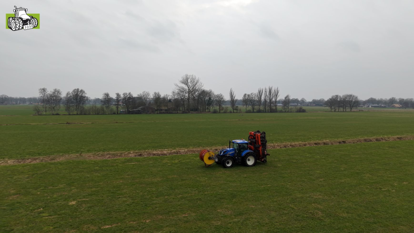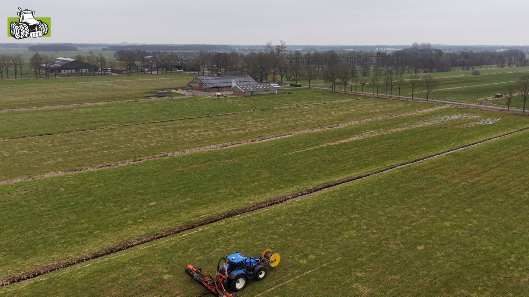 De New Holland met Schouten-bemester maakt rondes over het grasland in Alteveer