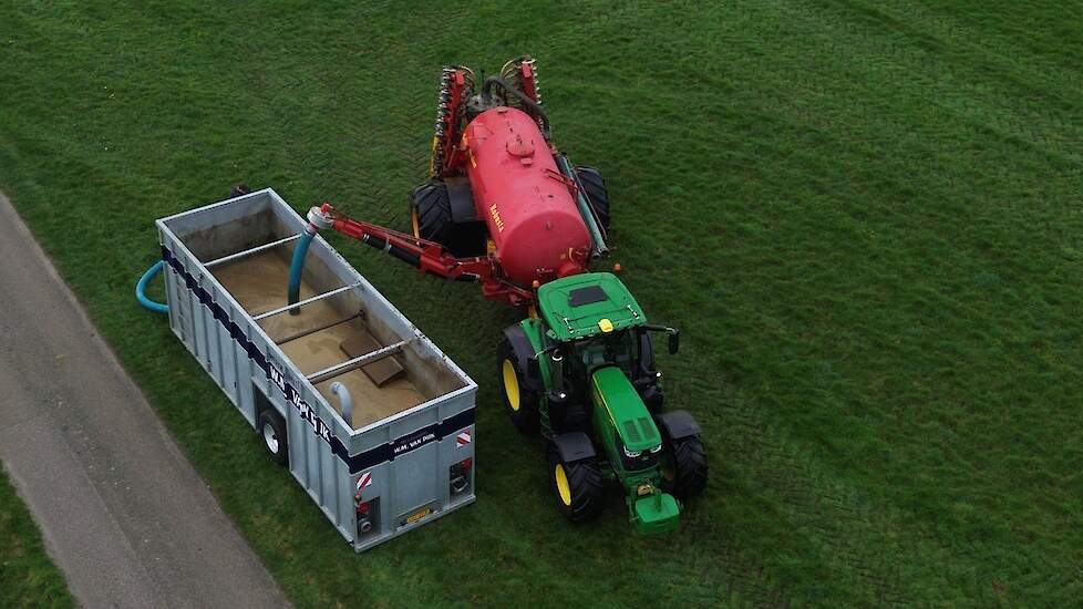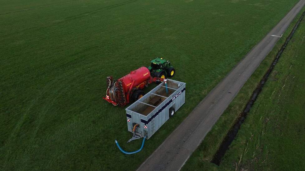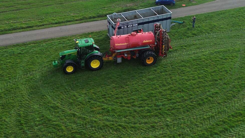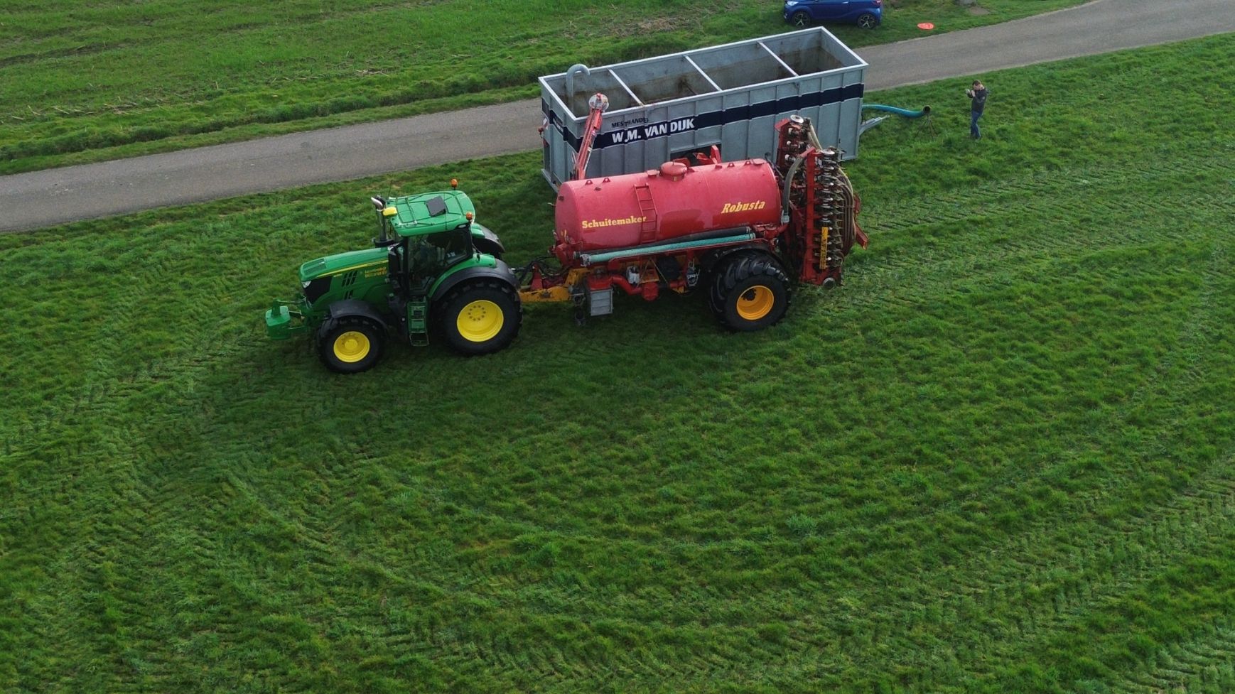 Loonbedrijf Bouwheer is bezig met injecteren. Dit gebeurt met een John Deere 6210R met een Schuitemaker Robusta. De mest werd aangevoerd met de eigen Volvo van het loonbedrijf.