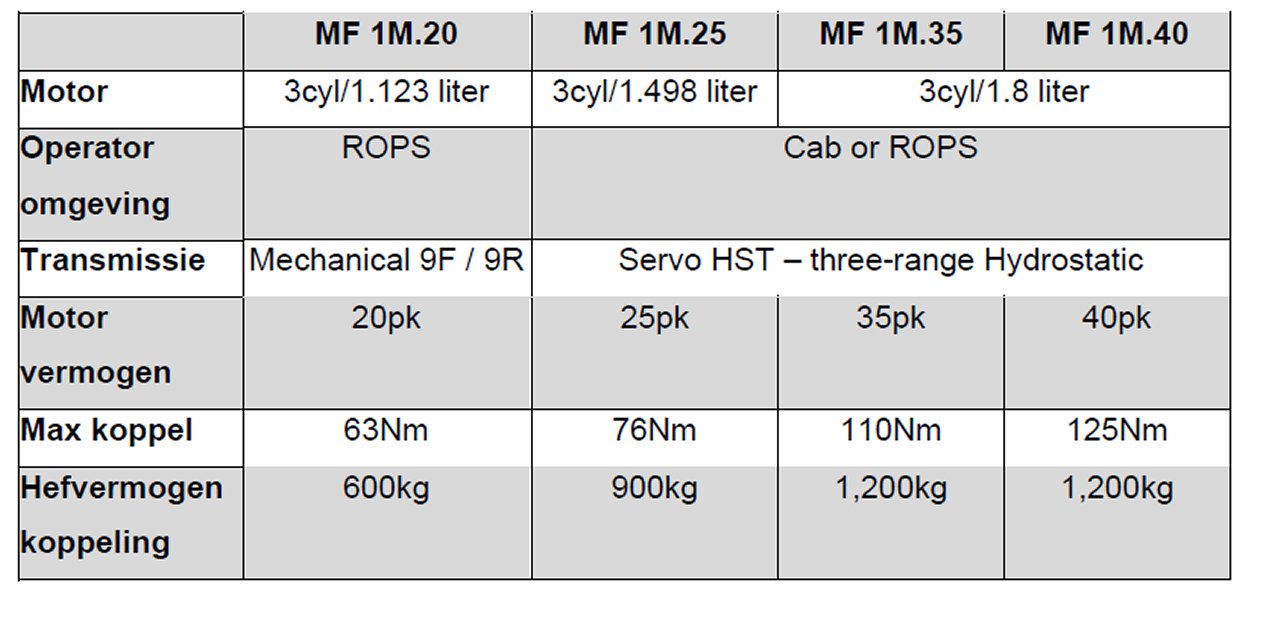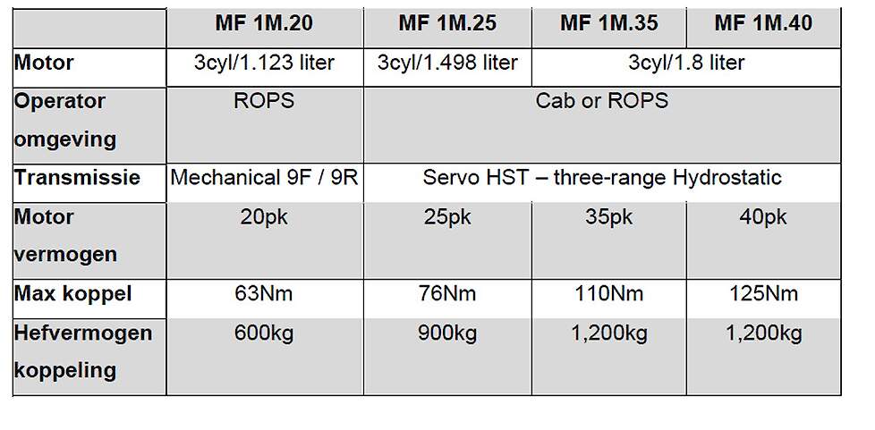 De complete MF 1M-serie bestaat uit vier modellen. Deze omvatten de onlangs gelanceerde MF 1M.20 (20 pk) met een open bestuurdersplatform en ROPS, plus een mechanische versnellingsbak, en de MF 1M.25 (25 pk) met hydrostatische transmissie en keuze uit een open bestuurdersplatform en ROPS of een stille cabine met airconditioning. De nieuwe MF 1M.35 (35 pk) vervangt de vorige MF 1735 M en de MF 1M.40 (40 pk) vervangt de MF 1740 M. Beide zijn uitgerust met een hydrostatische transmissie en een keuze uit een ROPS-platform of cabine. De drie grotere modellen zijn standaard uitgerust met een 540 rpm en 750 rpm (540 eco) aftakas, met elektrohydraulische bediening en activering via een externe schakelaar op het spatbord, wat extra gemak biedt bij stationaire werkzaamheden. Een hydraulische olietoevoer tot 41,5 liter/min is standaard.