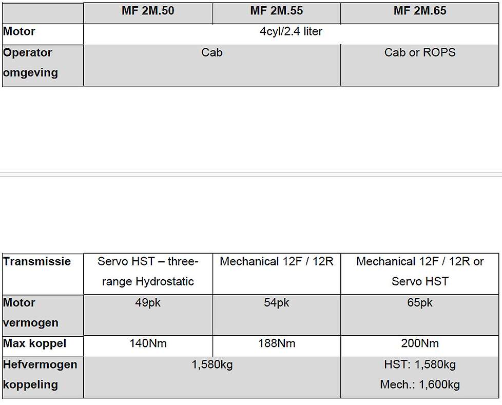 Er is keuze uit drie modellen uit de MF 2M-serie: de MF 2M.50 (49 pk), die de vorige MF 1750 M vervangt, de MF 2M.55 (54 pk), die de MF 1755 M opvolgt, en de MF 2M.65 (65 pk), die de MF 1765 M vervangt. Alle modellen zijn standaard uitgerust met een viercilindermotor en een inschakelbare vierwielaandrijving.