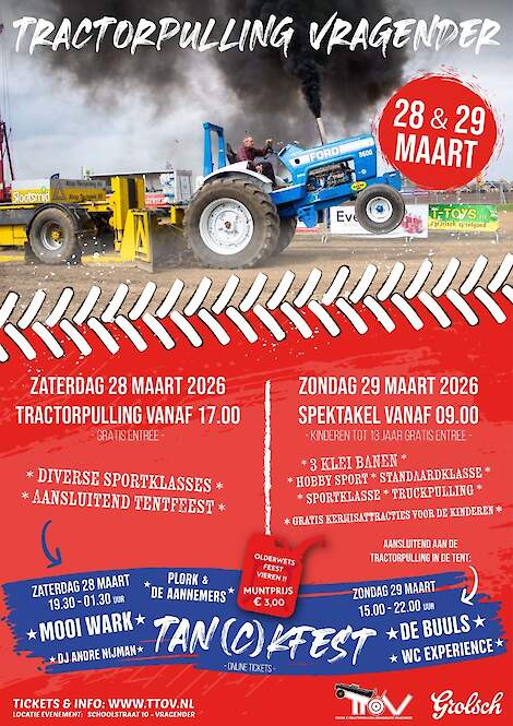 Bestel de kaarten voor de trekkertrek of het Tan(c)kfest op https://www.ttov.nl/tickets. en houd https://www.facebook.com/ttovvragender in de gaten voor het laatste nieuws rondom de trekkertrek in Vragender.