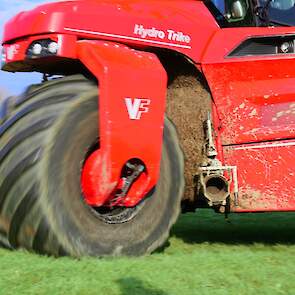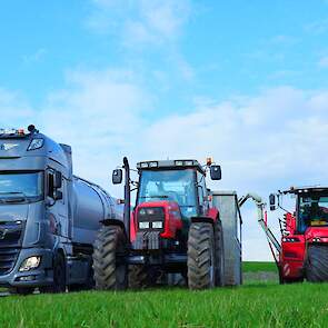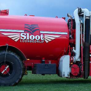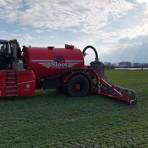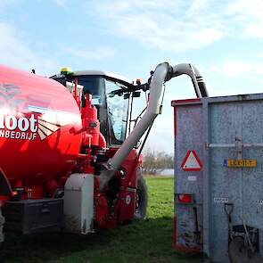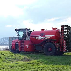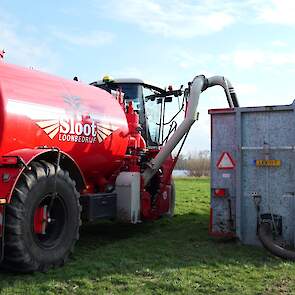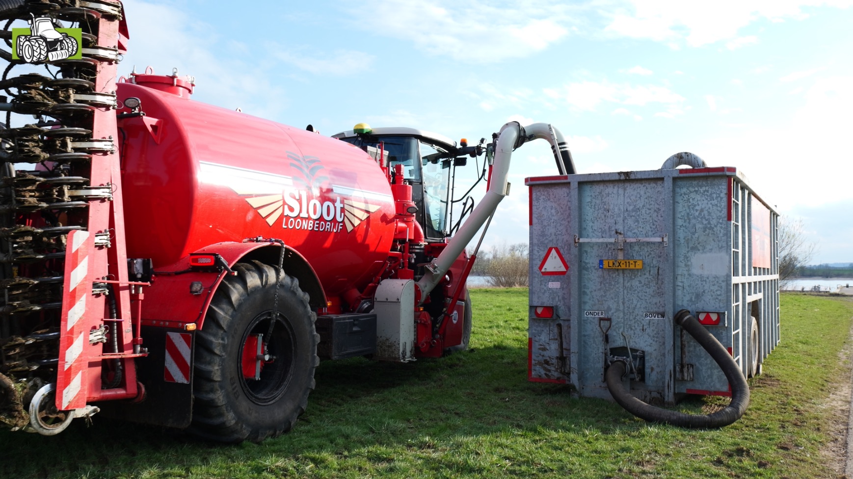 Loonbedrijf Sloot BV uit Aerdt volop aan het bemesten met de Vervaet. De eigen vrachtwagens van het bedrijf zorgen voor de aanvoer van de drijfmest.