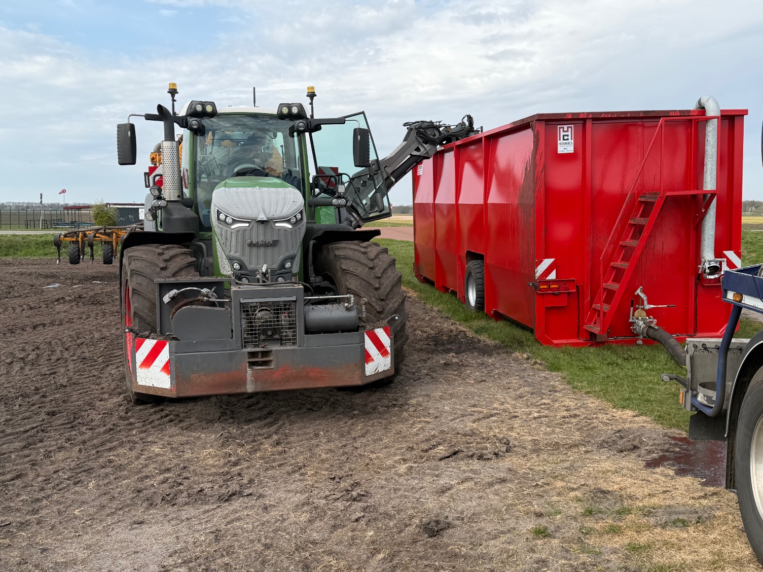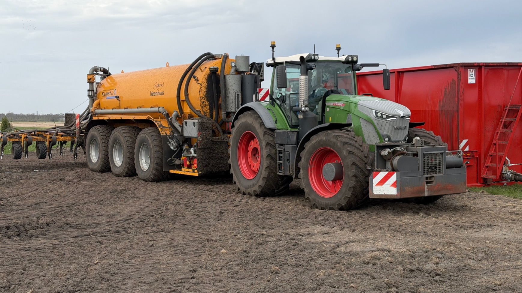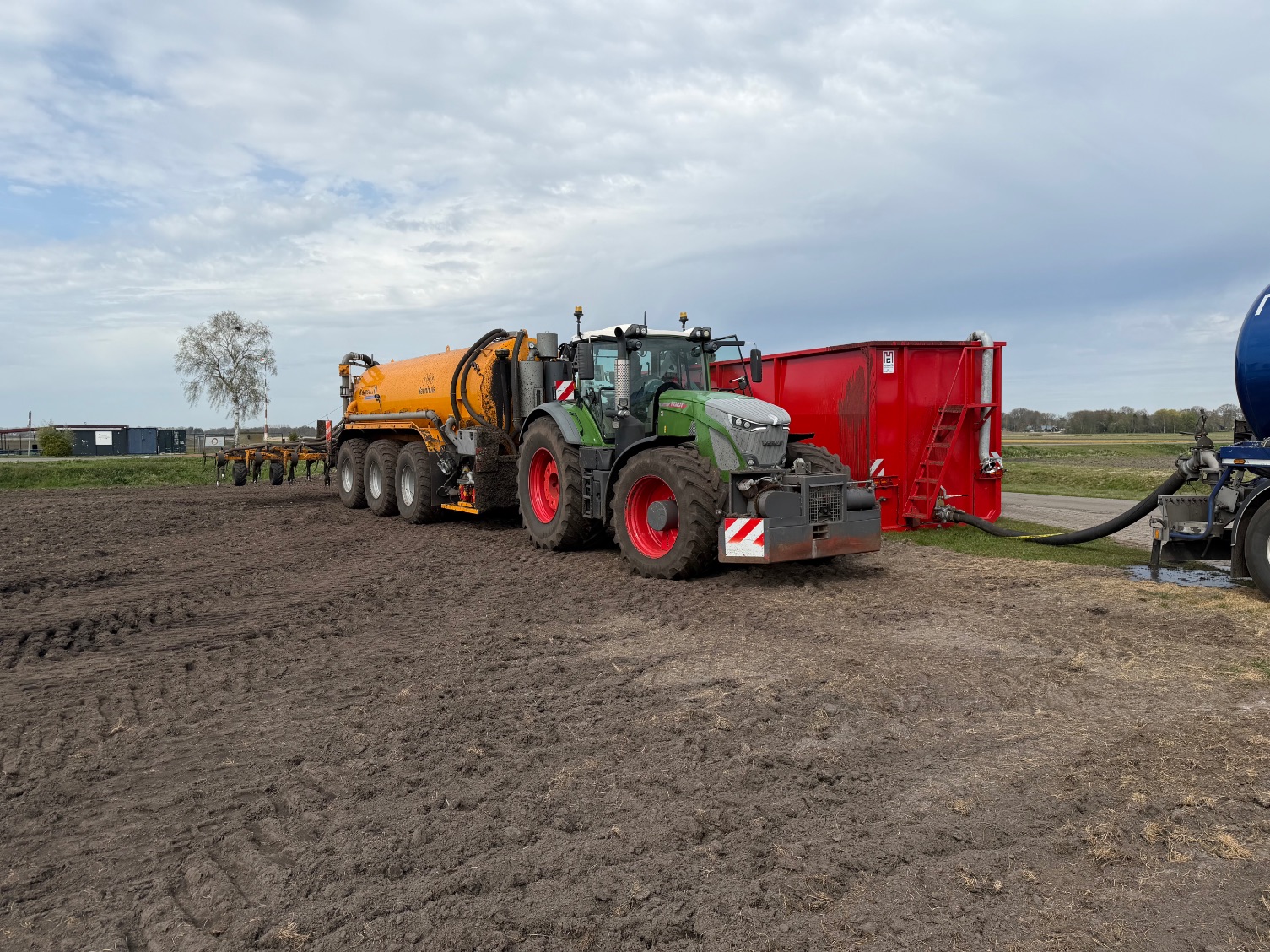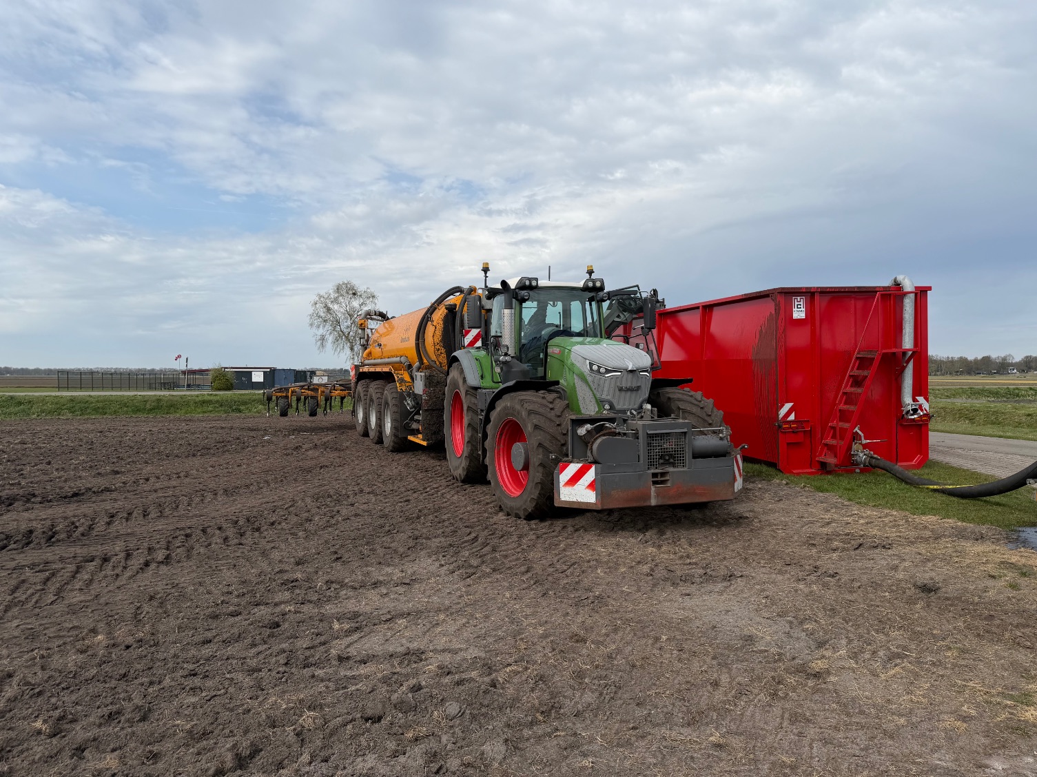 Bouwland injecteren door loonbedrijf Kamst uit Erica met een Fendt 942 Vario en een Veenhuis Tridem 26,5 kuub-mesttank. De aanvoer van de mest gebeurde met twee vrachtauto’s uit een nabijgelegen mestput, waarbij de mest werd overgepompt in een Hommes Constructies-mestcontainer.