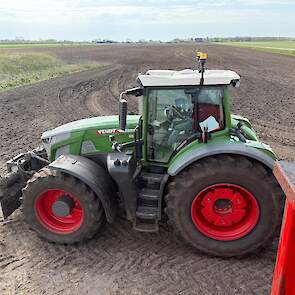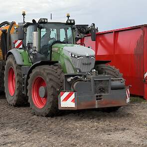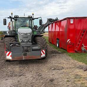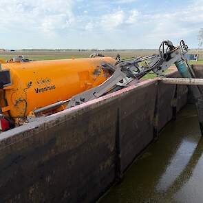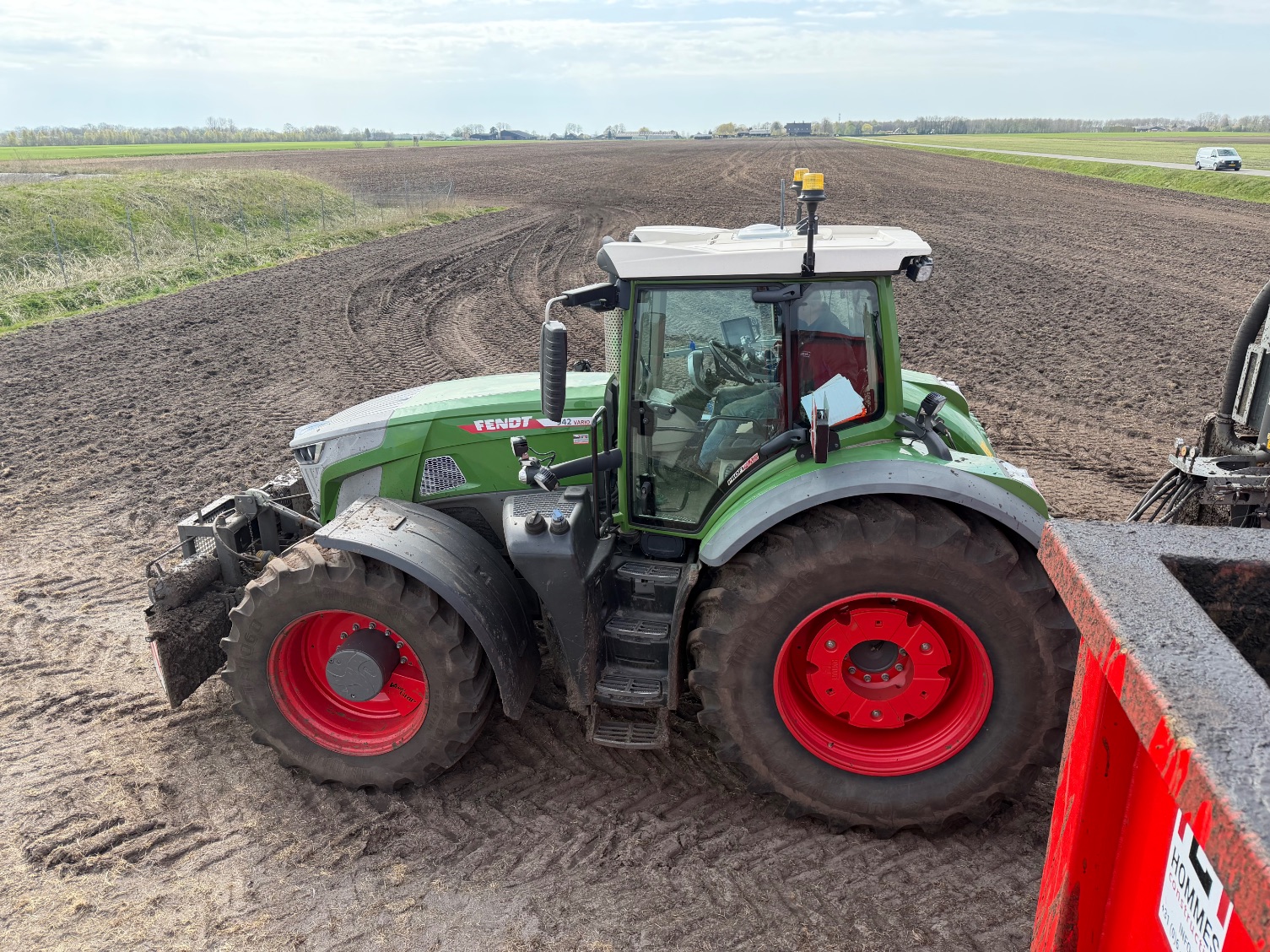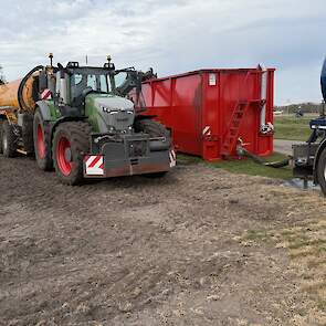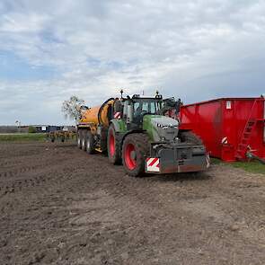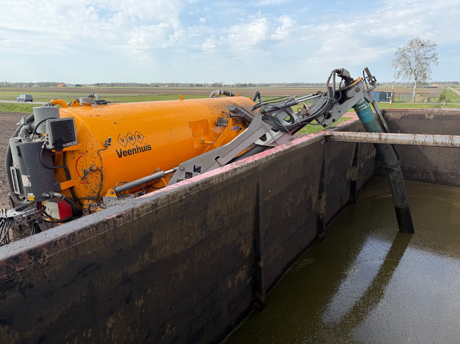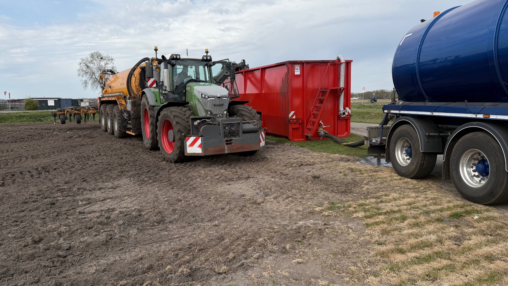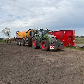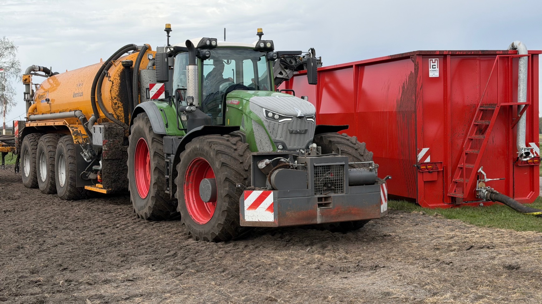 Bouwland injecteren door loonbedrijf Kamst uit Erica met een Fendt 942 Vario en een Veenhuis Tridem 26,5 kuub-mesttank. De aanvoer van de mest gebeurde met twee vrachtauto’s uit een nabijgelegen mestput, waarbij de mest werd overgepompt in een Hommes Constructies-mestcontainer.