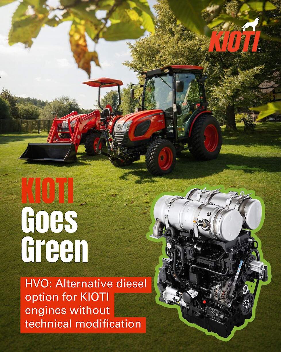 Pols, importeur van Kioti in de Benelux, meldt dat alle dieselmotoren van Kioti officieel zijn goedgekeurd voor gebruik met HVO-brandstof (Hydrotreated Vegetable Oil). Daarmee zet Kioti een belangrijke stap richting duurzamer machinegebruik binnen de landbouw-, groen- en terreinbeheerbranche.