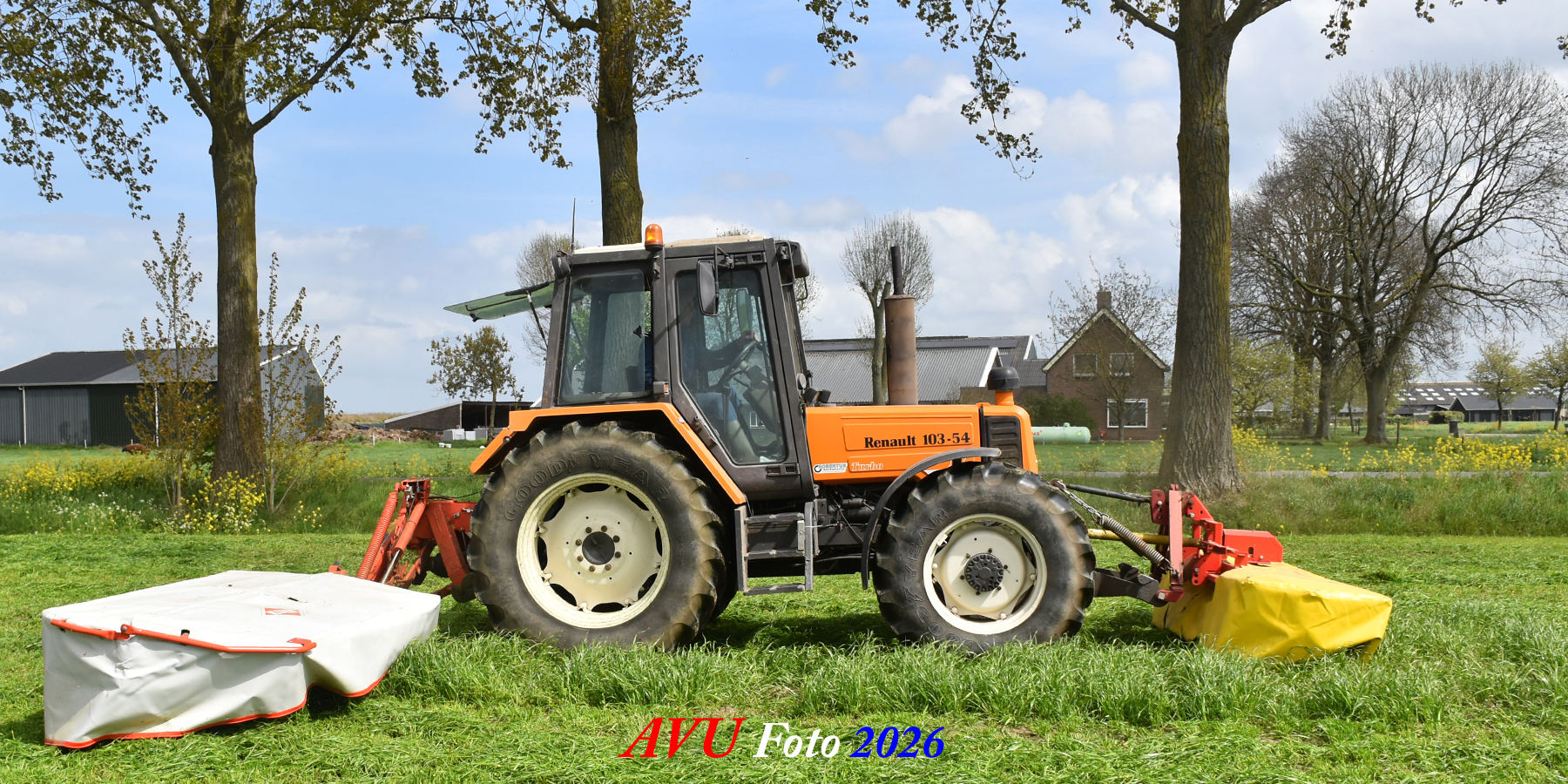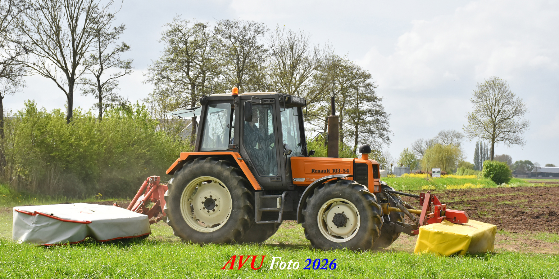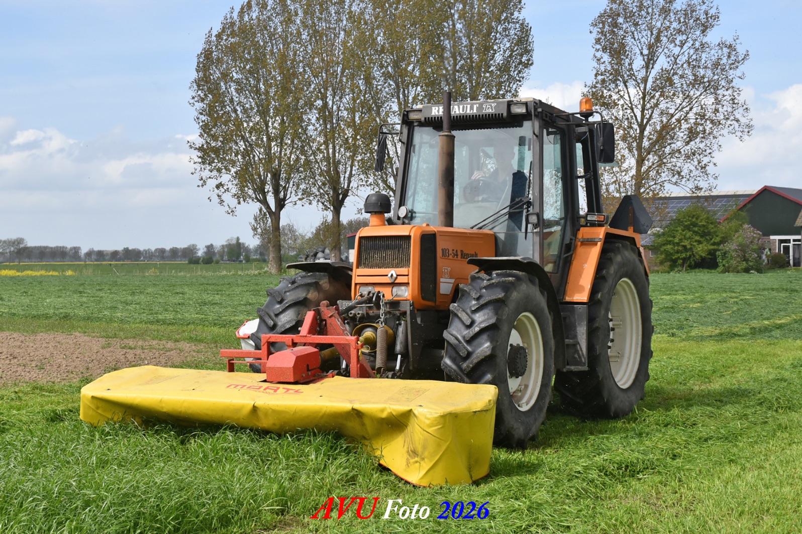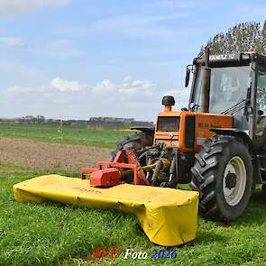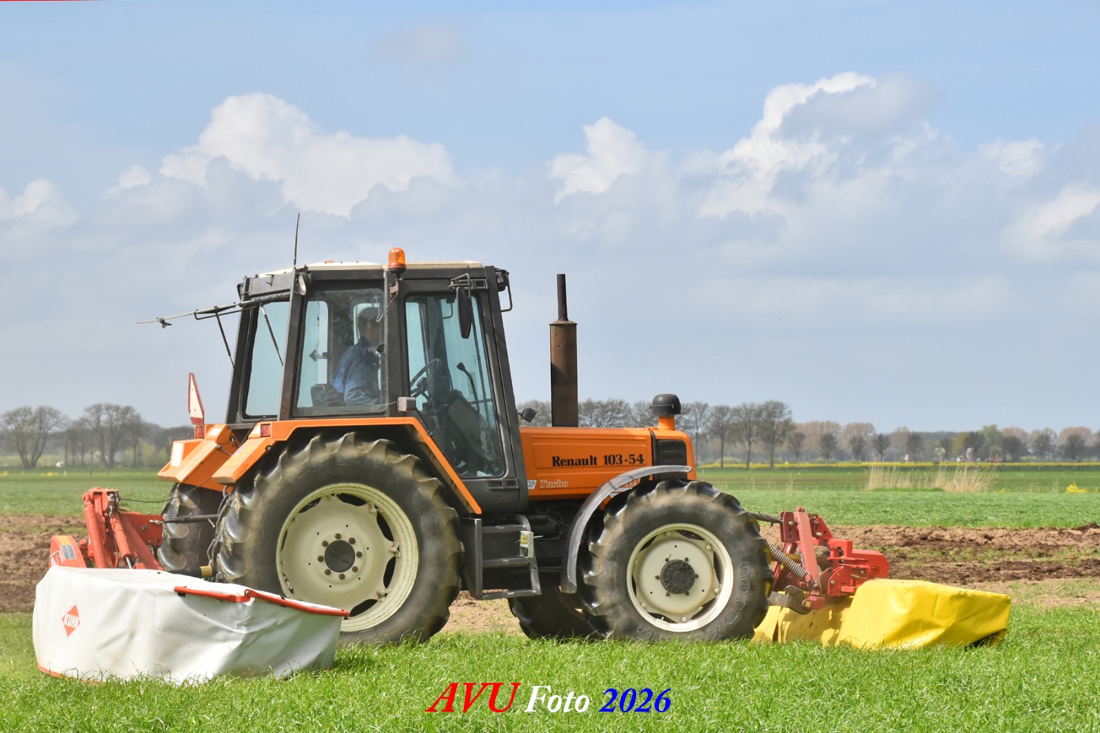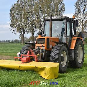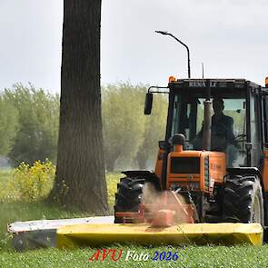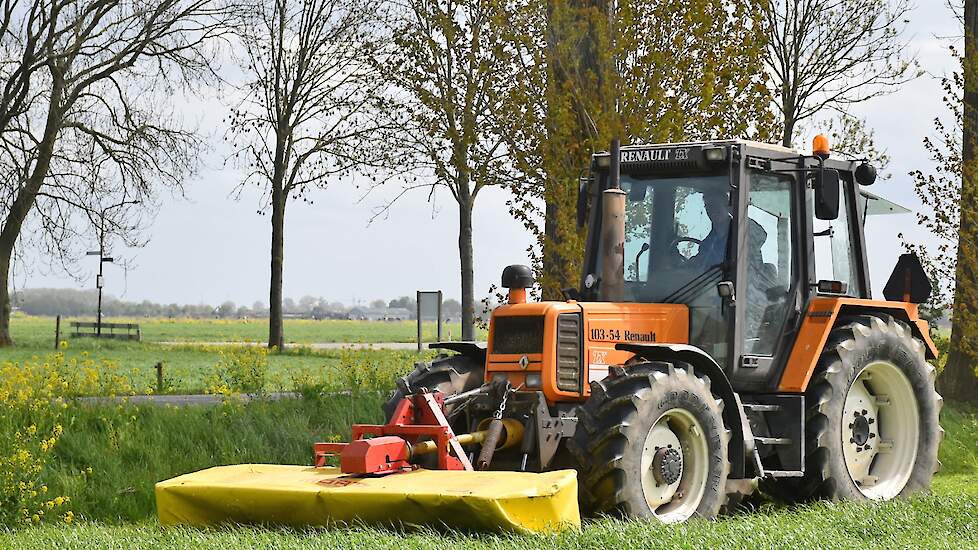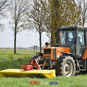 Het eerste gras maaien in Het Land van Heusden en Altena (NB) met een Reanult 103-54 met Mört-front- en Kuhn-achtermaaier.