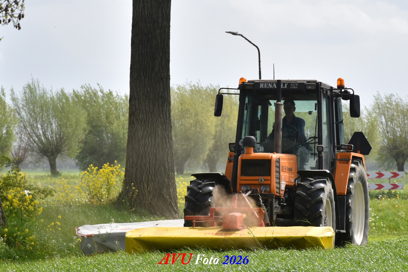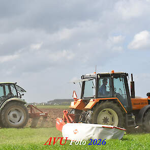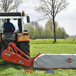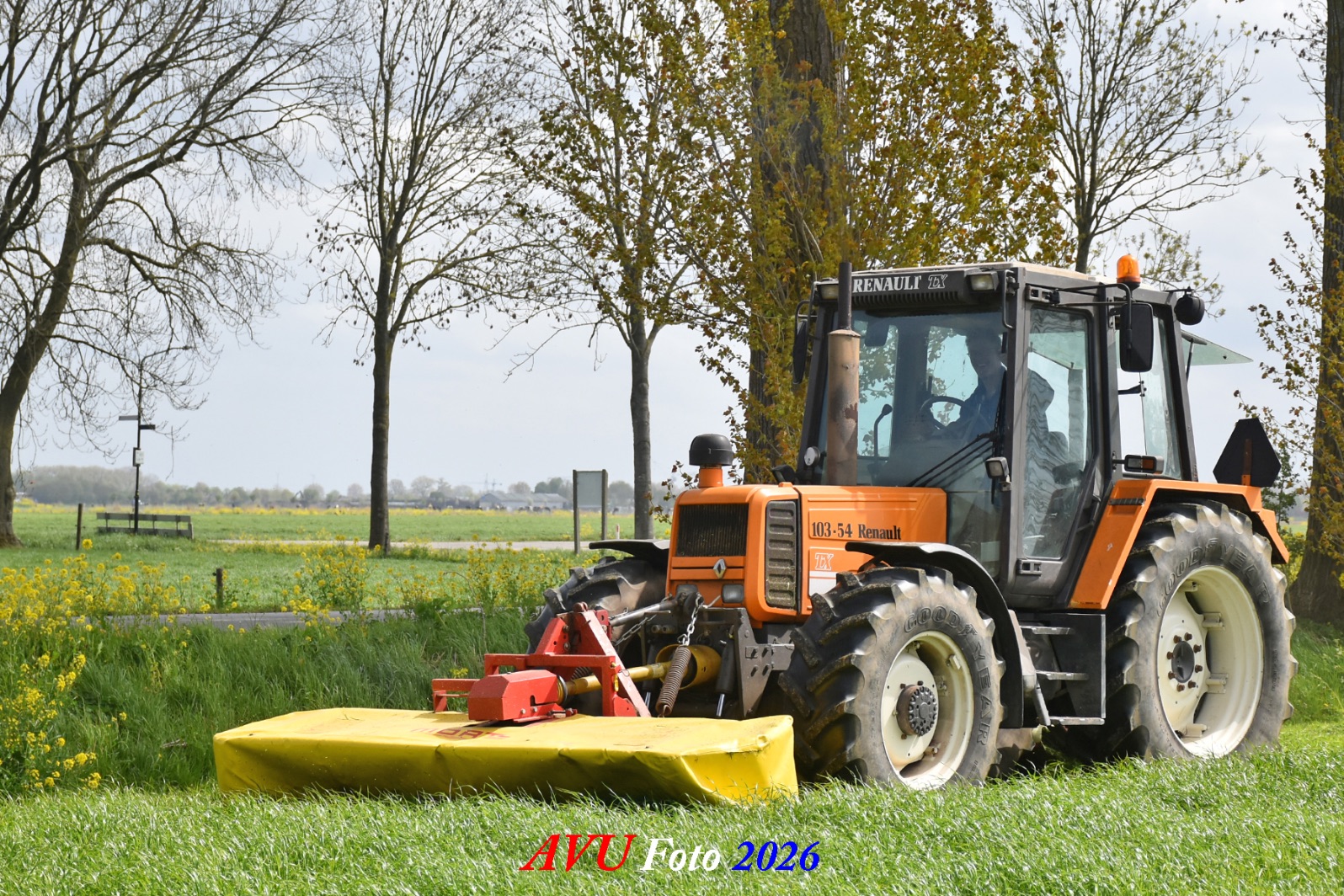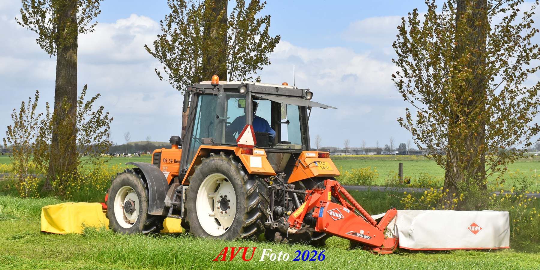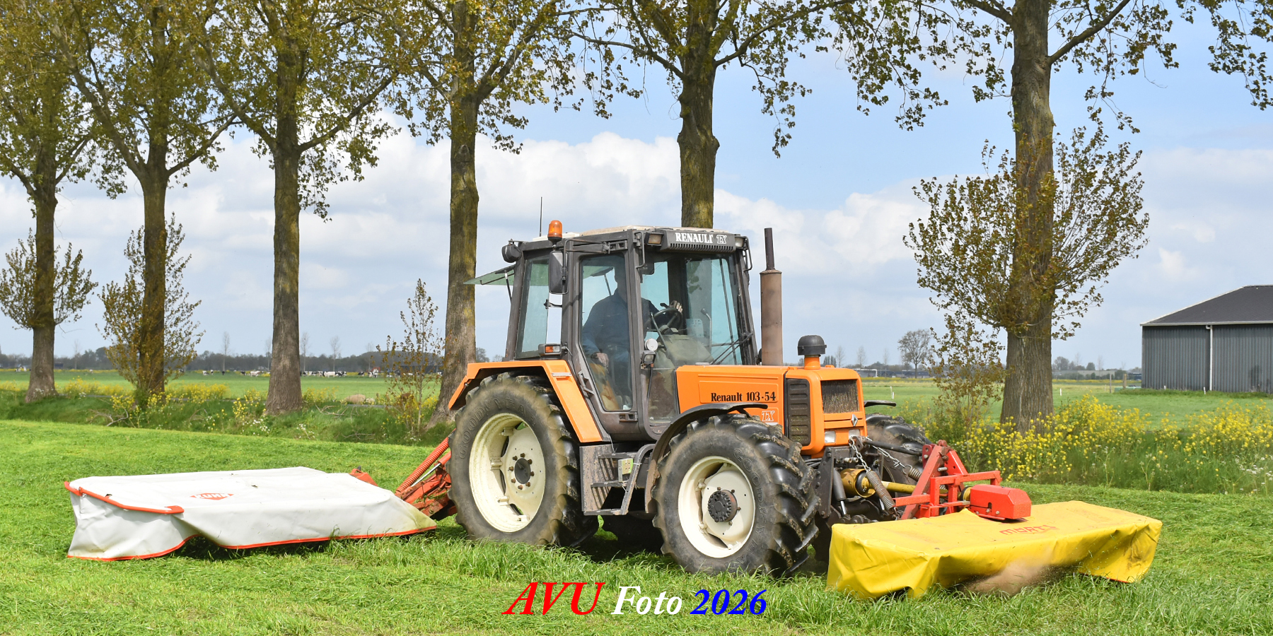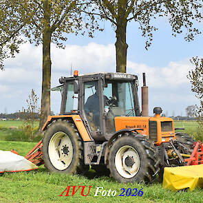 Het eerste gras maaien in Het Land van Heusden en Altena (NB) met een Reanult 103-54 met Mört-front- en Kuhn-achtermaaier.