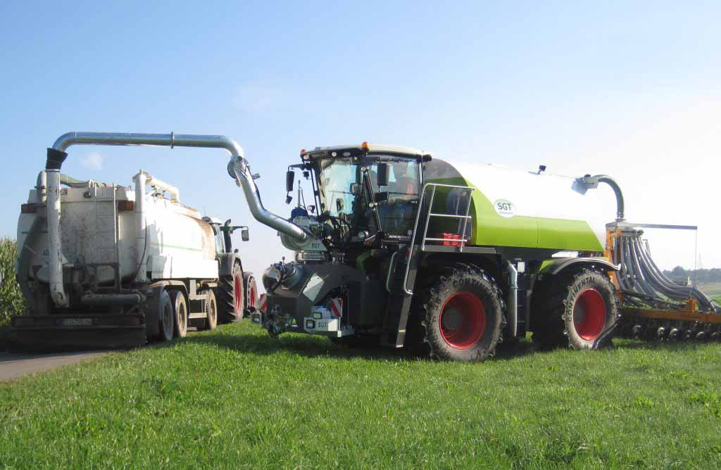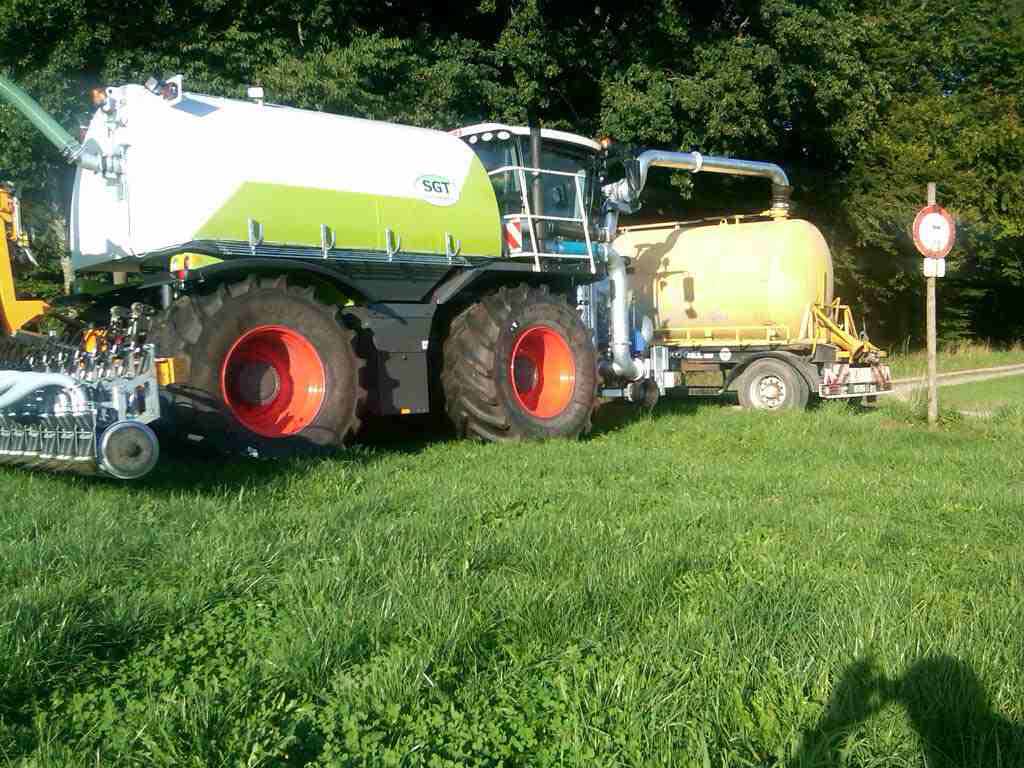 De eerste van bijna 30 verkochte Xerion,s met SGT opbouw zijn inmiddels uitgeleverd / inbedrijfgesteld en tussen de buien door ook reeds begonnen met mestuitrijden.