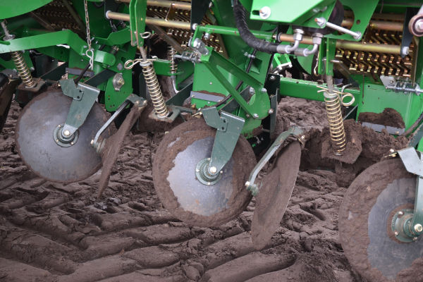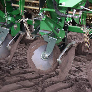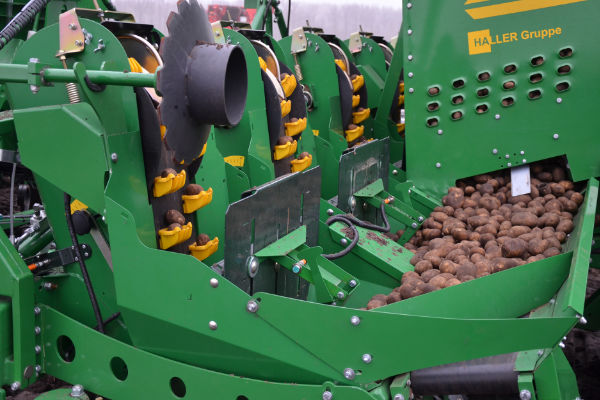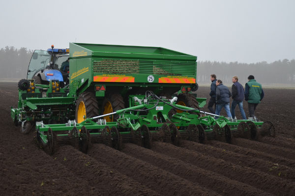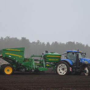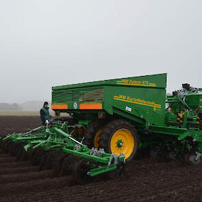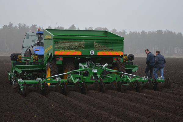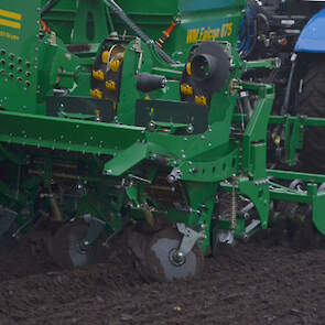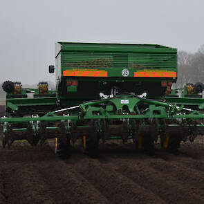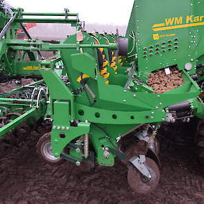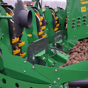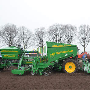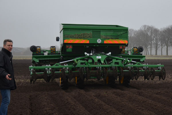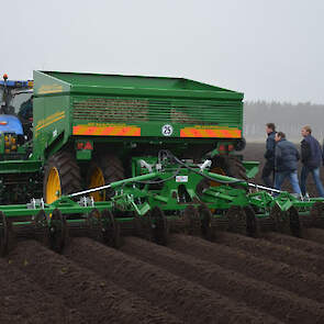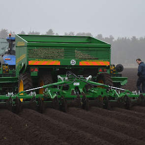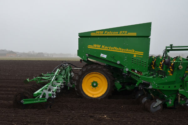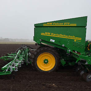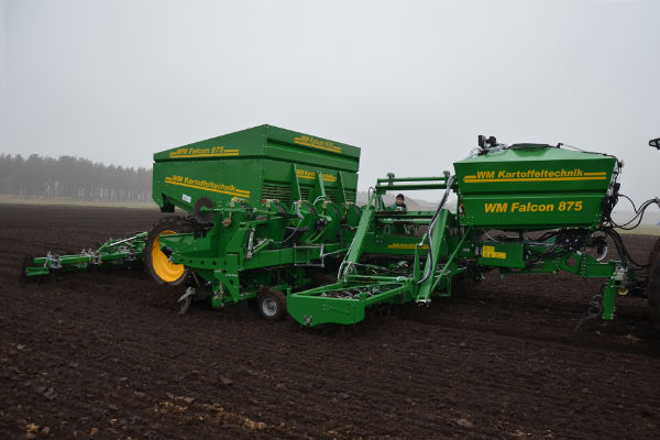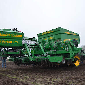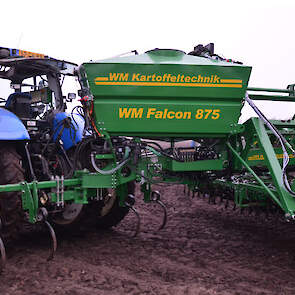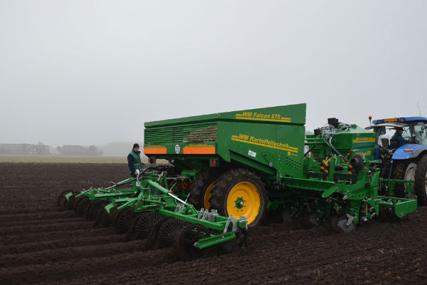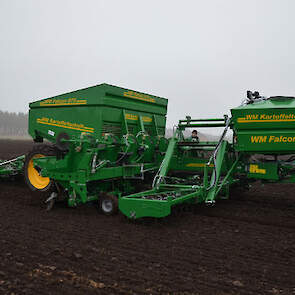 De eerste aardappelen geplant met de 8 rijige WM Kartoffeltechnik Falcon 875. In de behoorlijk vochtige grond, met hier en daar wat aanplakken werd een mooi resultaat bereikt volgens vele bekende aanwezige