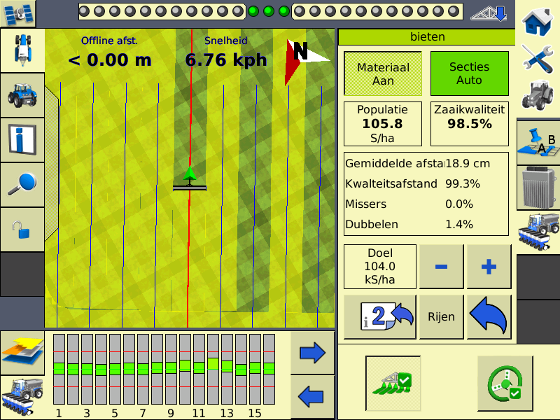 Onderin het werkscherm zie je mbv staafgrafiekjes de zaaipopulatie per rij. De groene middelste lijn is de ingestelde waarde (in dit geval 104 kS/ha >> 104.000 zaden/ha). De rode lijn eronder en erboven zijn de ingestelde alarmdrempels. Zodra de afgifte van een element boven of onder deze drempel komt geeft het systeem een waarschuwing.