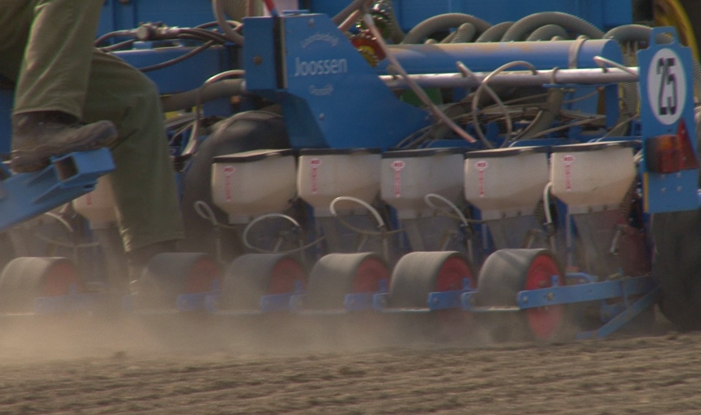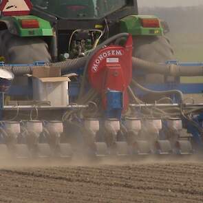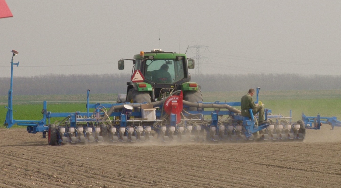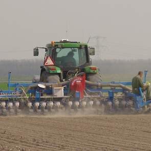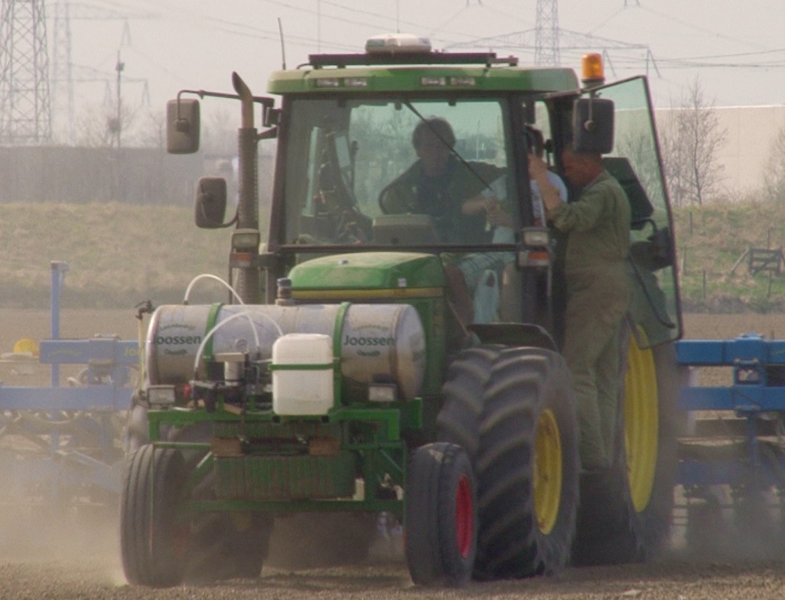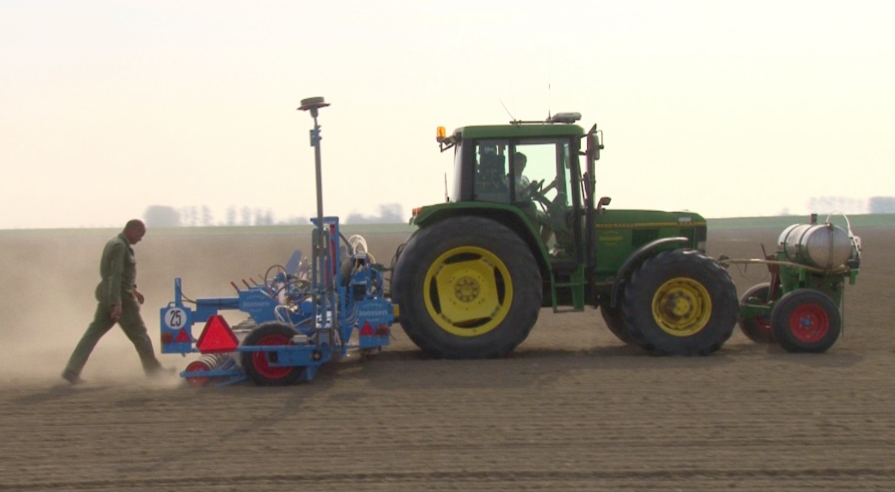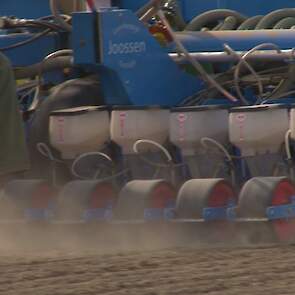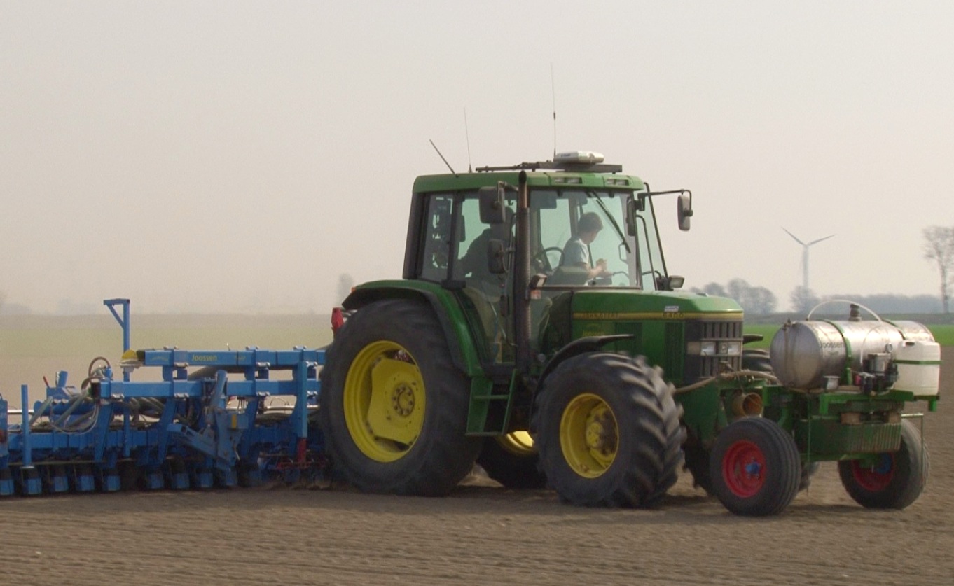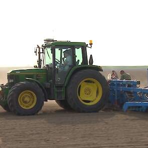 Deze John Deere is zijn land aan het inzaaien met een vrij brede zaaimachine. De Zeeuwse klei ligt er behoorlijk droog bij, maar dat maakt deze combinatie niets uit.