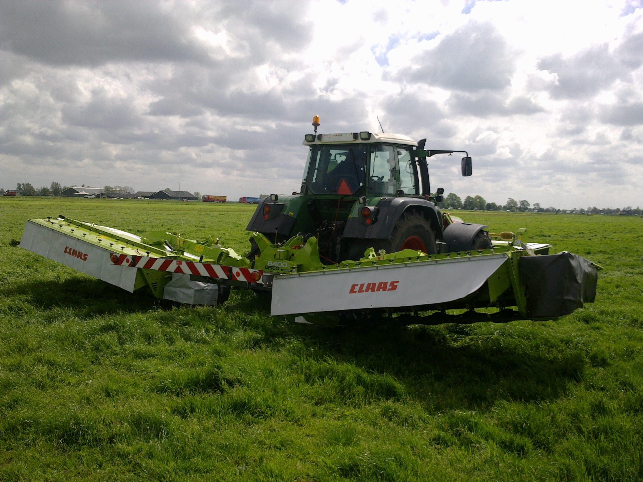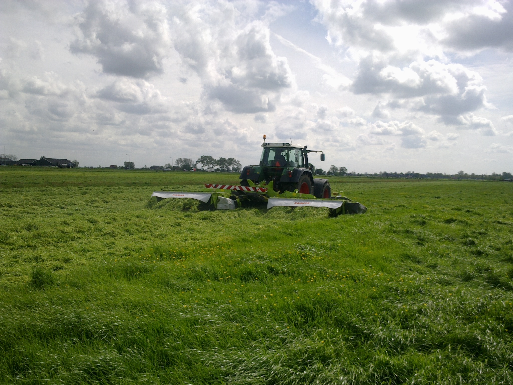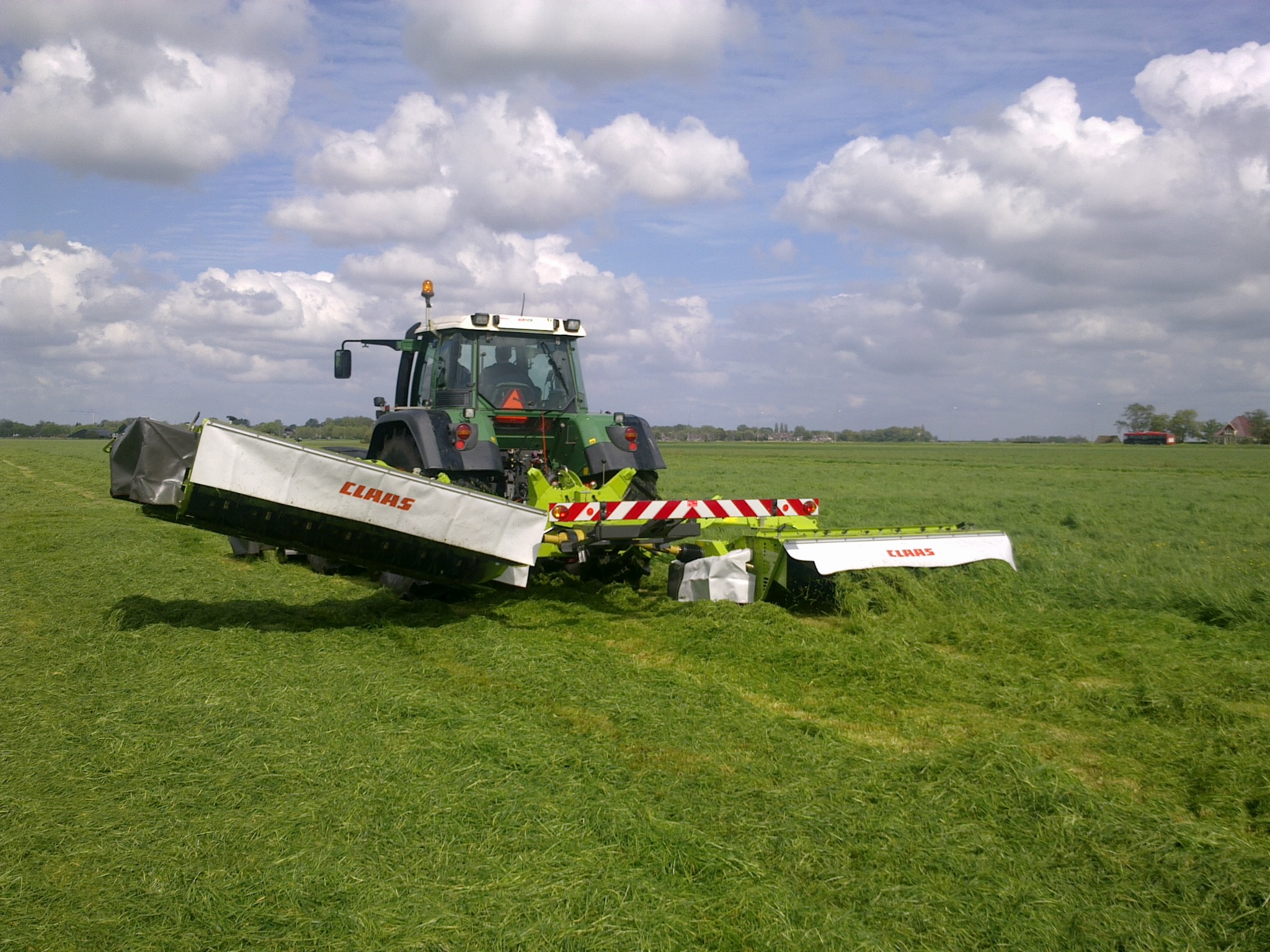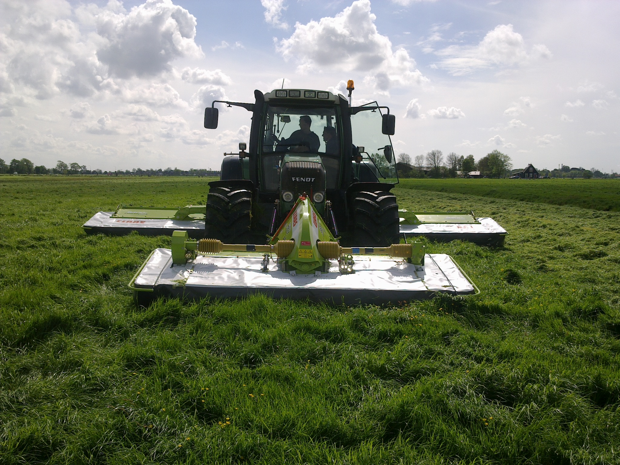 Veehouderijbedrijf Pronk in Broek in Waterland (NH) eindelijk het gras in met hun nieuwe Claas triplemaaier, deze vlindermaaier van het type Disco 8400C Contour, is uitgerust met breedspreidkneuzer en Active-float maaibalkontlasting.