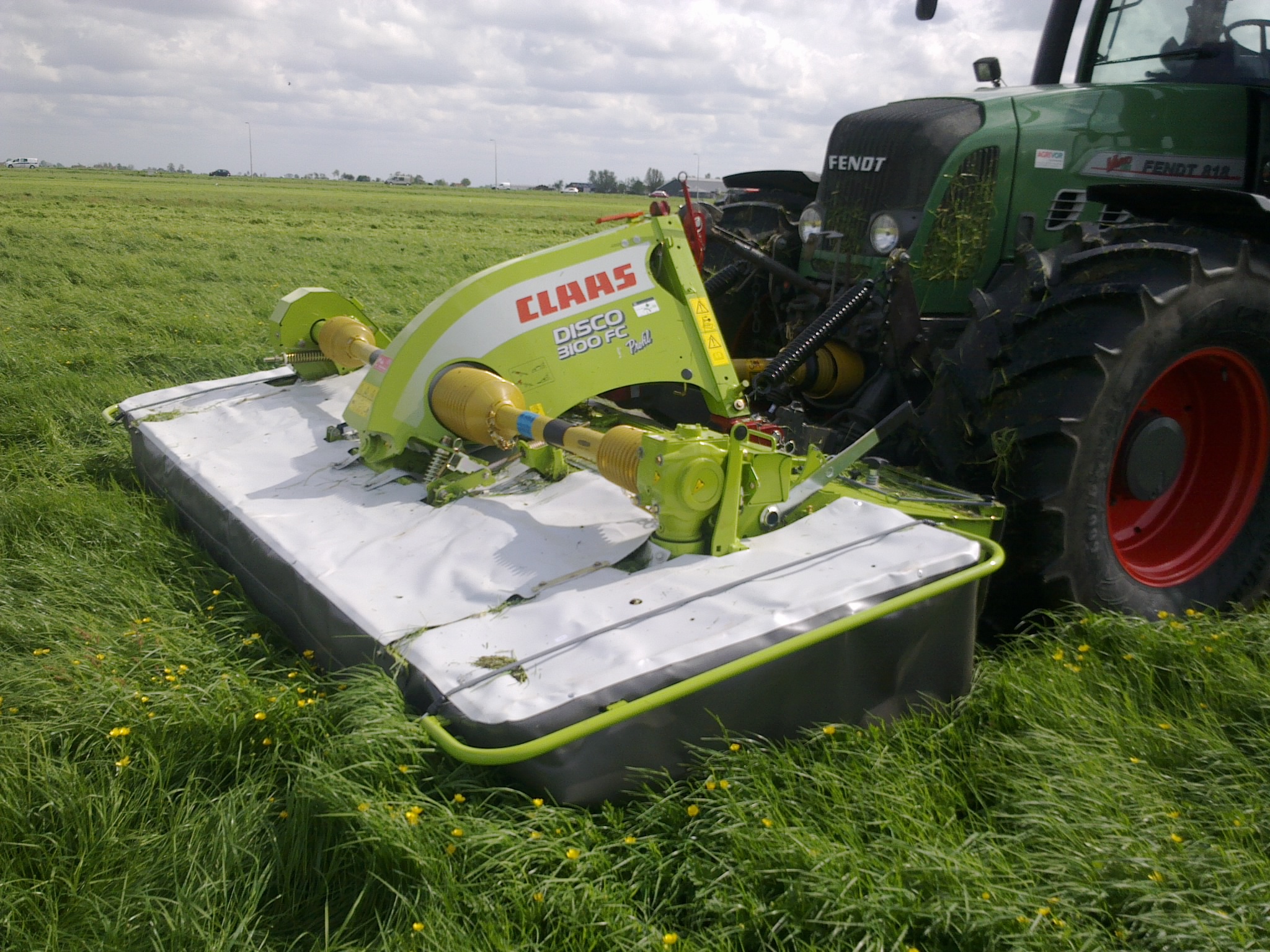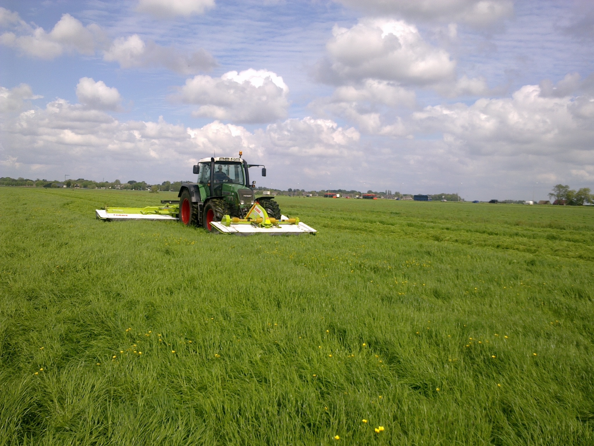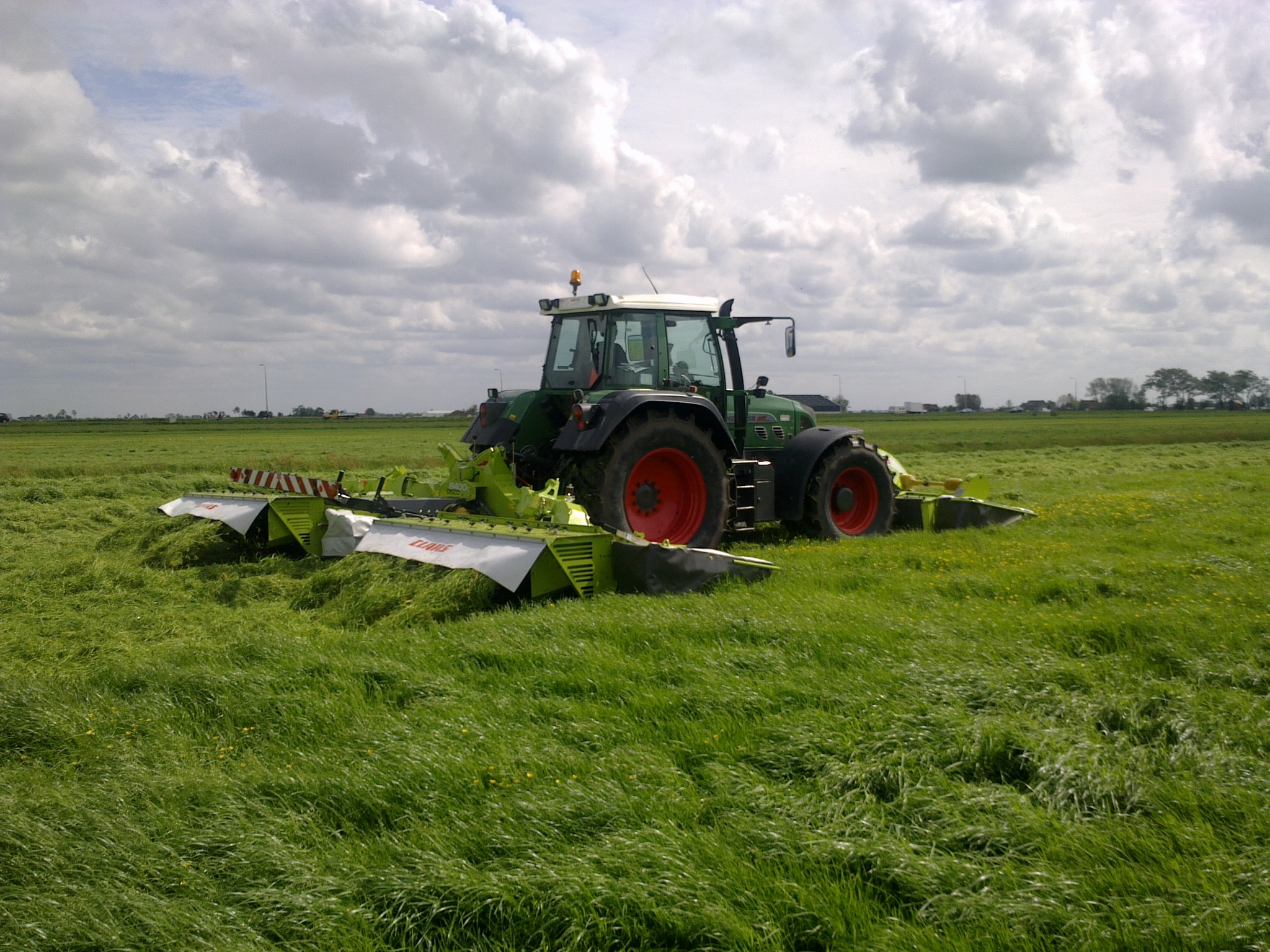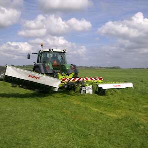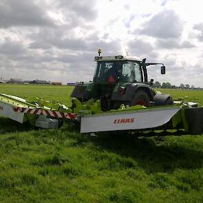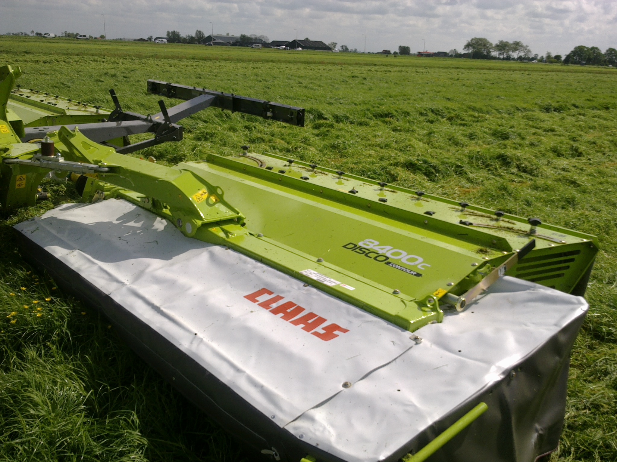 Veehouderijbedrijf Pronk in Broek in Waterland (NH) eindelijk het gras in met hun nieuwe Claas triplemaaier, deze vlindermaaier van het type Disco 8400C Contour, is uitgerust met breedspreidkneuzer en Active-float maaibalkontlasting.
