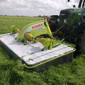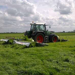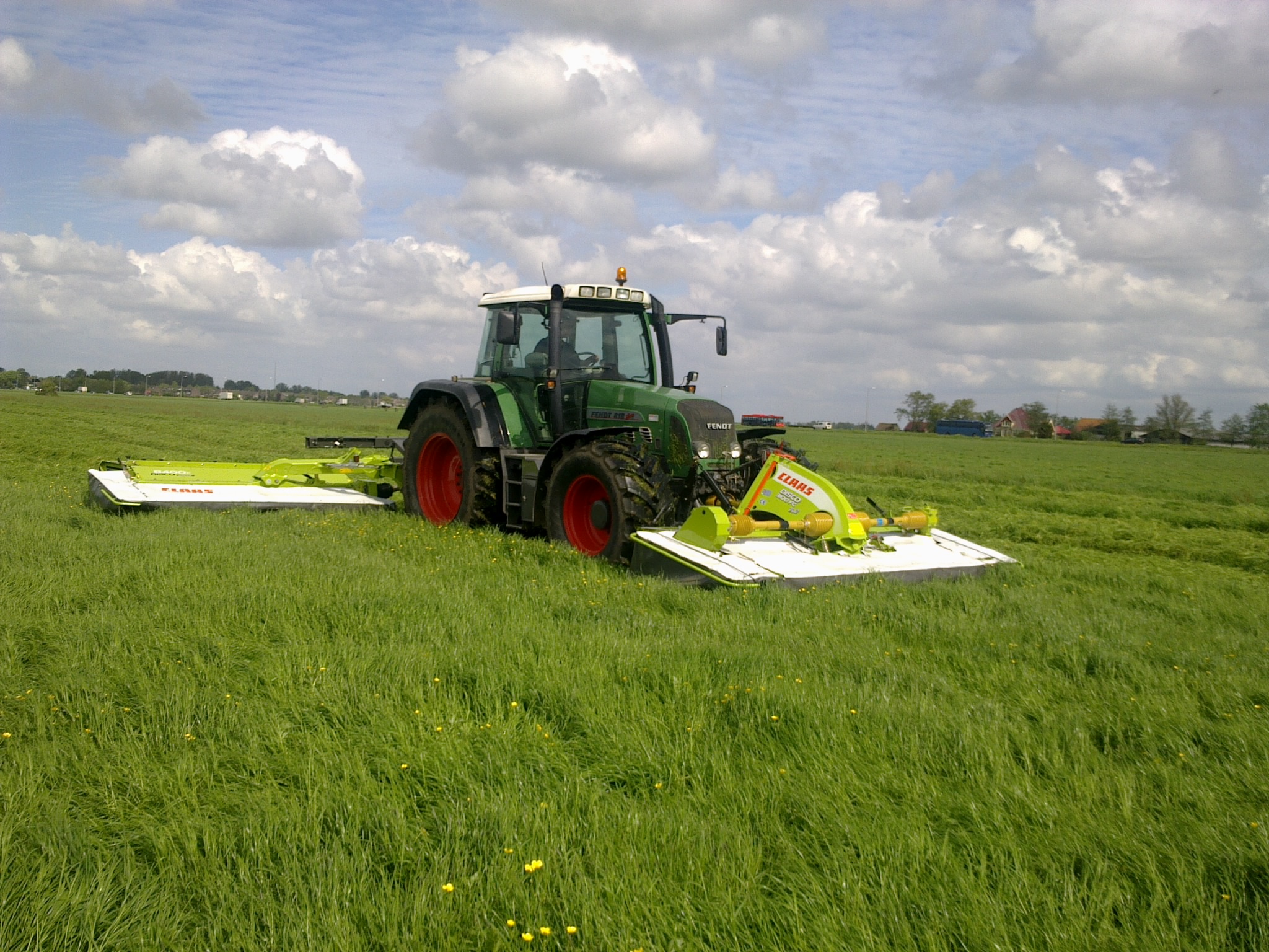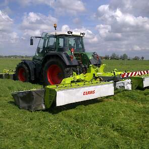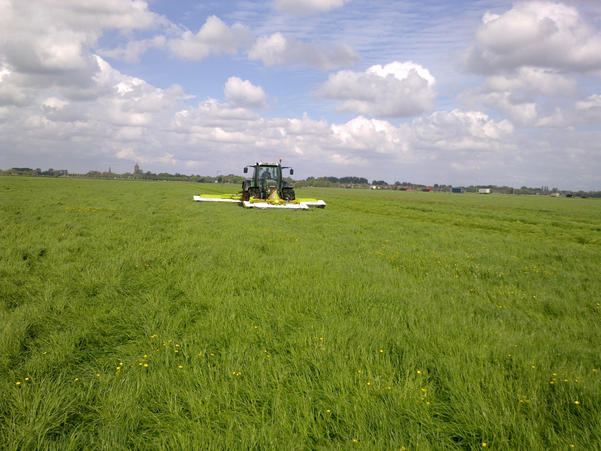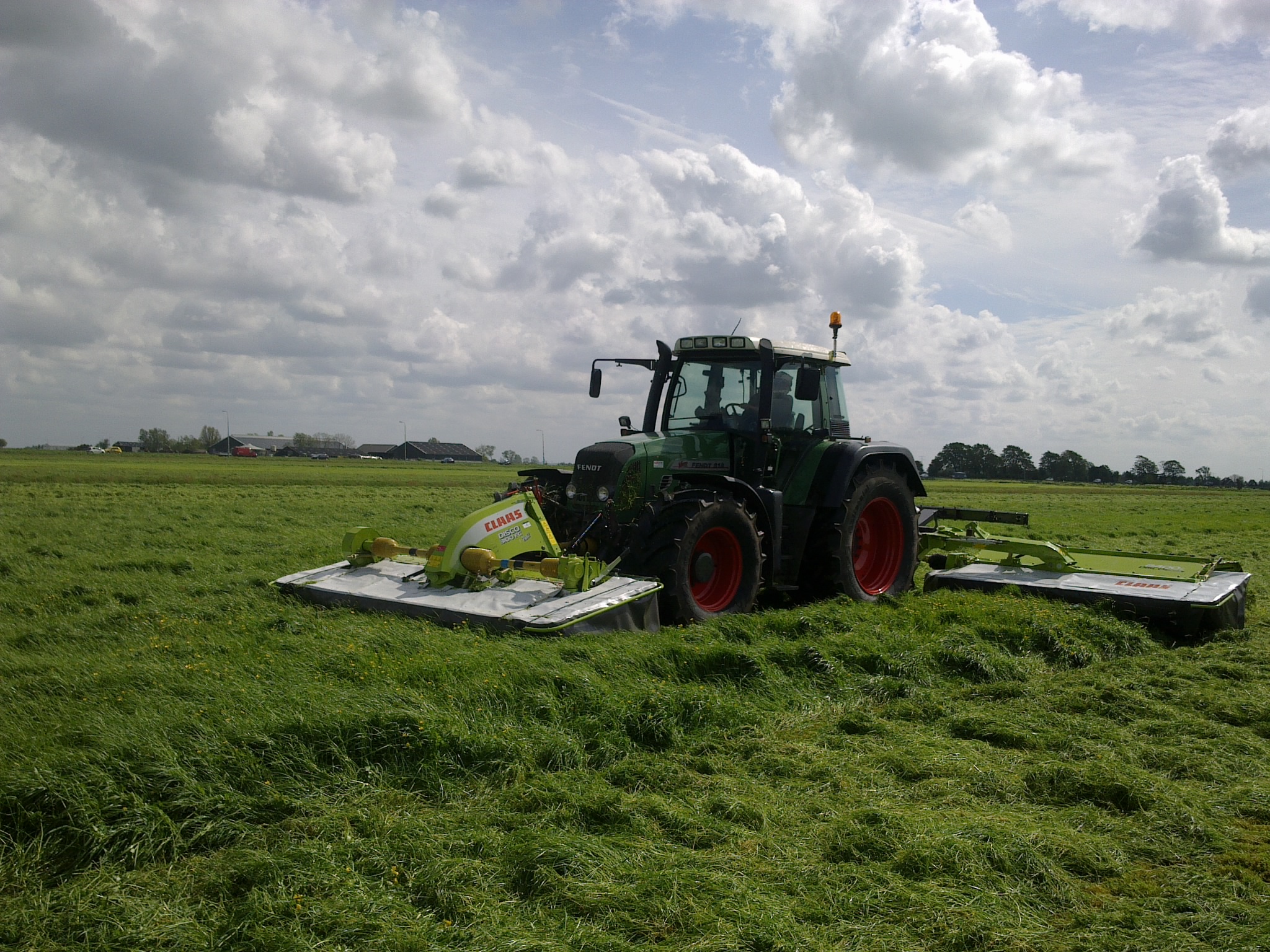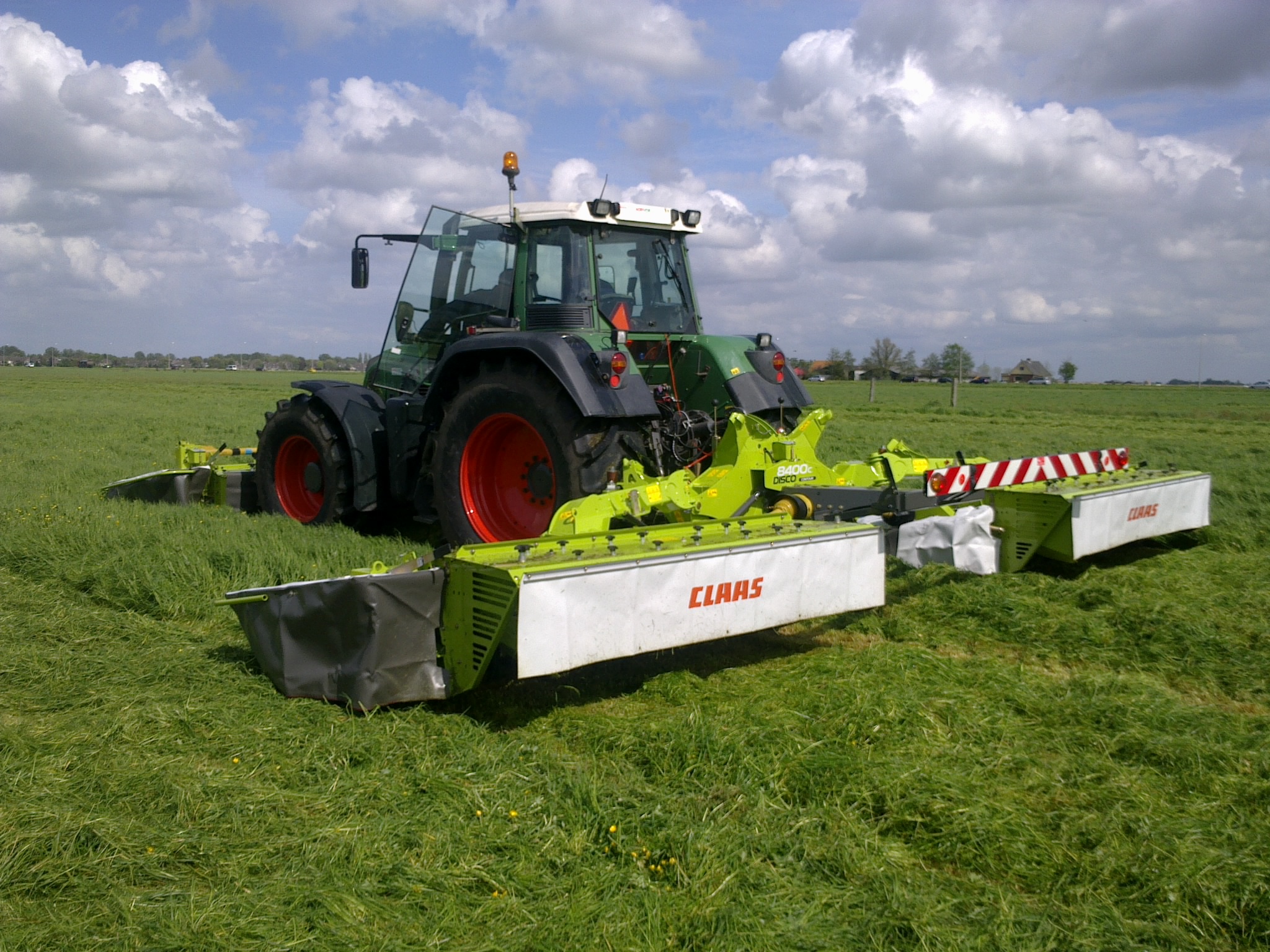 Veehouderijbedrijf Pronk in Broek in Waterland (NH) eindelijk het gras in met hun nieuwe Claas triplemaaier, deze vlindermaaier van het type Disco 8400C Contour, is uitgerust met breedspreidkneuzer en Active-float maaibalkontlasting.