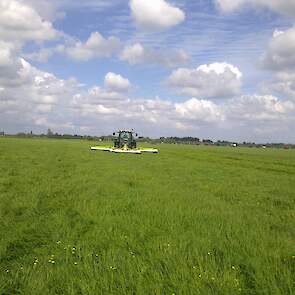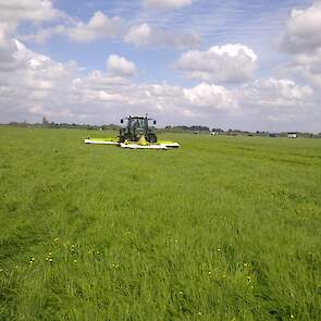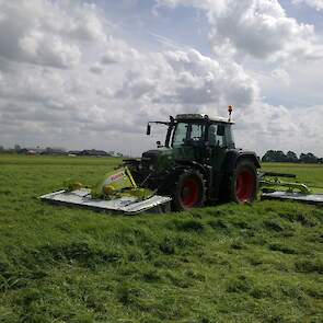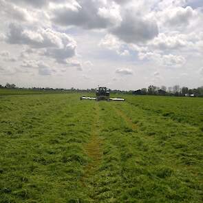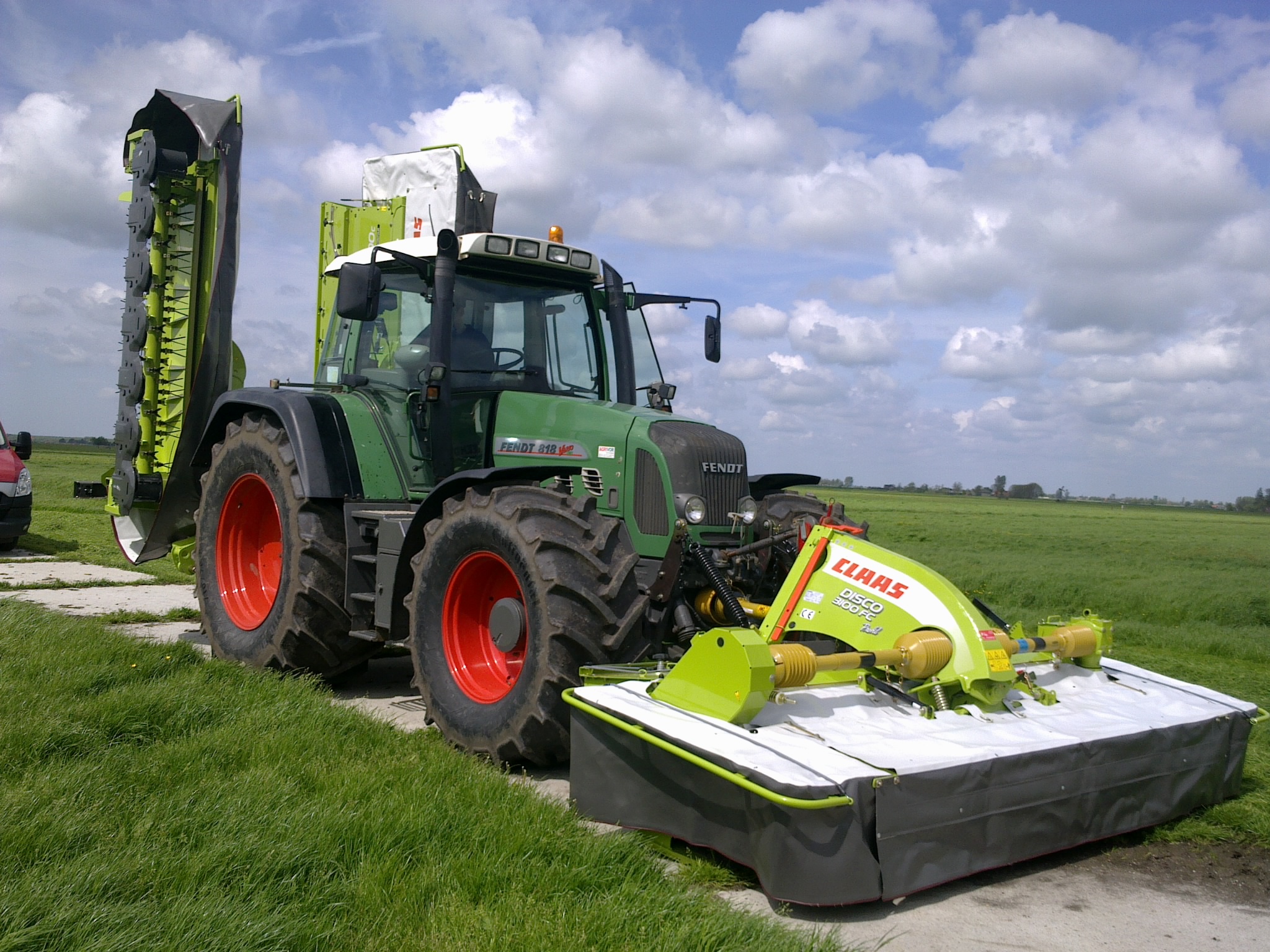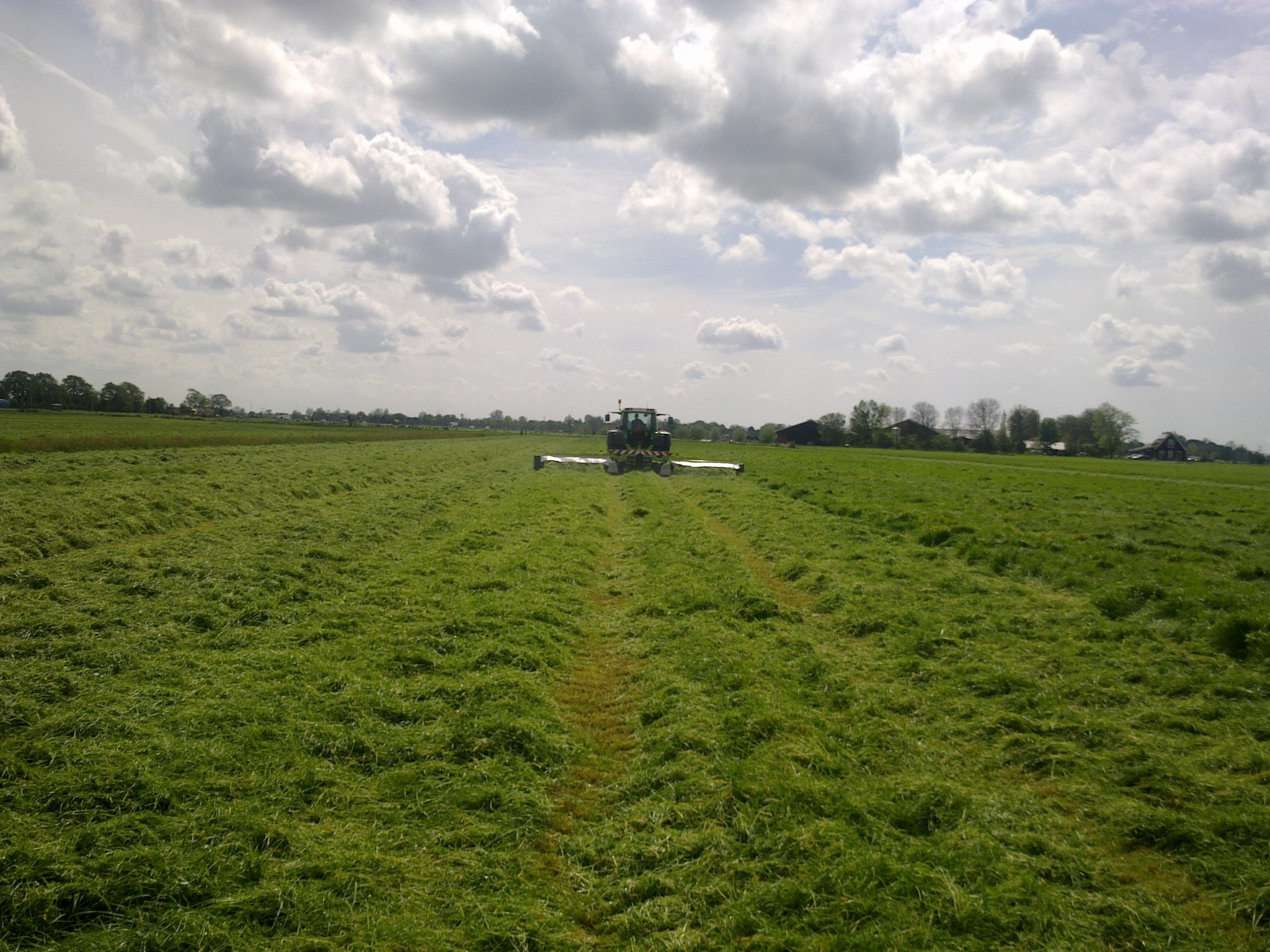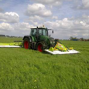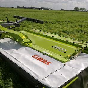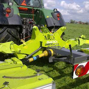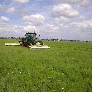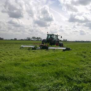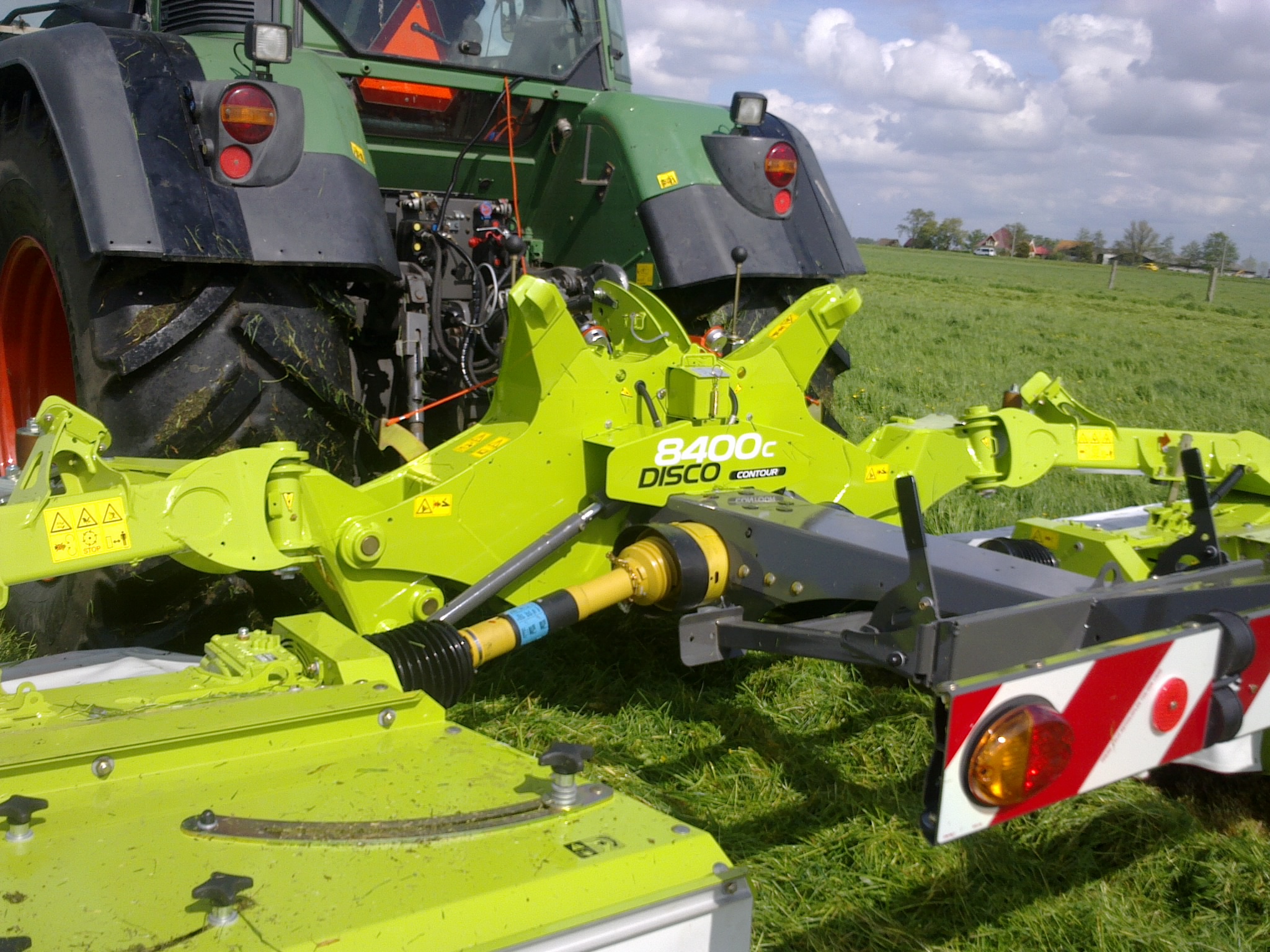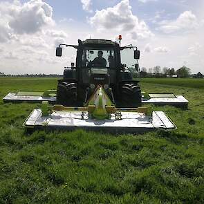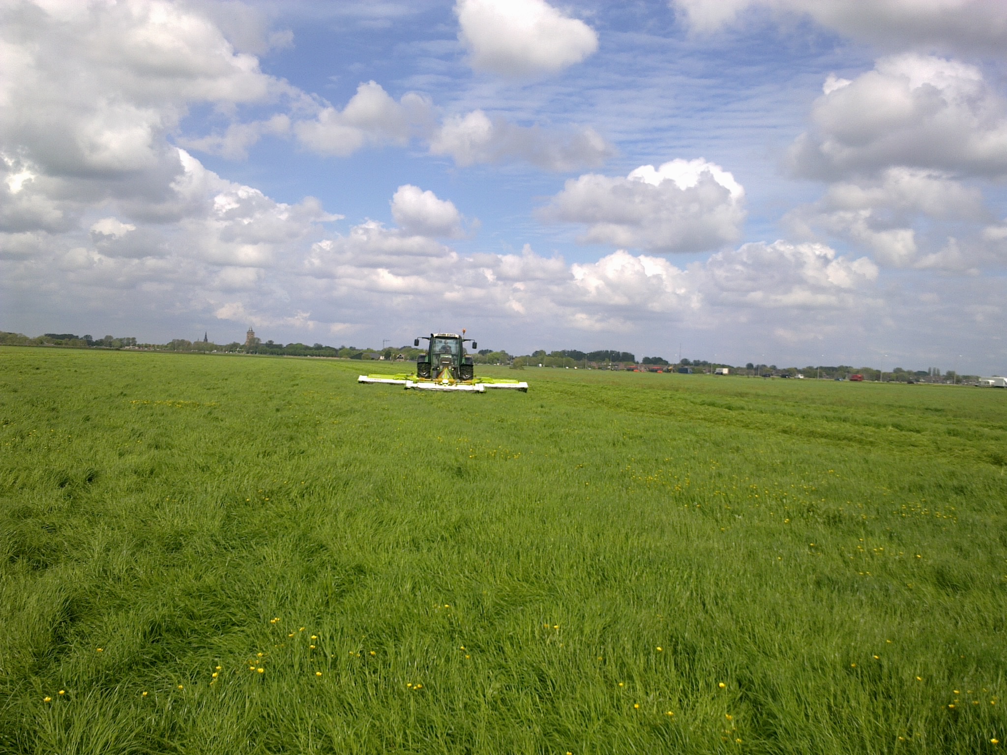 Veehouderijbedrijf Pronk in Broek in Waterland (NH) eindelijk het gras in met hun nieuwe Claas triplemaaier, deze vlindermaaier van het type Disco 8400C Contour, is uitgerust met breedspreidkneuzer en Active-float maaibalkontlasting.