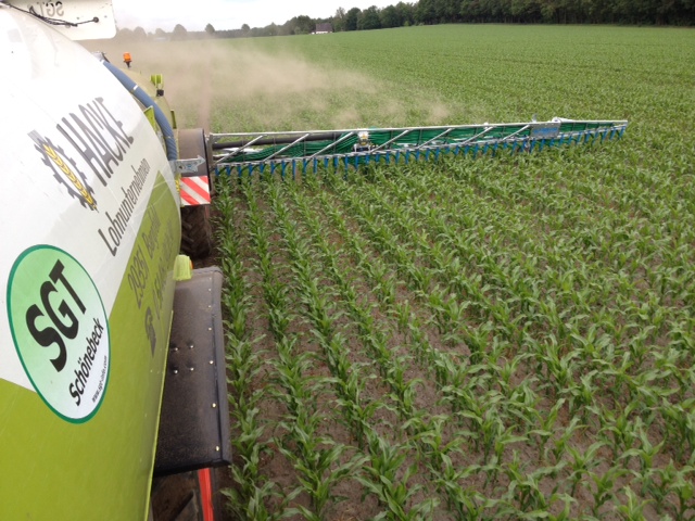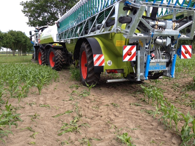 Meerdere Xerion gebruikers rijden op dit moment in staande mais om de mest op het juiste moment ter beschikking te stellen aan de mais. Een absolute capaciteits kanon is deze Xerion S TRACK met 24 mtr Bomech en 34 cbm inhoud met smalle banden en GPS sturing om exact door de rijen sturen te kunnen. De as van de tank is gestuurd voor minimale schade aan het mais bestand.