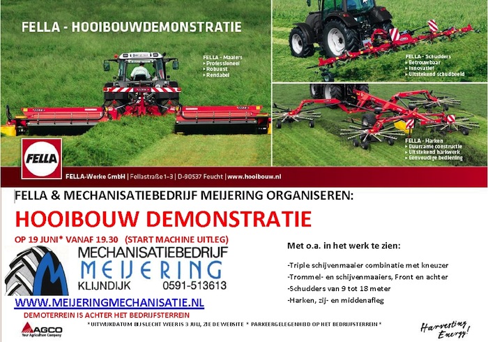 Fella en Mechanisatiebedrijf Meijering organiseren een hooibouwdemonstratie op dinsdag 19 Juni vanaf 19:30.