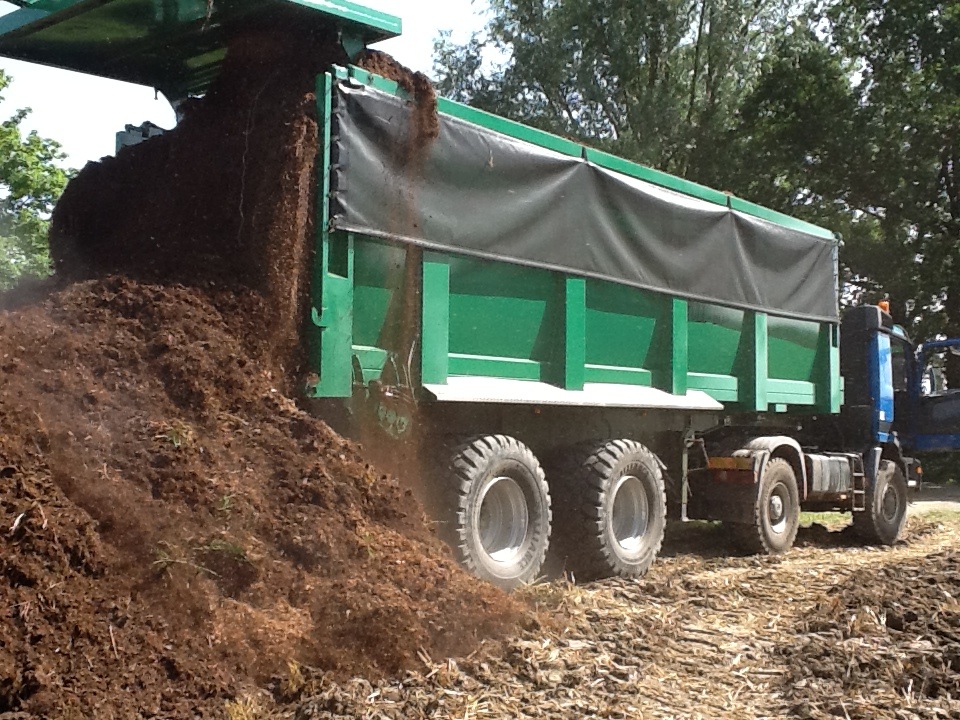 Geladen werd er met een schovel met hoogkiepbak paardenmest. Volgeladen zat er in de 56cbm bak ca 28-29 ton produkt wat in 70 sec afgeladen werd.