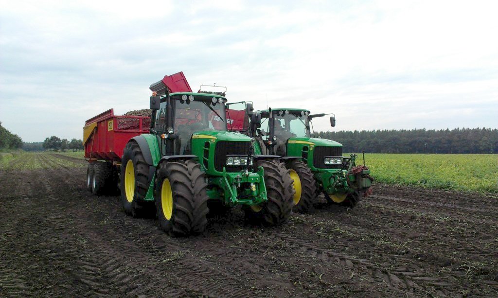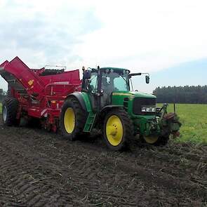 tevens kan deze rooier ook nog sturen met de gestuurde as.de foto's zijn genomen tijdens het zetmeelaardappelen rooien.voor de rooimachine staat een John Deere 6830 met cvt.
