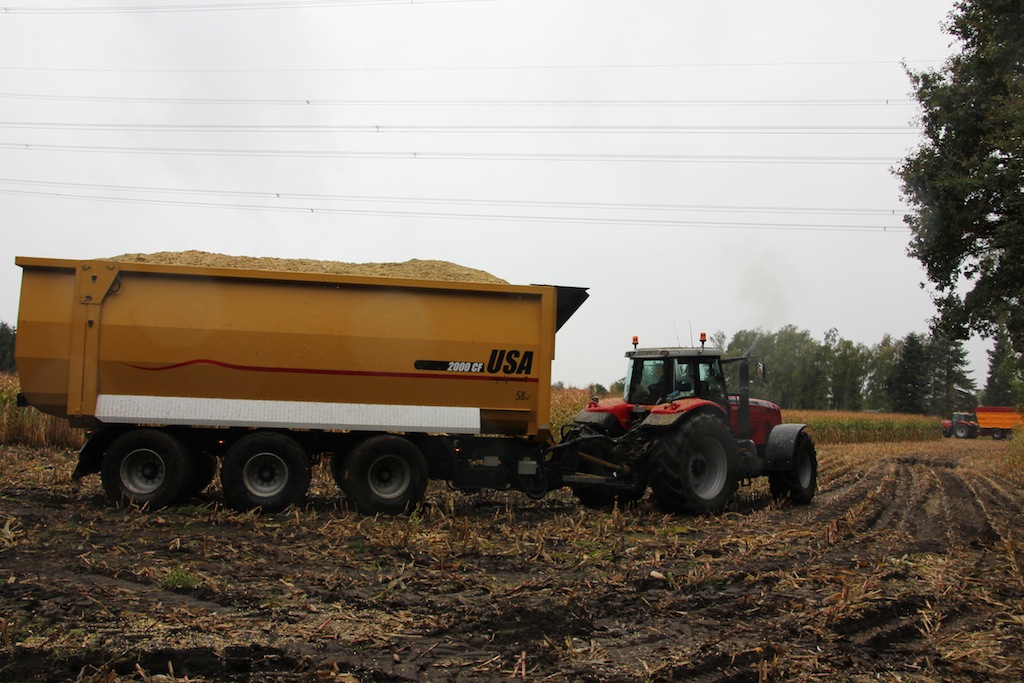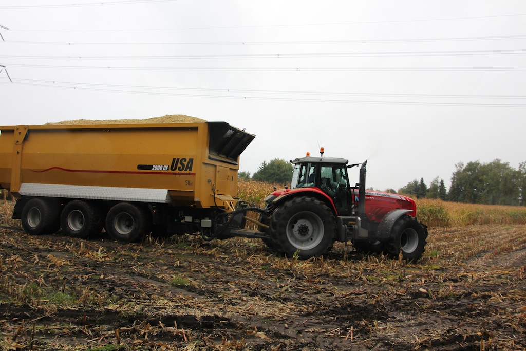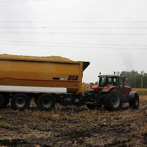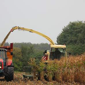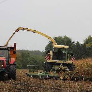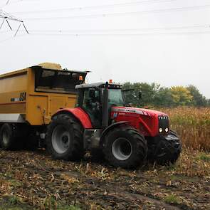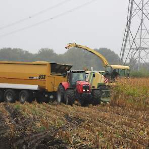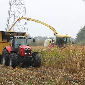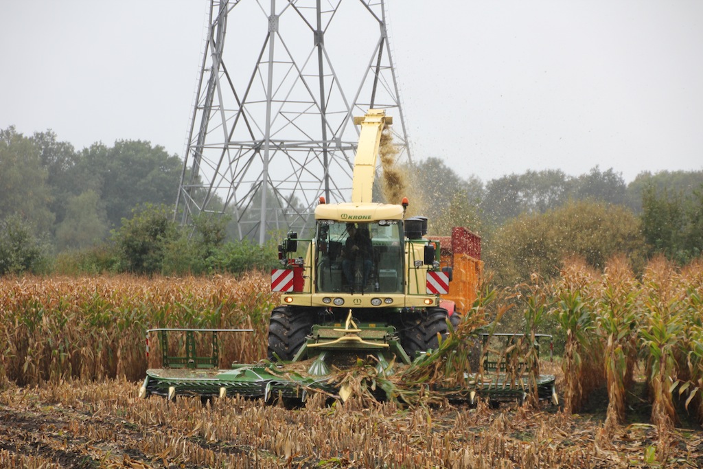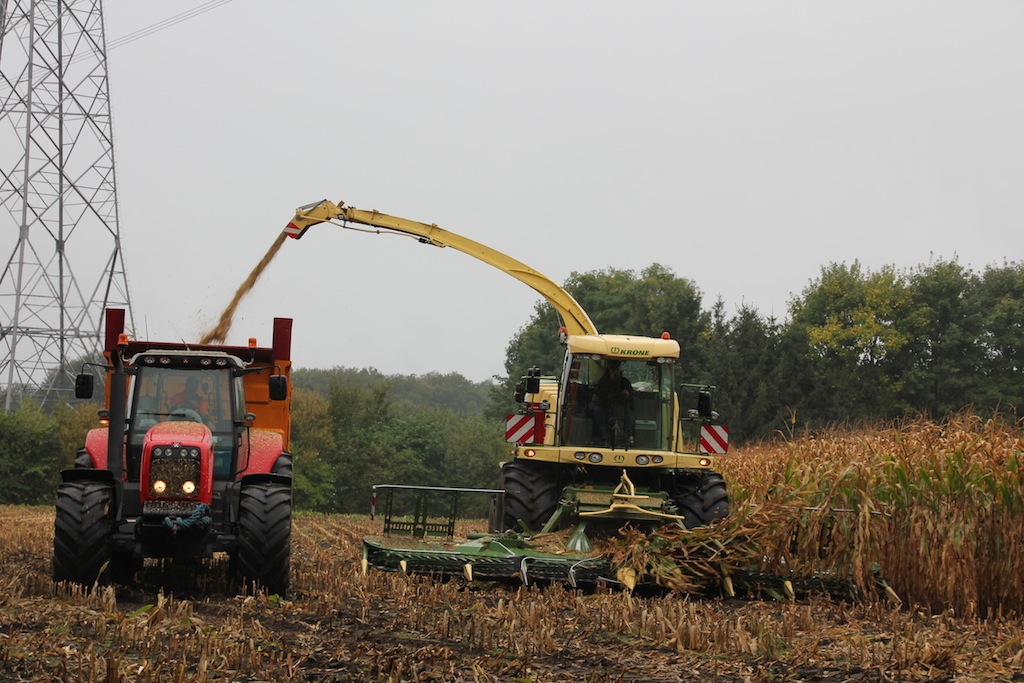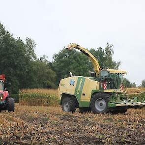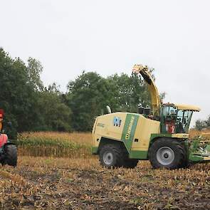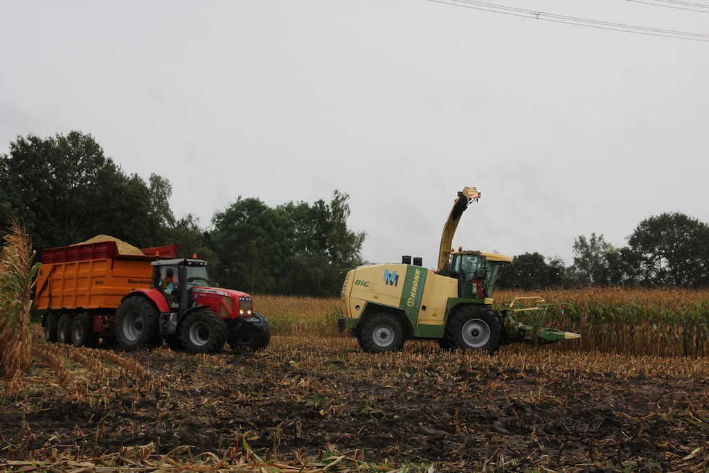 Mart Munsters in de mais in Peel en Maas (Grashoek) met Krone Big X 700 en Massey Ferguson 7495 met Veenhuis silagewagen.